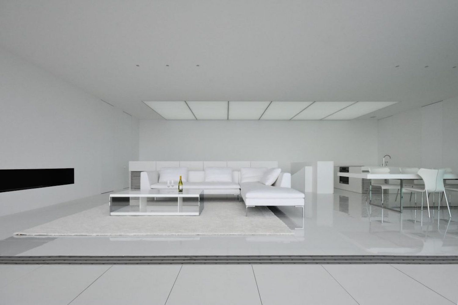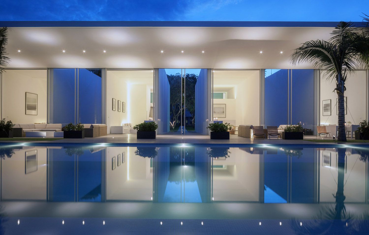 Each cube is connected to a patio of 264 square meters with palm trees, a common living room where the family can have dinner, thanks to a long table made to accommodate at least 16 people, can sunbathe or swim in the pool.