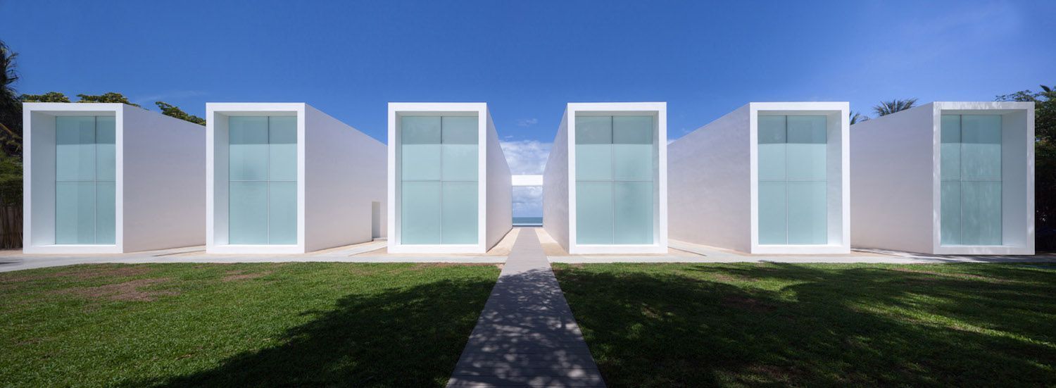 Located in the tourist area of Hua Hin, a seaside resort just three hours drive south of Bangkok, the building occupies an elongated site with a width of 50 meters and a length of 300 meters from the main road leading to white sandy beach. The house is built in concrete and is divided into six cubic spaces, one for each family member, 4 m high and 20 m in length.