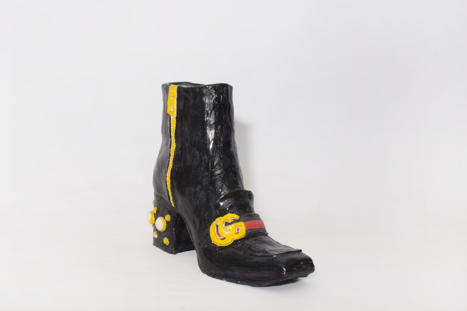 It depends on the size and amount of detail but a “to scale” shoe normally takes about 2-3 hours to sculpt. The sculpted piece then takes a few days to dry. After that then I glaze it and it goes into the kiln to be heated.