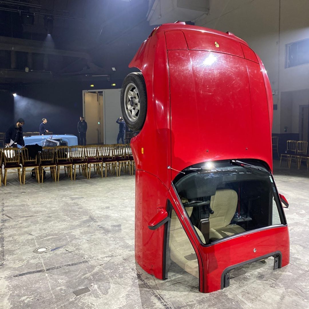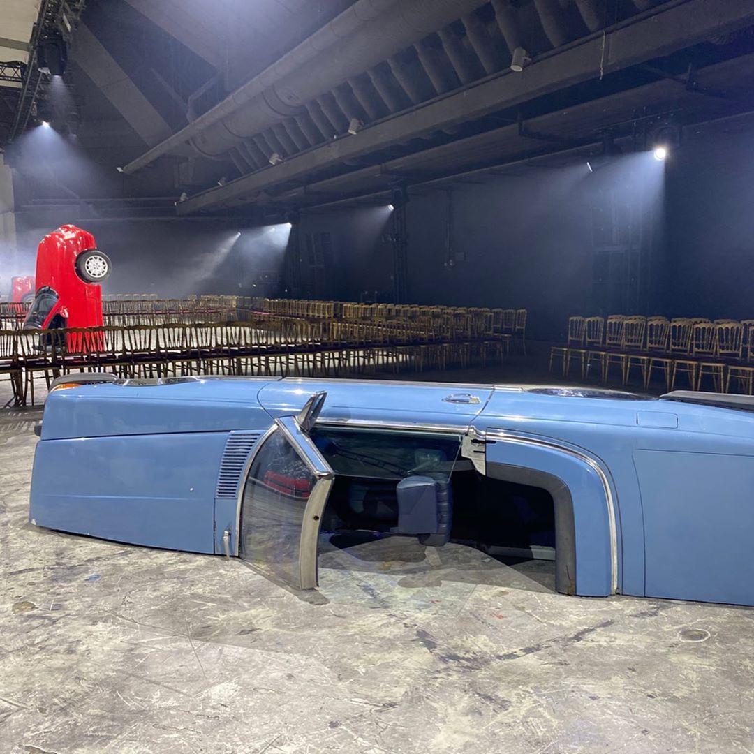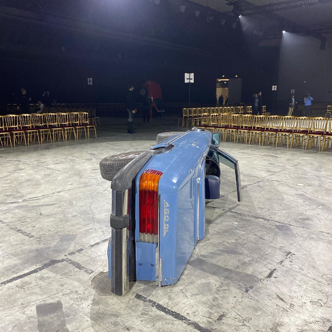 The runway show for Off-White™'s FW20 Womanswear collection yesterday brought to the catwalk, in addition to the new Off-White™ x Air Jordan 4, a series of asymmetrical looks in which two halves of completely different garments were stitched together. The strange and surreal theme of the object split in half was also replicated thematically on the set of the show, made in collaboration with the French workshop L'Art de l'Automobile, which saw five Porsche 924s, four red and a blue one, cut each other for wide and long and laid on the ground as if they emerged from the floor. By transforming cars into real installations, Abloh realized the philosophy of L'Art de l'Automobile and its founder Arthur Kar that motoring, as a fusion of design and mechanics, can be approached as a true artistic discipline.