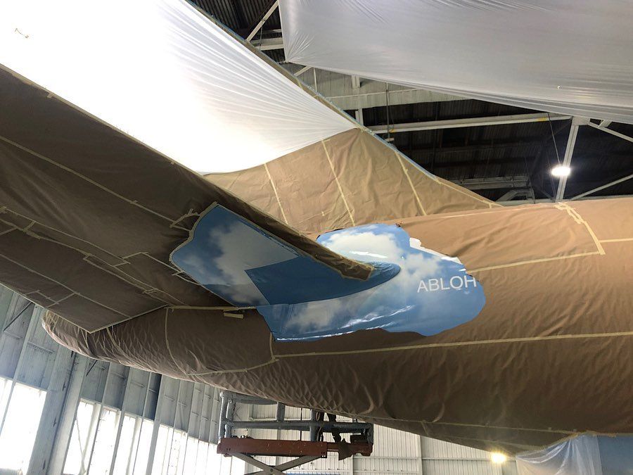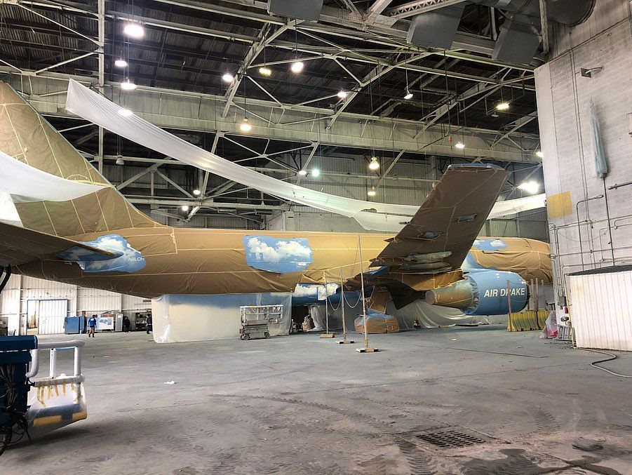 In addition to presenting the branding of Cargojet and OVO, the inscription "Air Drake" is printed on the engines while Abloh (who has a degree in civil engineering) has left his signature on the sides of the fuselage in his usual industrial style, with the inscription "c/o ABLOH ENGINEERING®". Abloh himself, however, in presenting the photos of the jet appeared aware of the problems that an aircraft of the same colour as the sky presents – not least the tail number of the aircraft, which is not readable given the colour of the fuselage, and fixed-based operator, that is, the airport service centre that provides equipment and facilities for air traffic, from the reception of passengers, to ground services for as well as the sale of fuel.