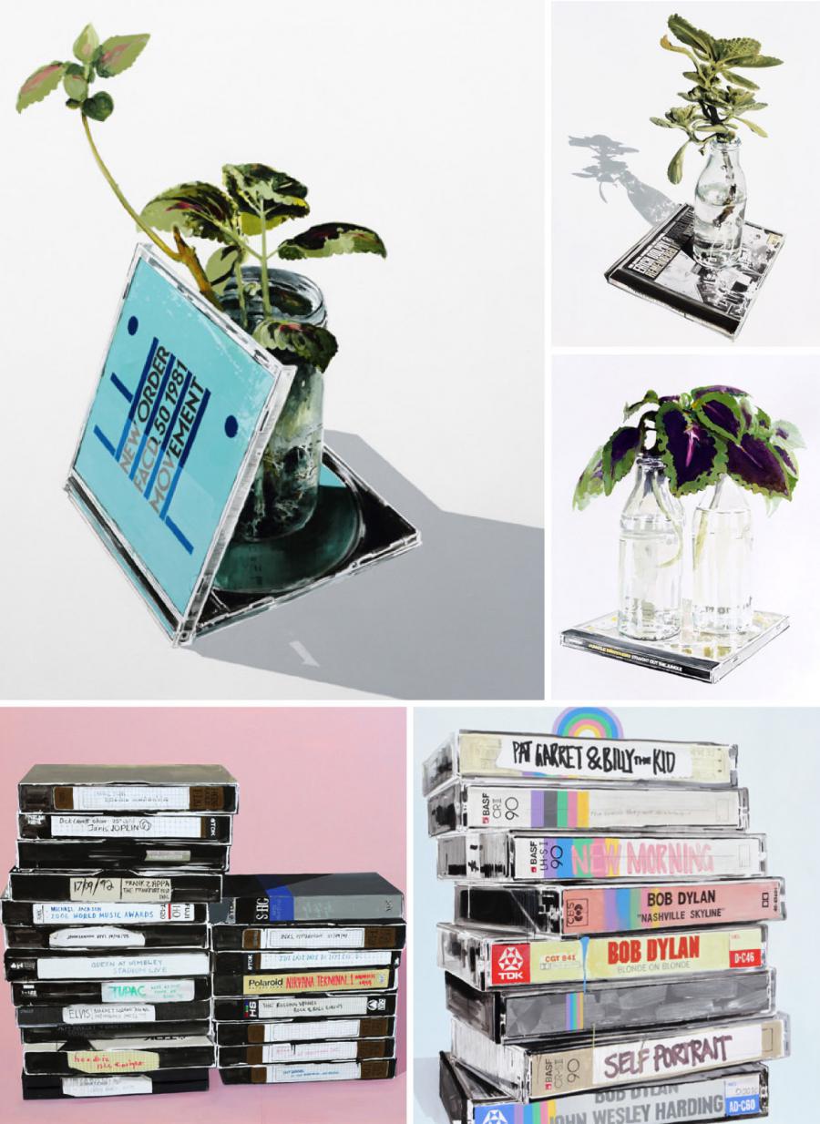 Dal canto suo, va matto per tutti quegli oggetti obsoleti che ormai odorano di polvere: vhs, musicassette, cd, vinili, tastiere e sintetizzatori anni '80, enormi tv con manopole laterali. E da un paio d'anni a questa parte ha decido di realizzare degli still life di romantico impatto raffigurando questi prodotti su tela o su pannelli d'alluminio, con tempere o colori acrilici.