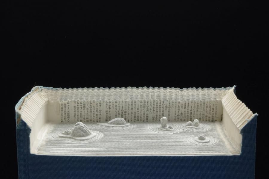 The artist Guy Laramee has worked as a stage writer, director, composer, a fabricator of musical instruments, a singer, sculptor, painter and writer. Among his sculptural works are two incredible series of carved book landscapes and structures entitled Biblios and The Great Wall, where the dense pages of old books are excavated to reveal serene mountains, plateaus, and ancient structures.