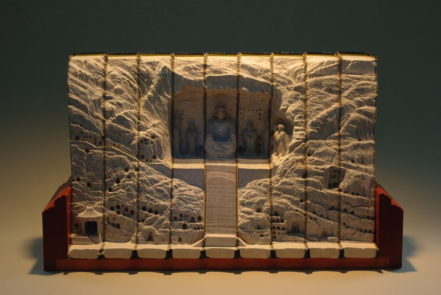 Guy Laramee non è un comune artista. E' uno sceneggiatore teatrale, regista, compositore, produttore di strumenti musicali, cantante, scultore, pittore e dulcis in fundo scrittore. Oggi nss vi segnala uno dei suoi ultimi lavori, ovvero delle opere scultoree di incredibile manifattura. Paesaggi ben noti scavati su libri antichi e enciclopedie in disuso, figure definite di montagne, muraglia cinese, altopiani, si innalzano o si scavano in queste composizioni, degne di nota. Finalmente mucchi di libri ritornano ad essere utili…