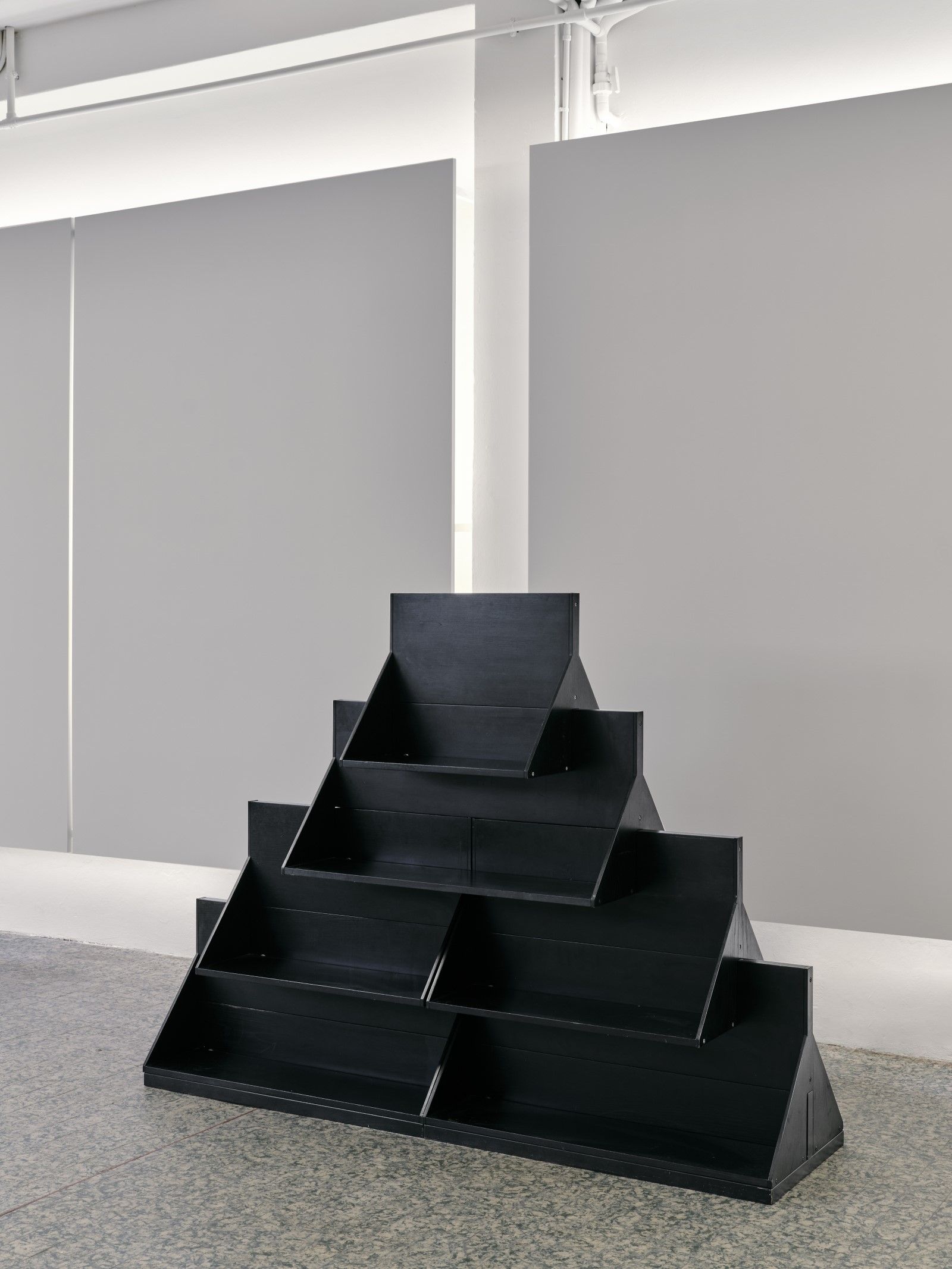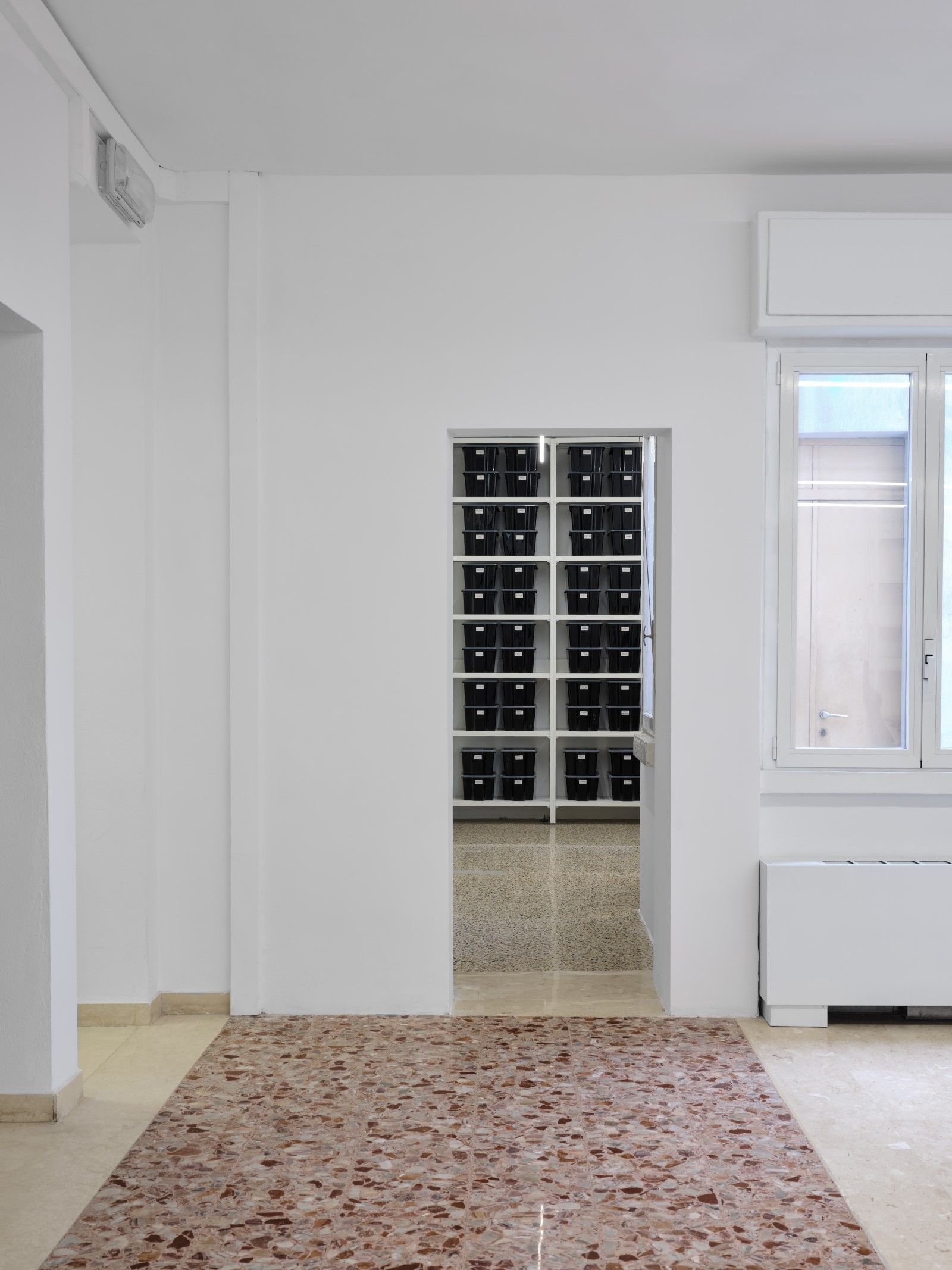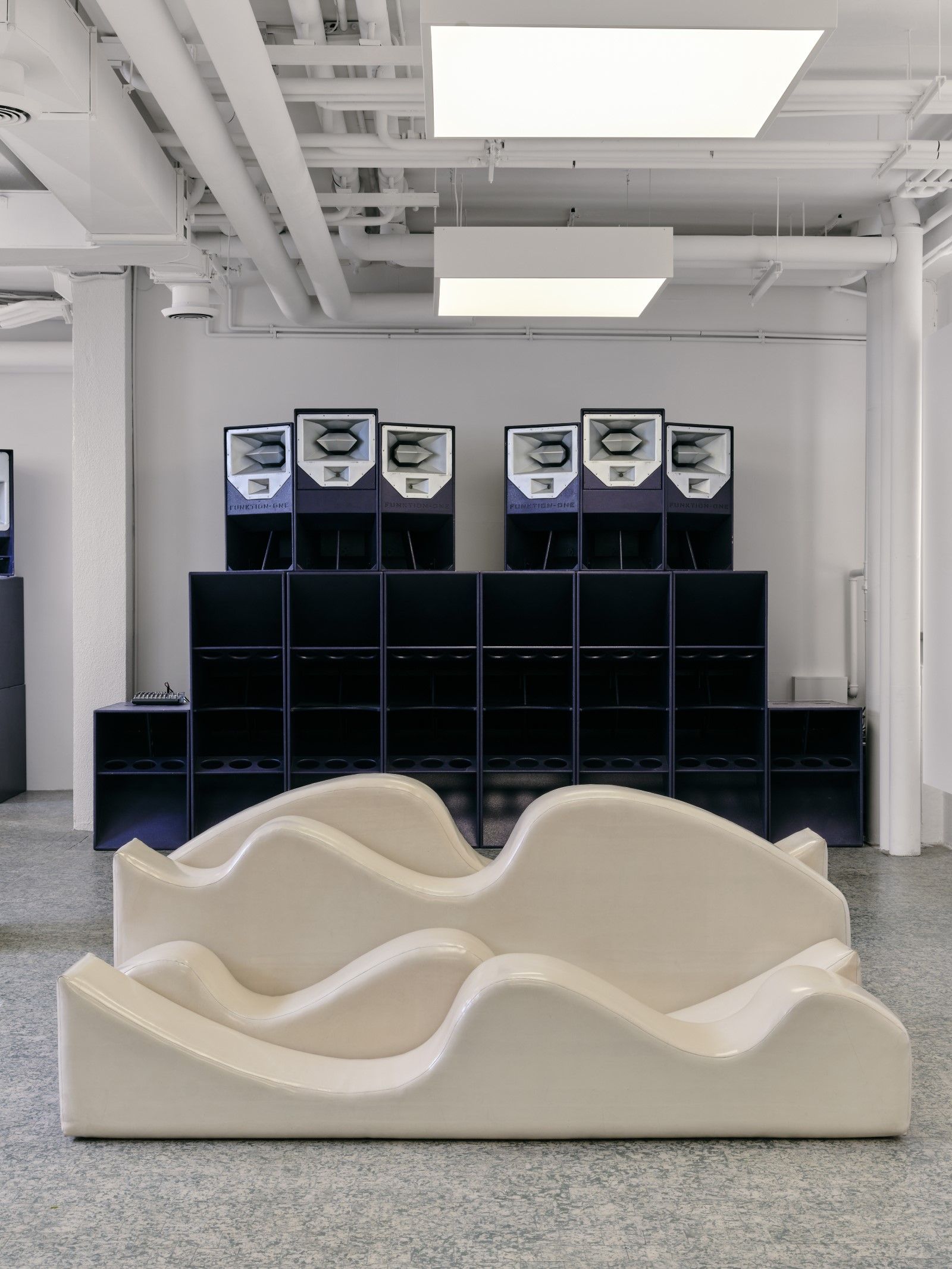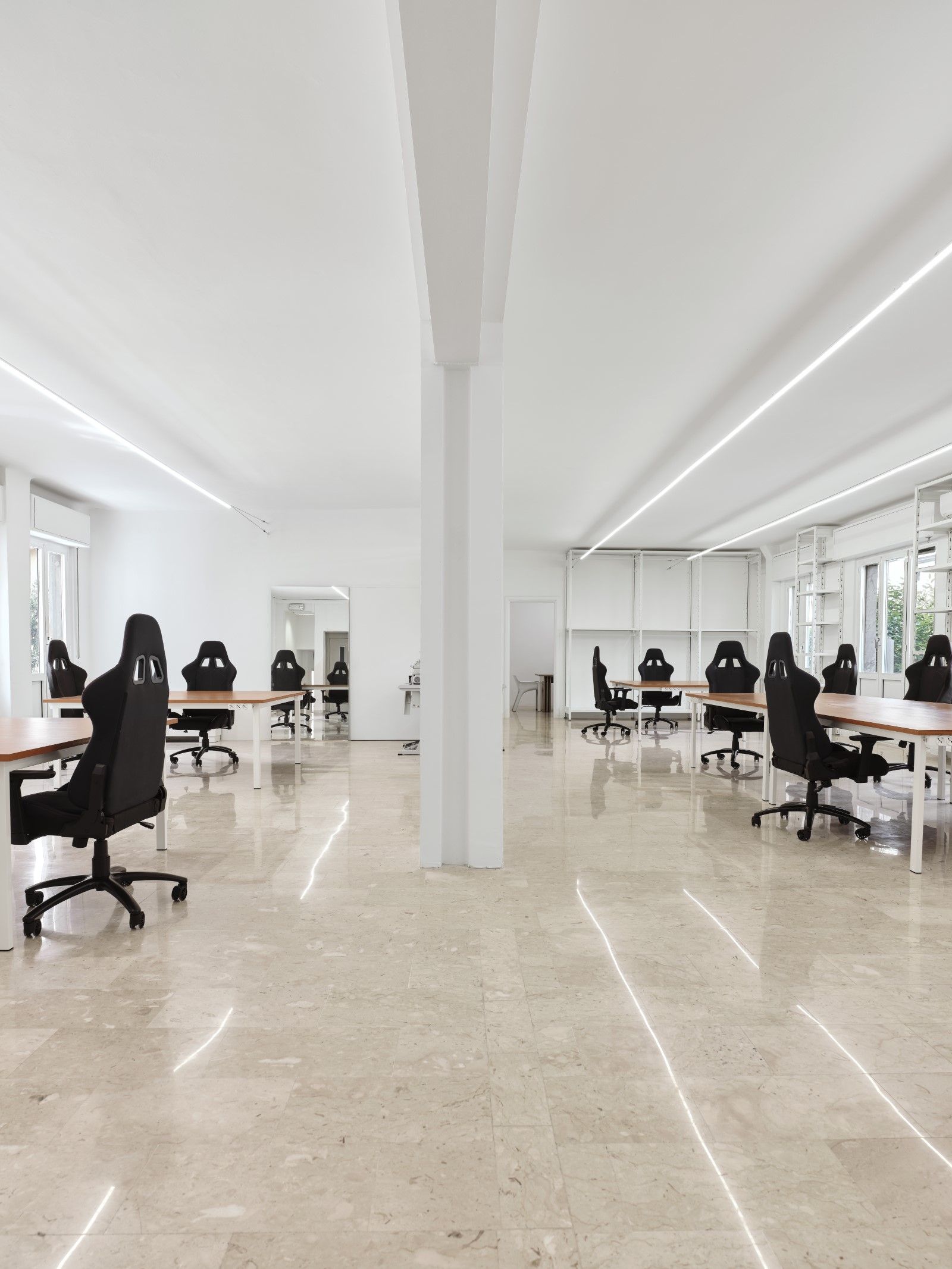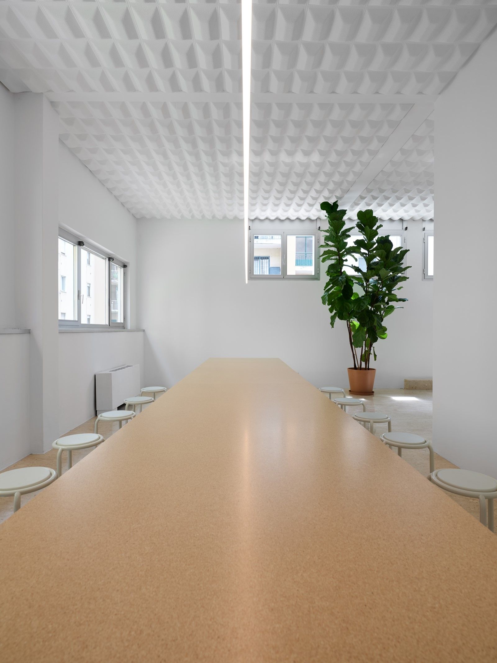 The two spaces, previously separated, are joined by an elevator that opens on two sides. Entering from the showroom in the new area, there is a wall of Funktion-One speakers on its left while the room is decorated with Poltronova's Superonda sofa and the QUATOR wooden table designed by Carlo in front of Ugo La Pietra's Uno Sull'Altro bookshelf. The three pieces, together with the Globo Tissurato lamp located in the meeting room upstairs, were provided by the Vaspaar design showroom, specialized design collectibles of the 20th century. The canteen area, equipped with a modular kitchen by Very Simple Kitchen and the showroom, are also united by a series of Champ Stools chairs, designed by Visibility for the American studio Matter Made.