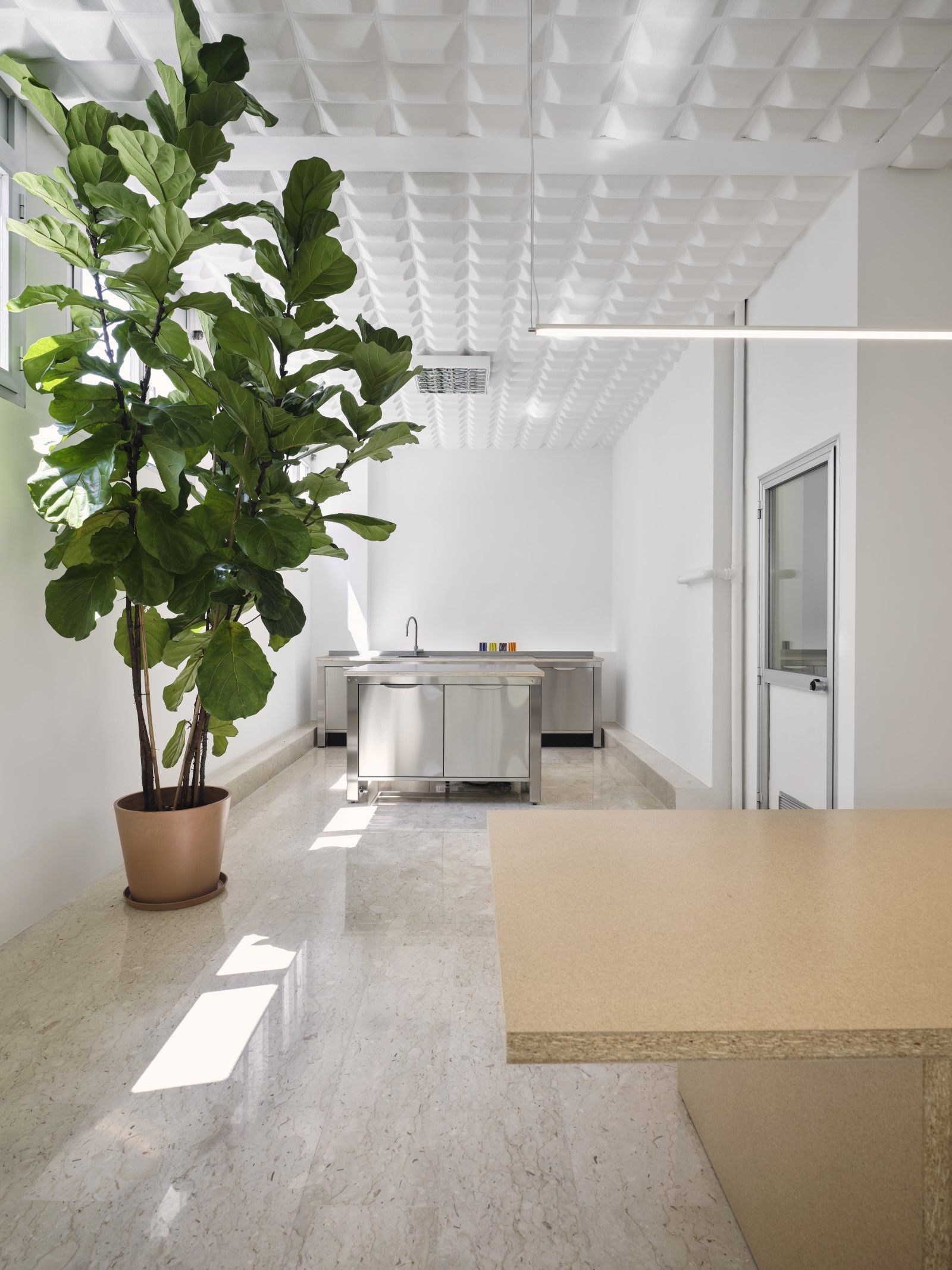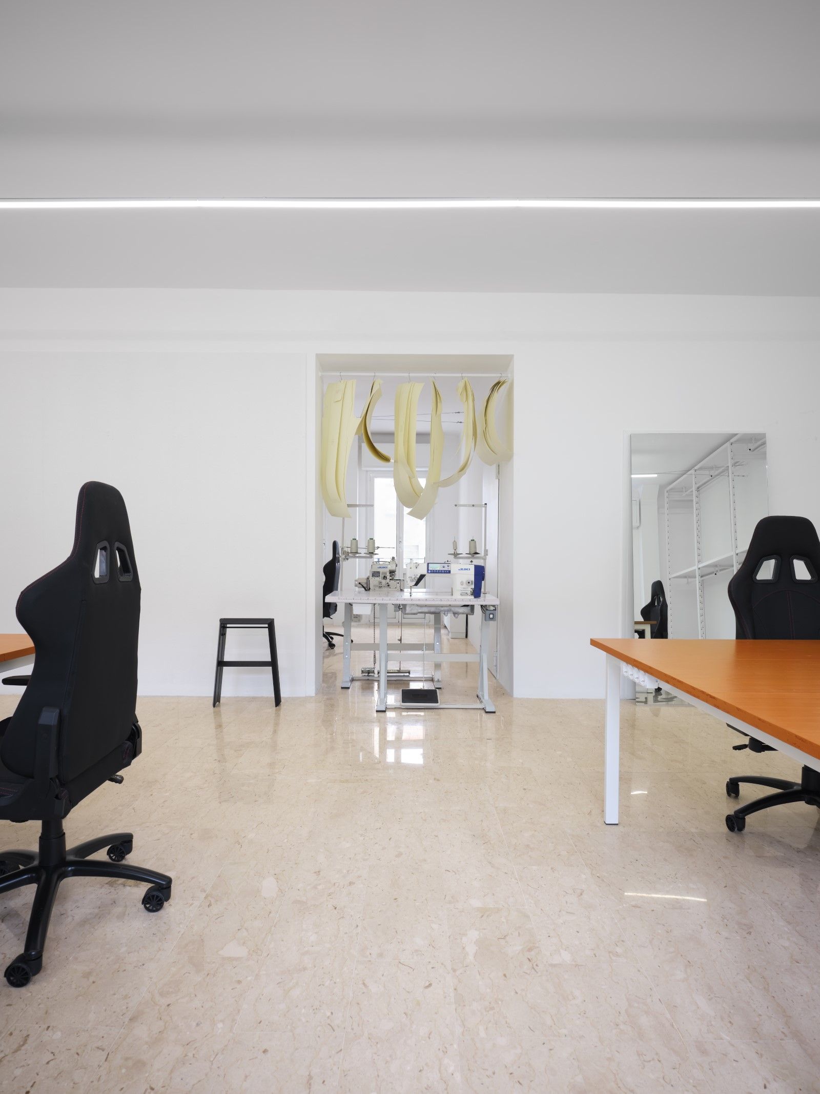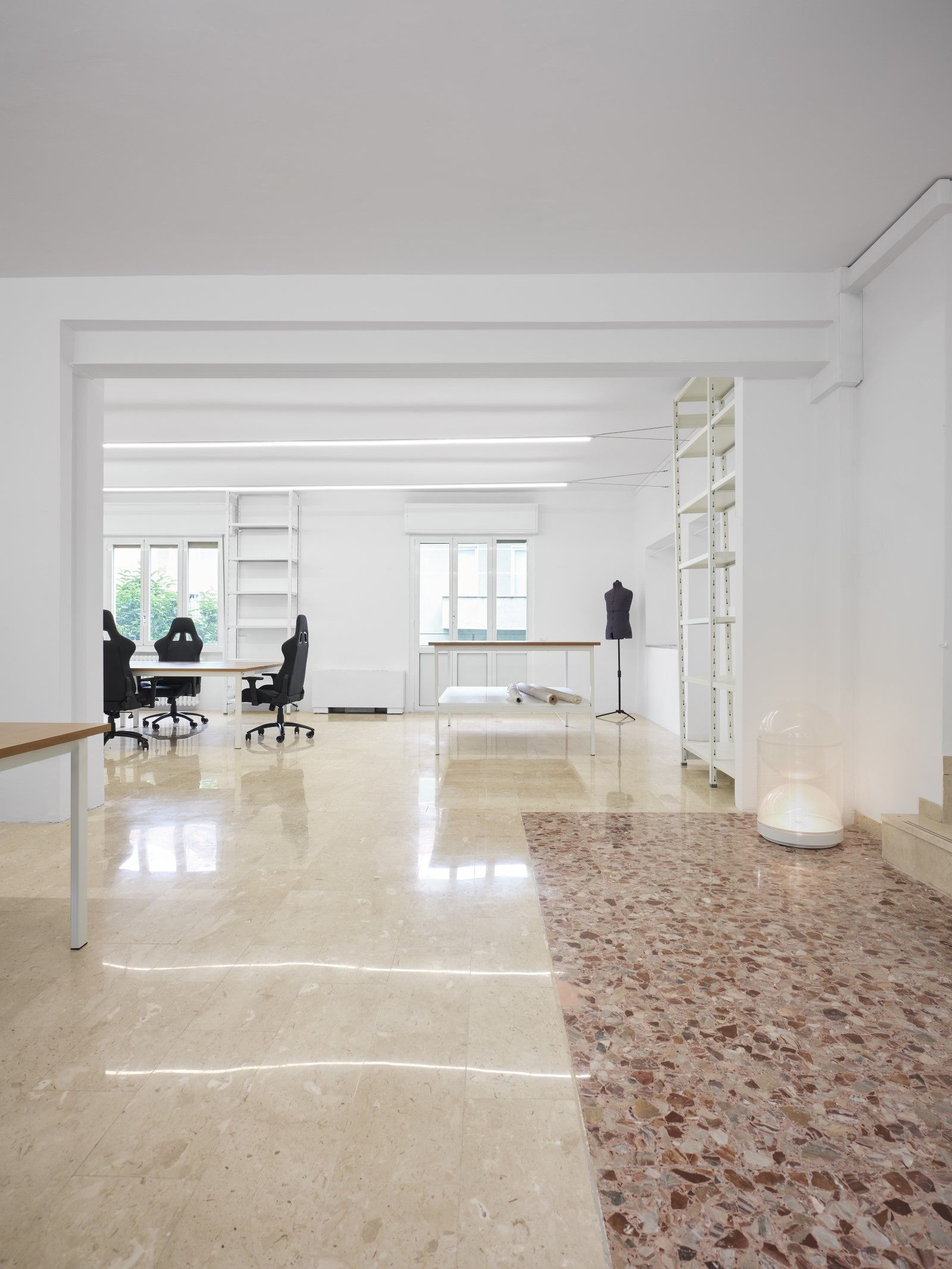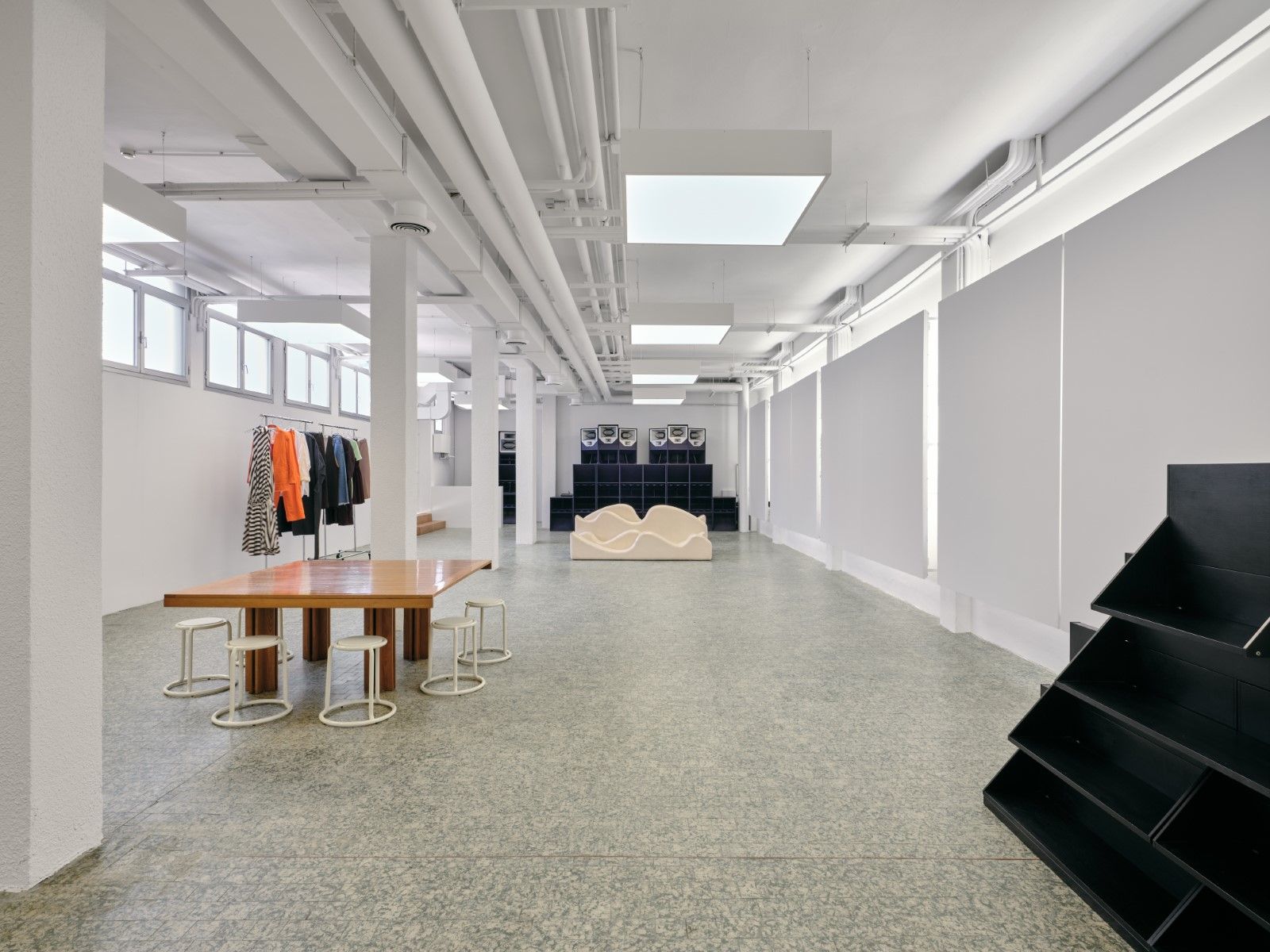 The building this is the name of the new space designed by Studio Mare, follows, like the original core of the brand's headquarters, an idea of simple and minimal design, which welcomes the design and furnishing works signed by the creative community that surrounds the brand and for this reason approaches a real creative hub that represents both the aesthetics of Sunnei himself and the personality of his many friends & family who inspire his work.