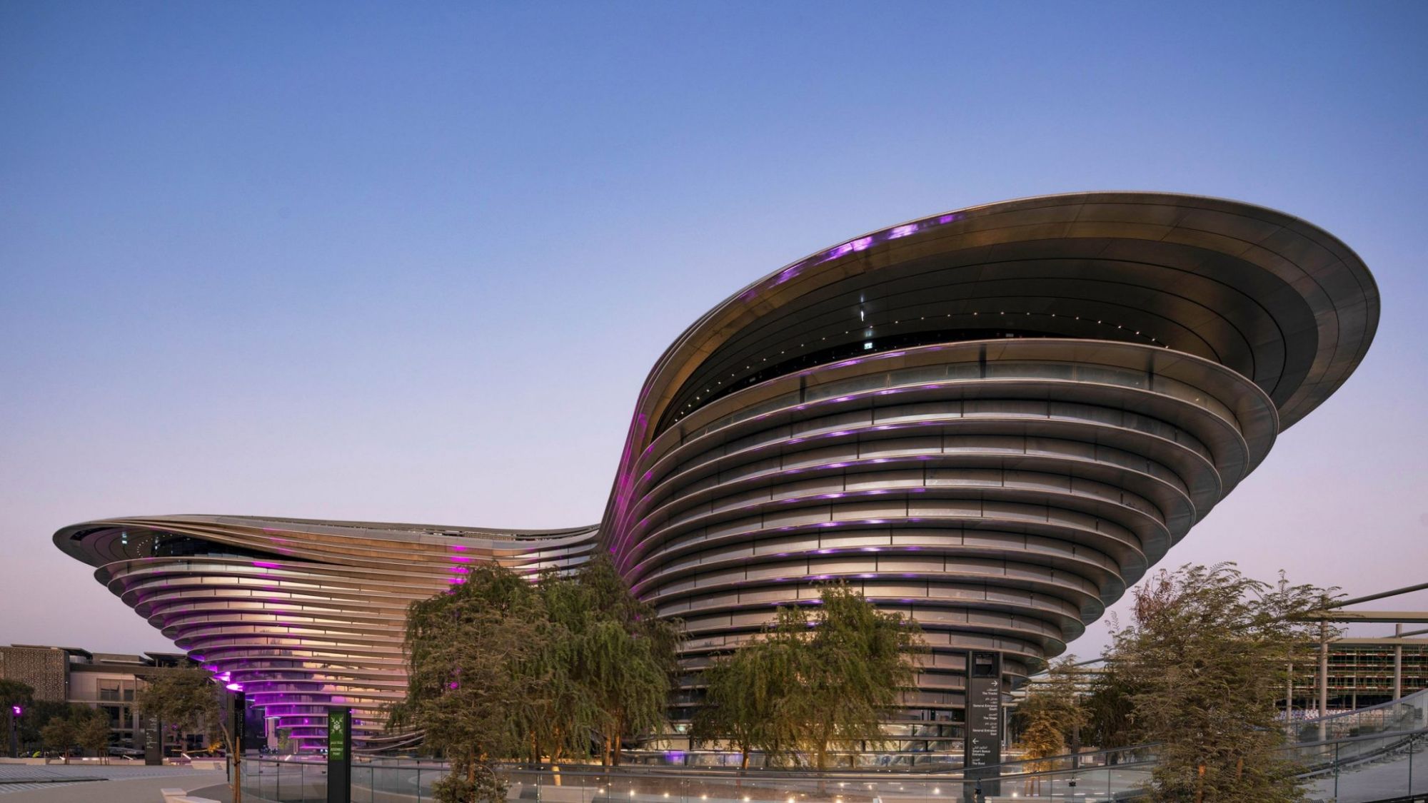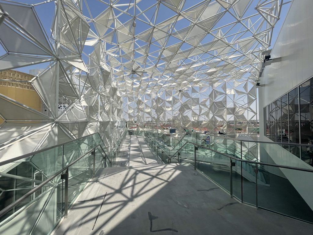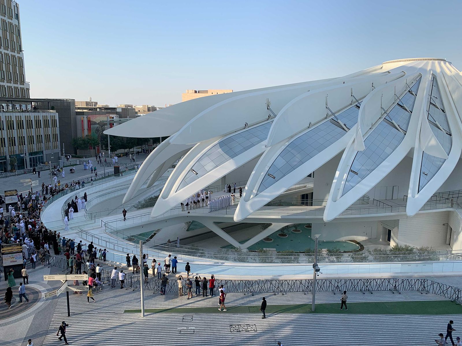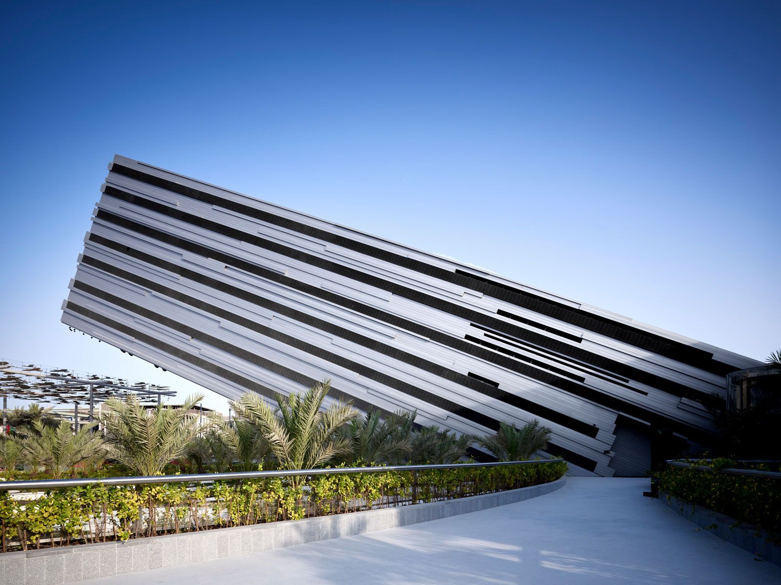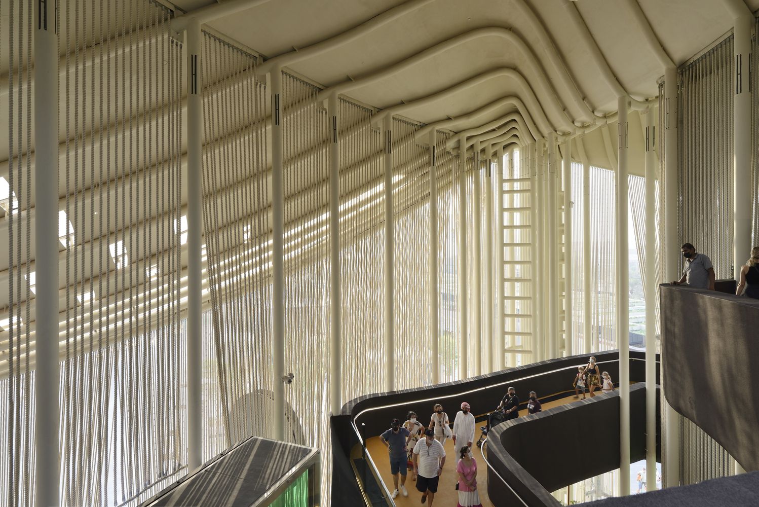 The Mobility Pavilion, called Alif (from the first letter of the Arabic alphabet) has a curved rib structure designed to evoke movement. The entire building is clad in highly reflective stainless steel that reflects the entire surrounding landscape making the surface of the structure seem alive. There is also an amphitheater and a stage in the square around the pavilion that will host events and public events such as symposia and talks. Internally, the tripartition of the building corresponds to three exhibition areas. The entrance is in the center and is equipped with the largest elevator in the world, able to hold more than 160 people, which takes visitors to the third floor from which you then descend through the various galleries to the basement. The entire structure is also completely sustainable, able to cool down by reflecting light and generate energy with solar panels.