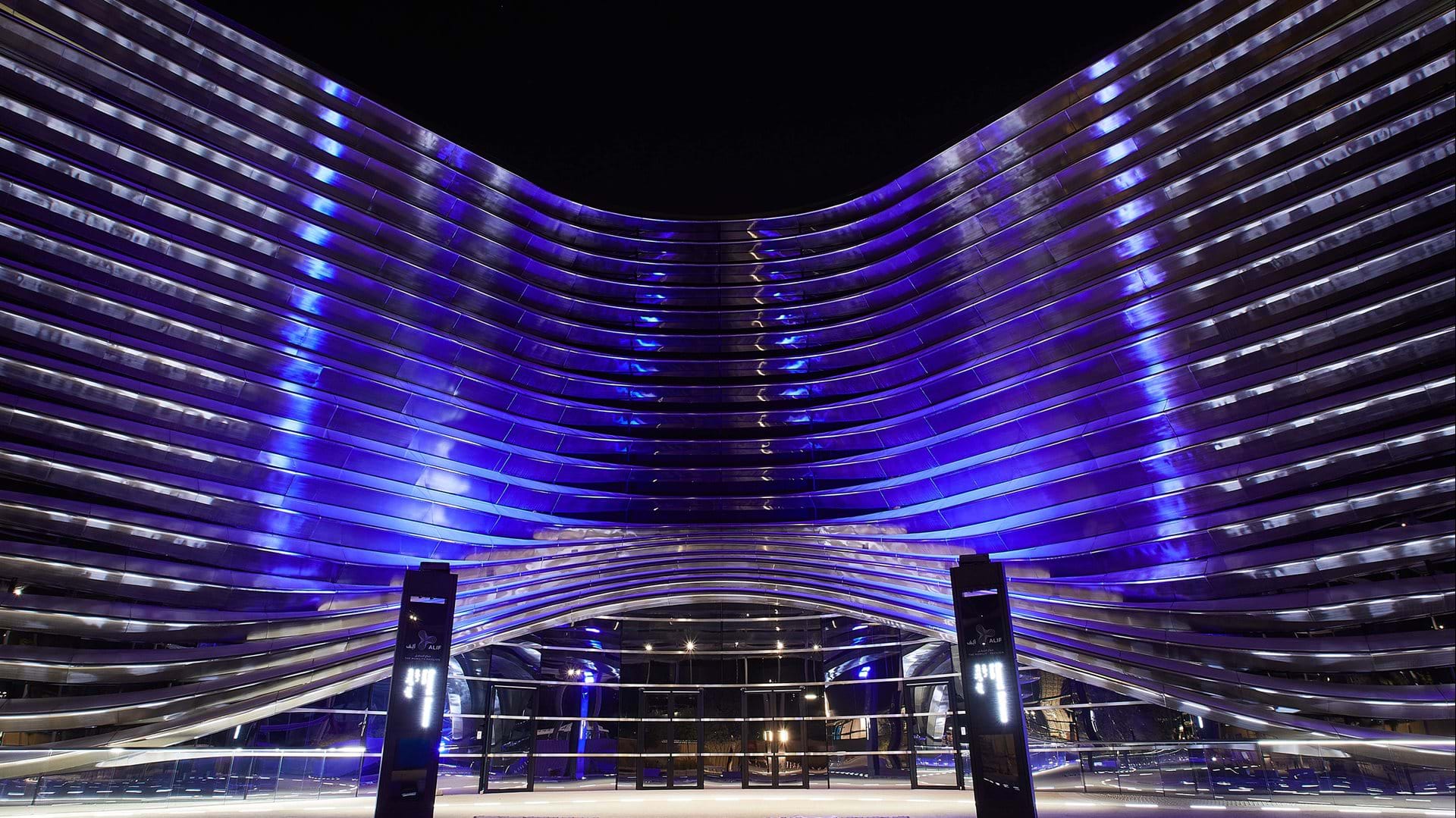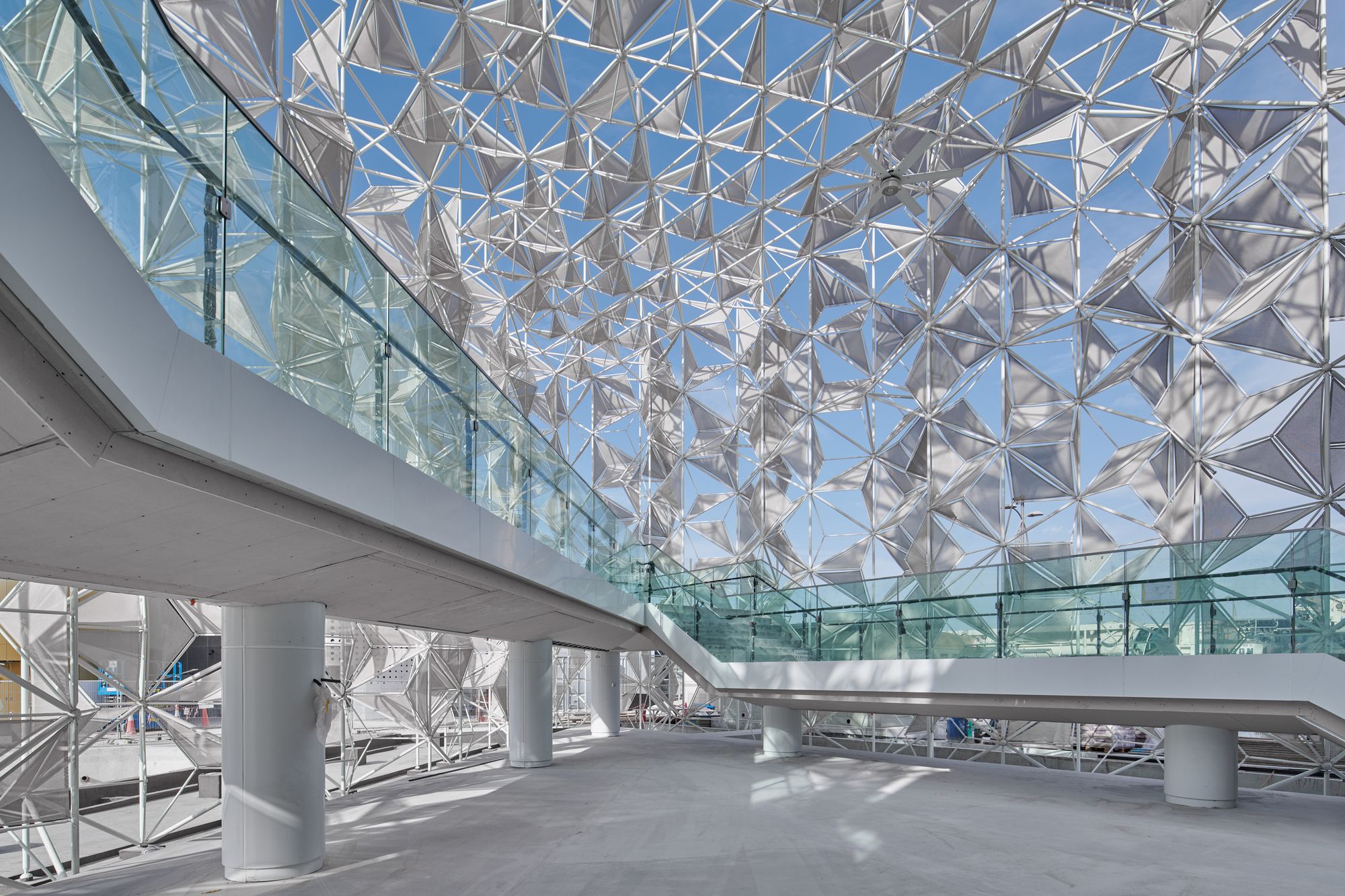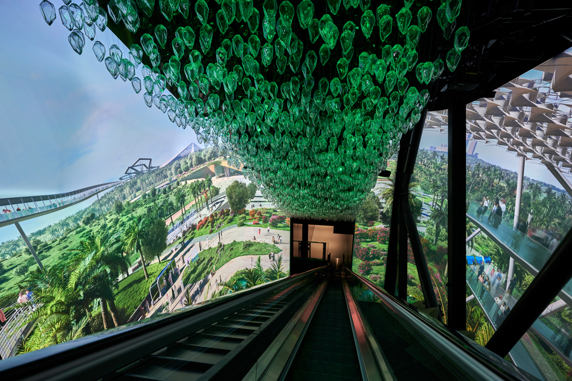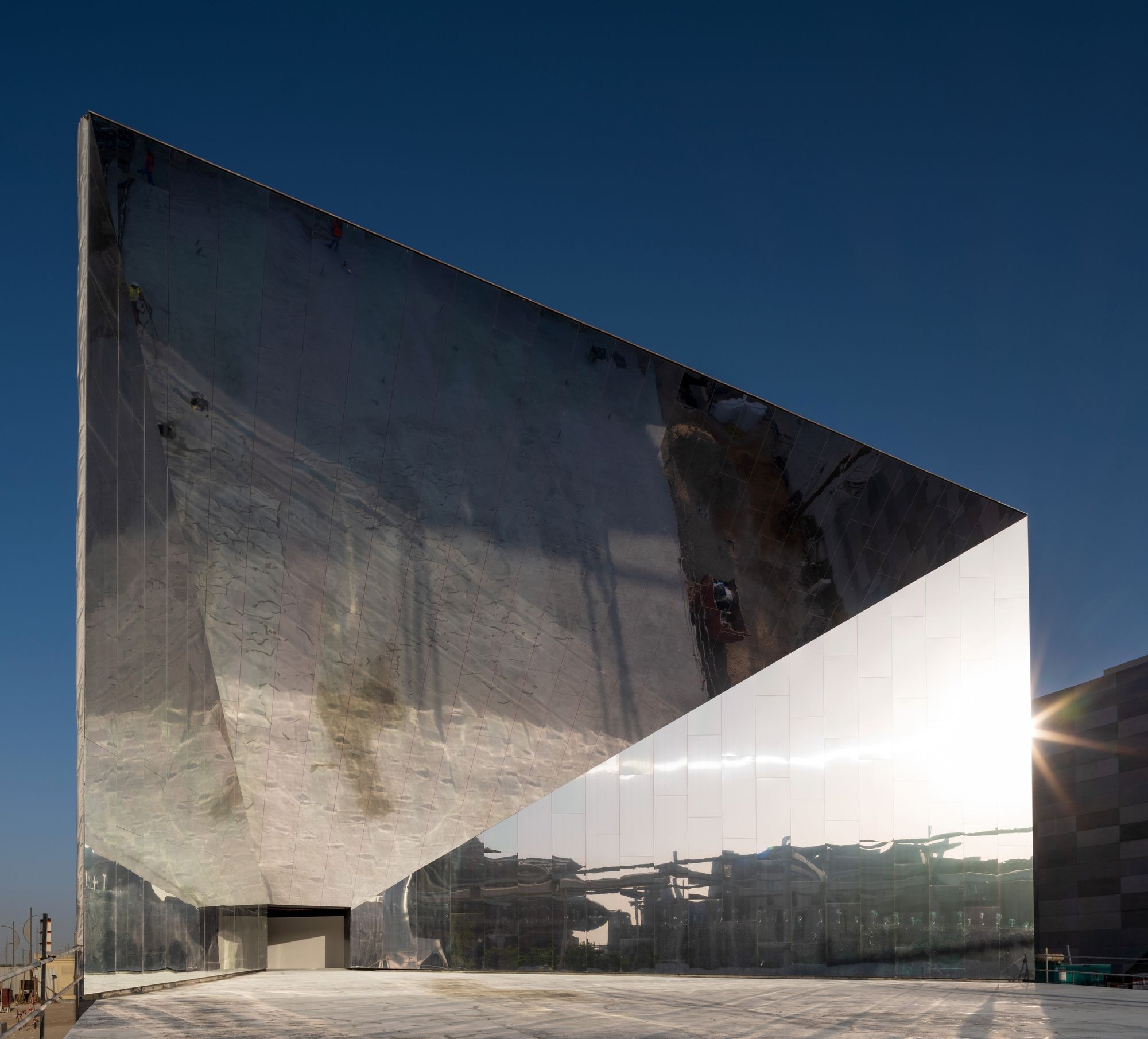 The Mobility Pavilion, called Alif (from the first letter of the Arabic alphabet) has a curved rib structure designed to evoke movement. The entire building is clad in highly reflective stainless steel that reflects the entire surrounding landscape making the surface of the structure seem alive. There is also an amphitheater and a stage in the square around the pavilion that will host events and public events such as symposia and talks. Internally, the tripartition of the building corresponds to three exhibition areas. The entrance is in the center and is equipped with the largest elevator in the world, able to hold more than 160 people, which takes visitors to the third floor from which you then descend through the various galleries to the basement. The entire structure is also completely sustainable, able to cool down by reflecting light and generate energy with solar panels.