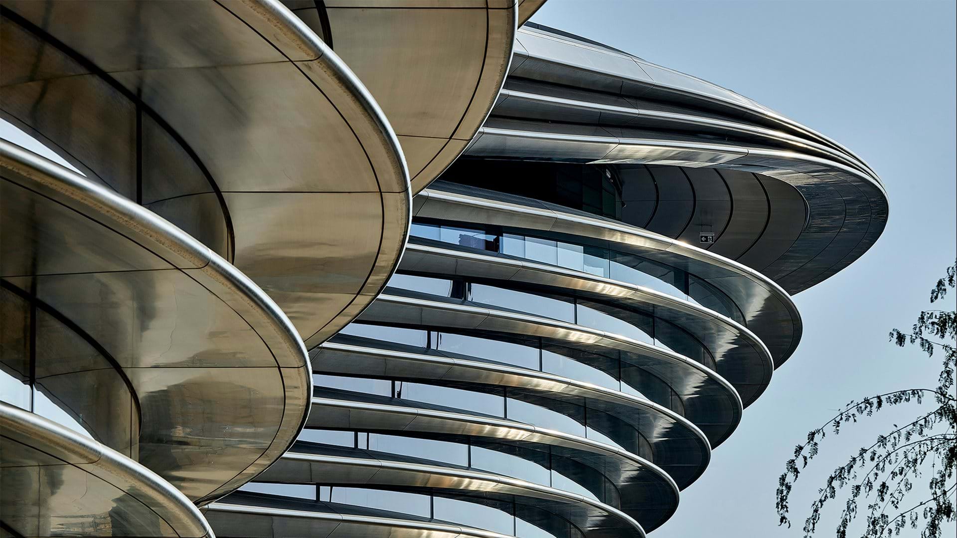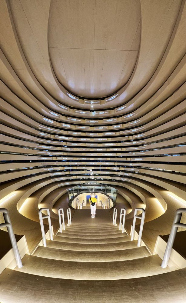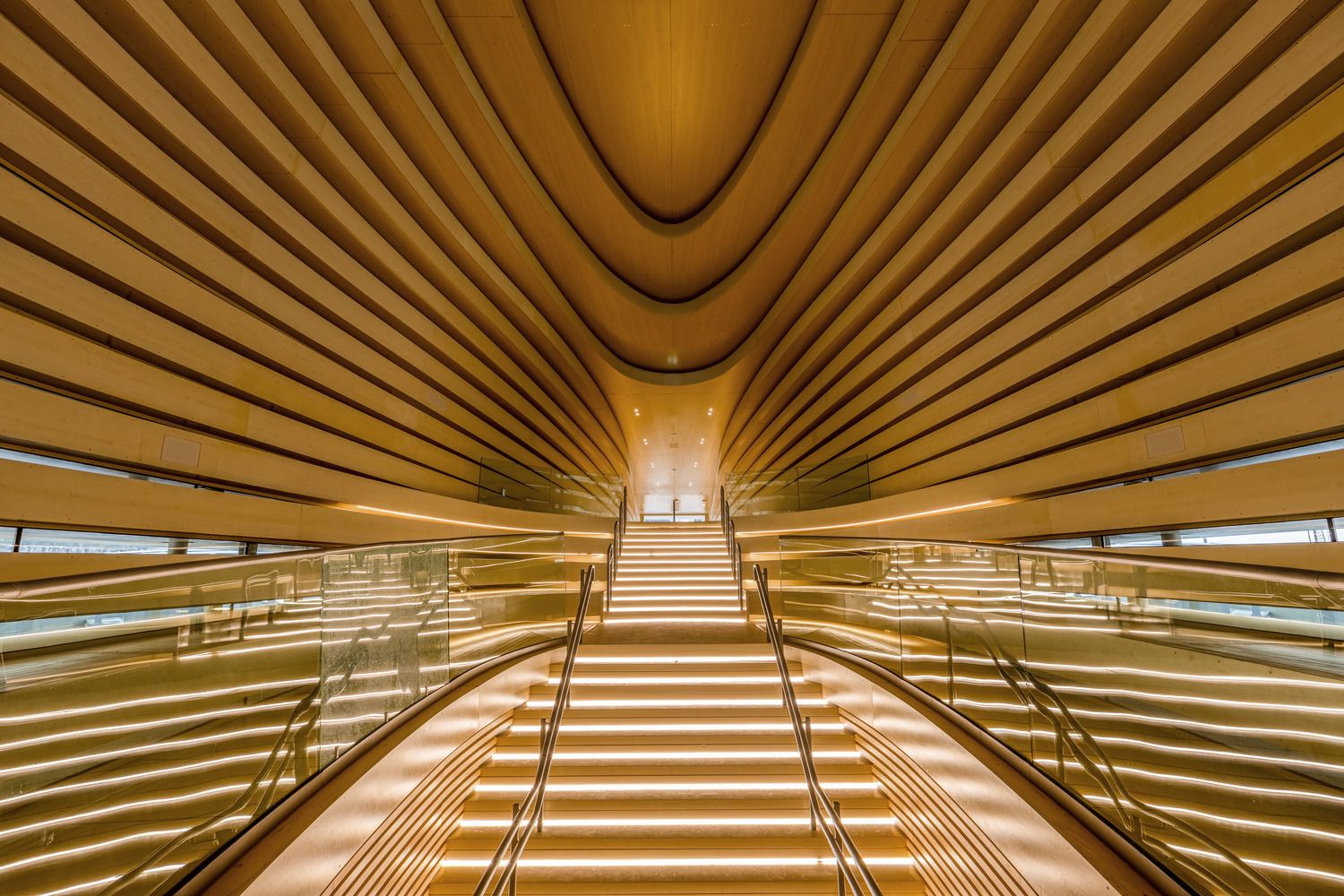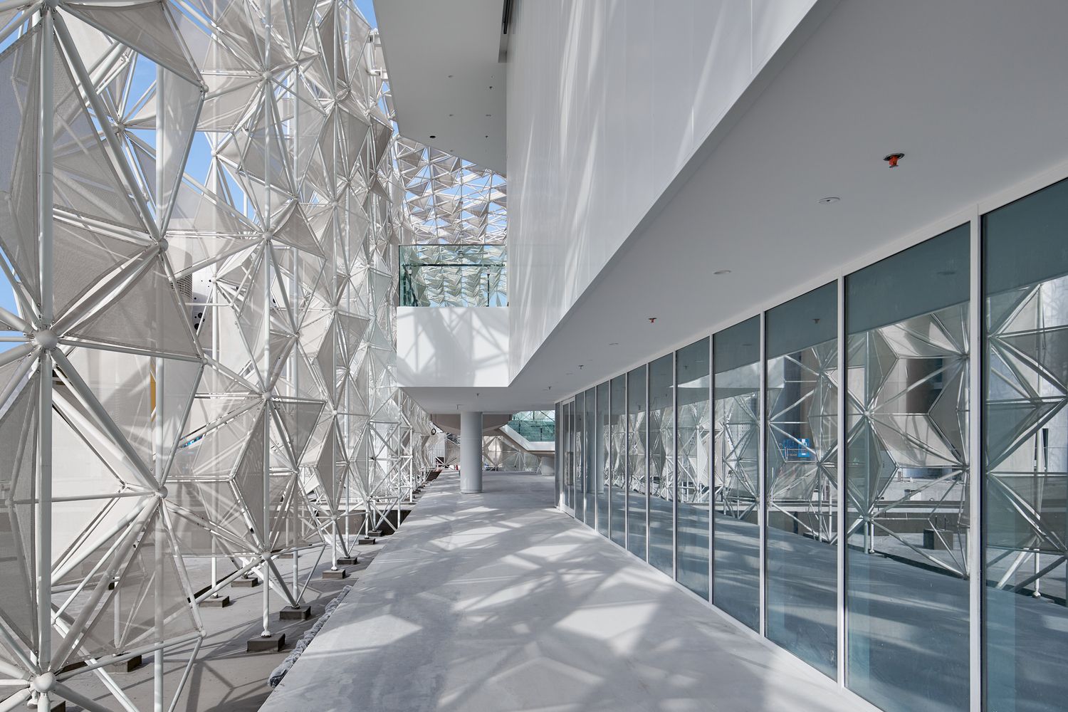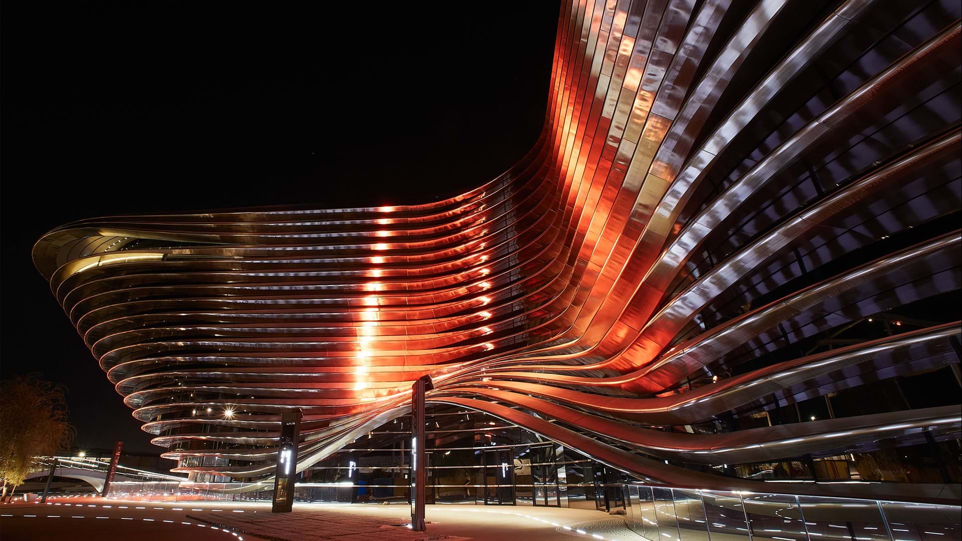The Mobility Pavilion, called Alif (from the first letter of the Arabic alphabet) has a curved rib structure designed to evoke movement. The entire building is clad in highly reflective stainless steel that reflects the entire surrounding landscape making the surface of the structure seem alive. There is also an amphitheater and a stage in the square around the pavilion that will host events and public events such as symposia and talks. Internally, the tripartition of the building corresponds to three exhibition areas. The entrance is in the center and is equipped with the largest elevator in the world, able to hold more than 160 people, which takes visitors to the third floor from which you then descend through the various galleries to the basement. The entire structure is also completely sustainable, able to cool down by reflecting light and generate energy with solar panels.
