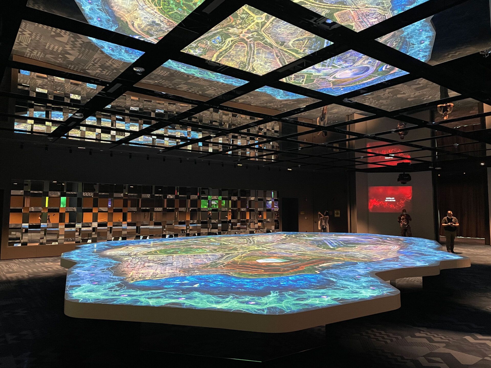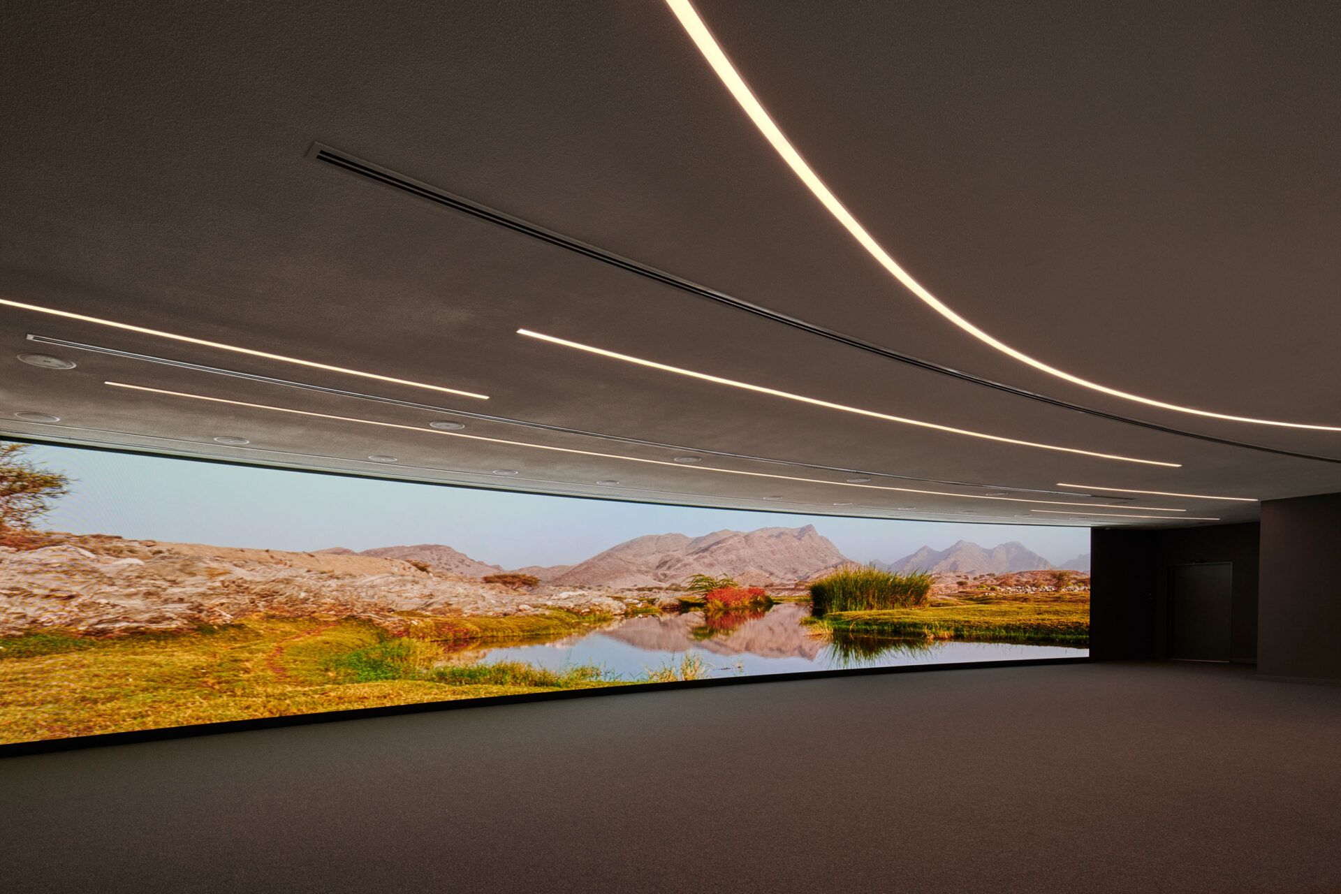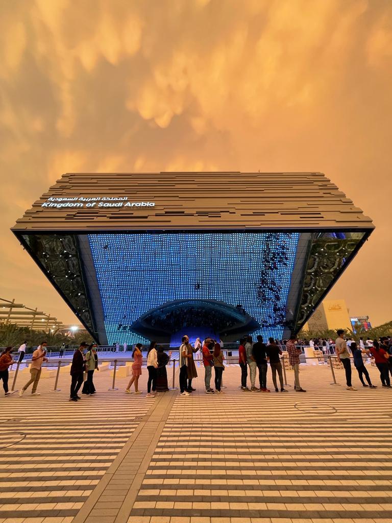 The Saudi Arabian Pavilion was designed by the BMA studio and is the largest in the entire Expo – as well as the most high-tech. With its cantilevered structure, the structure seems to emerge diagonally from the garden that surrounds it and has an audiovisual system integrated into the external facades and the floor of the square below on which images flow, optical illusions are created and also scenic settings are created for presentations and events. The glass façade doubles as a canopy, keeping visitors in the shade in line for entry. When the integrated screens are turned off during the day the façade becomes a monumental mirror that reflects the entire square. At the intended the exhibition is organized as a hyper-immersive digital journey into the history and culture of Saudi Arabia.