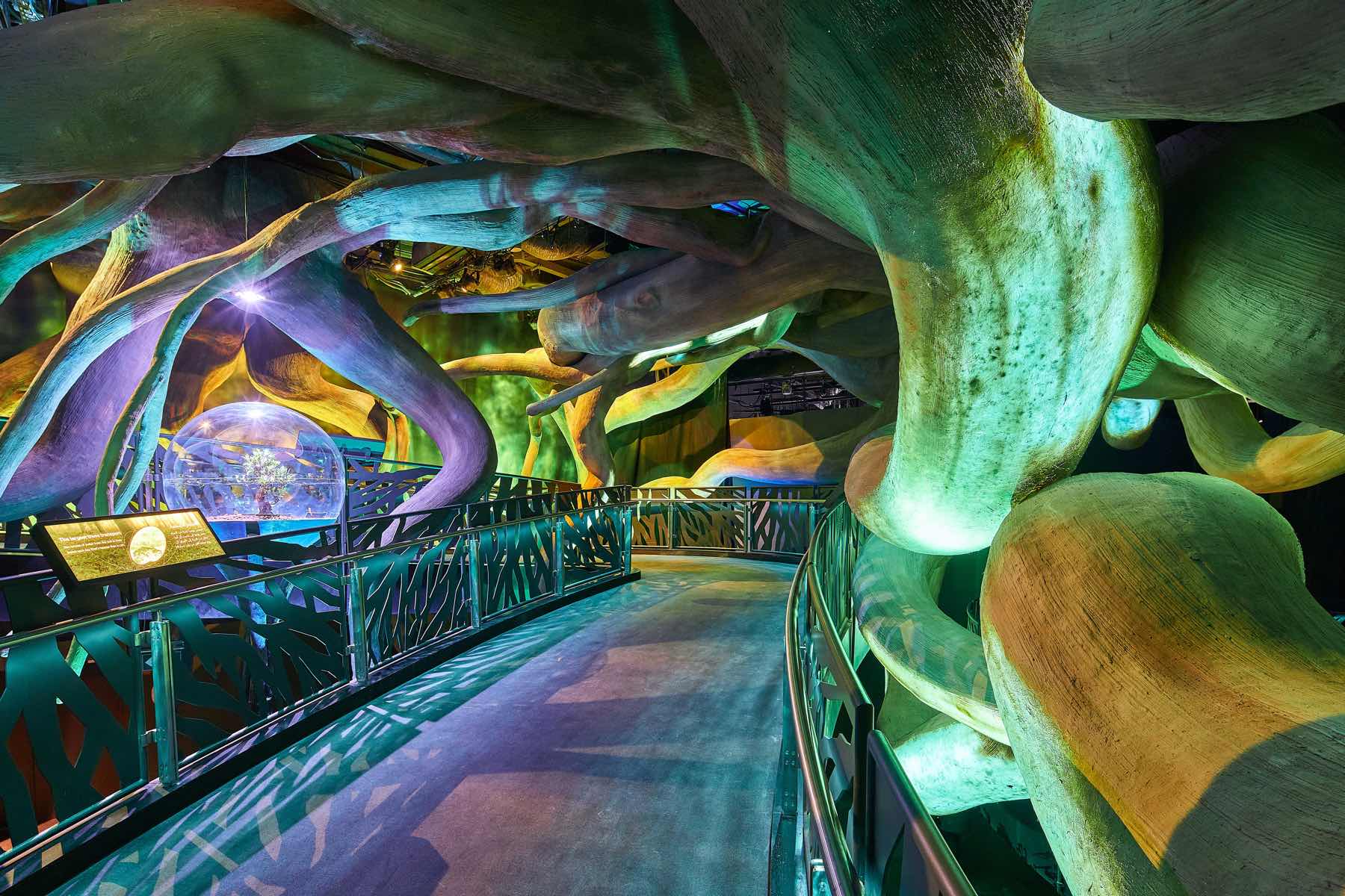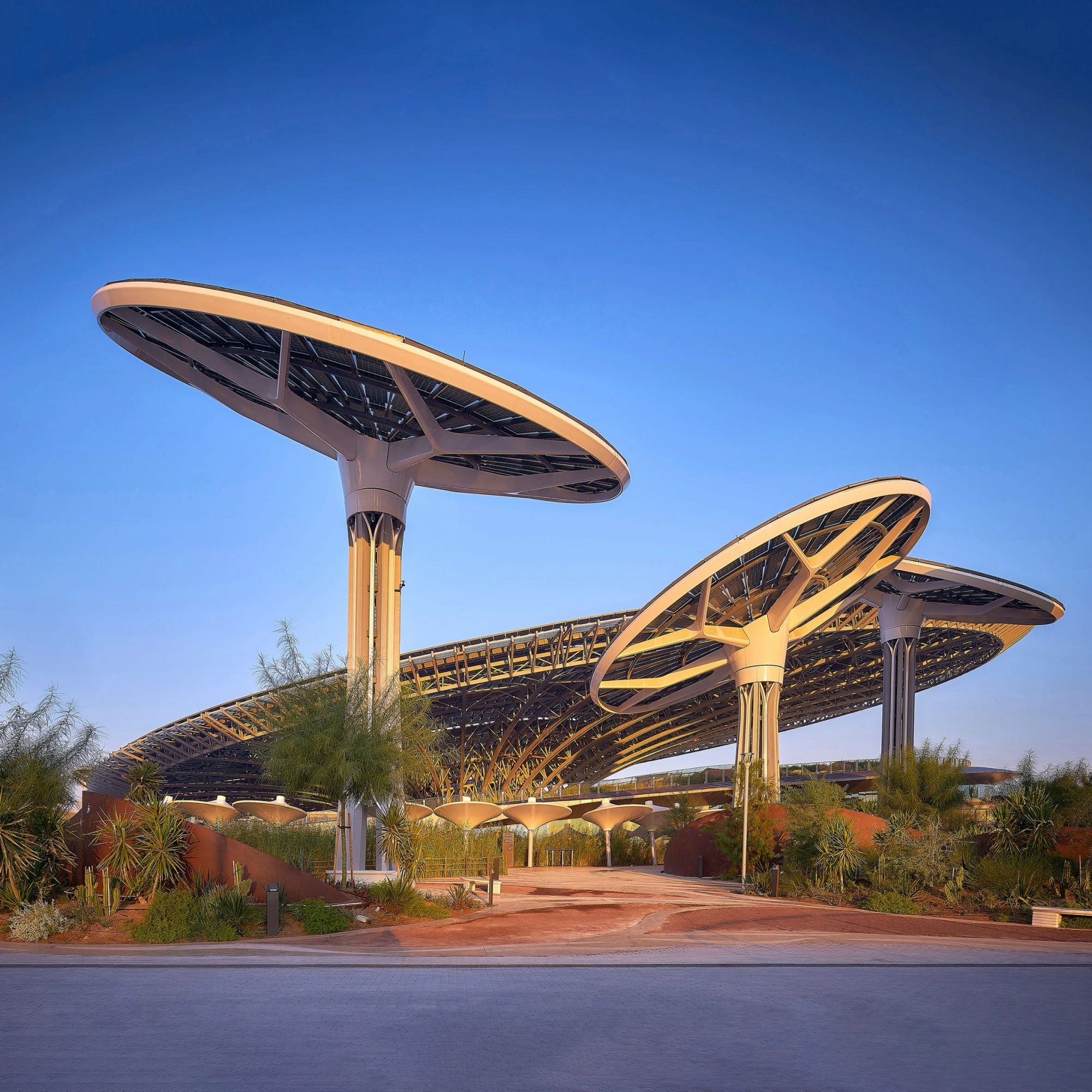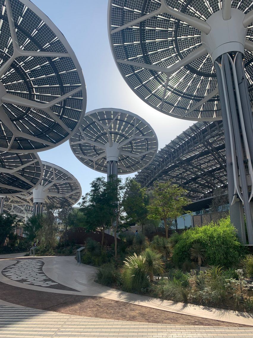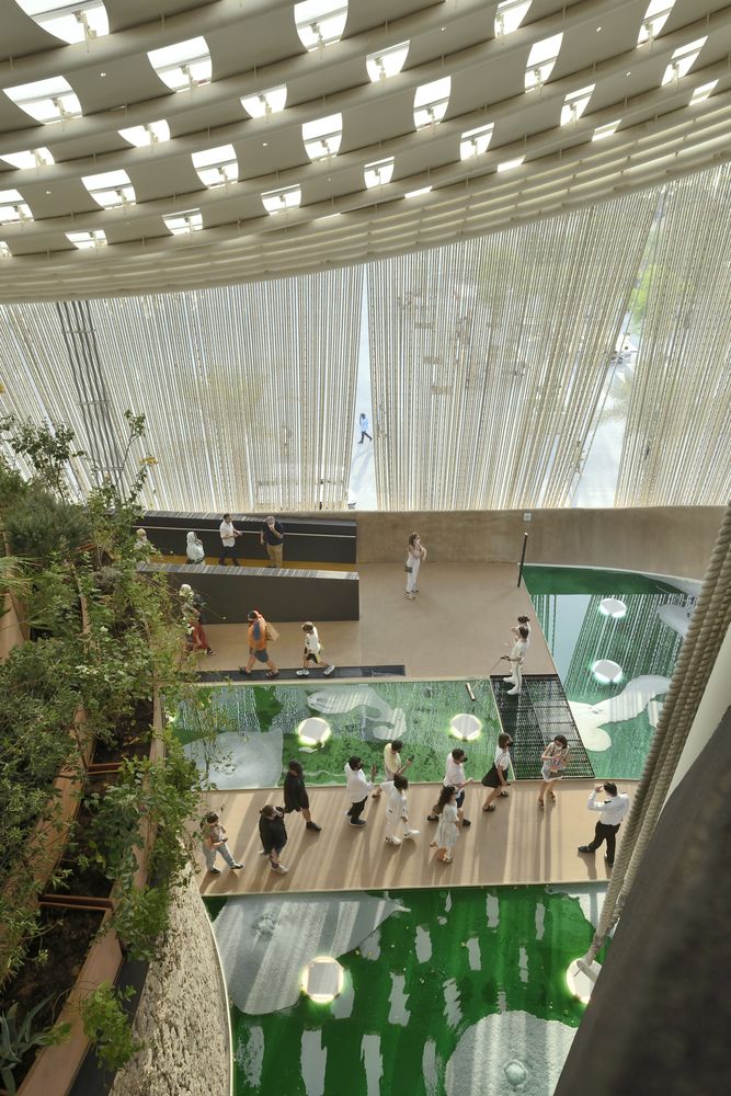 Officially called Terra, the permanent pavilion dedicated to the macro-theme of sustainability was designed and built by the English architecture firm Grimshaw. It is a self-sustaining structure capable of generating energy and collecting water. Inside, Terra contains 6,000 square meters of exhibition spaces covered by earth roofs and shaded by a giant suspended dome similar to the branches of the Ghaf or Loong Tree, which is the national plant of the UAE, made of 97% recycled steel and covered with over 1,055 solar panels that, along with the other eighteen structures below, they are capable of producing 4 gigawatts of electricity in a year. All facilities are also capable of collecting rainwater and dew which is then filtered and recycled through the surrounding garden.