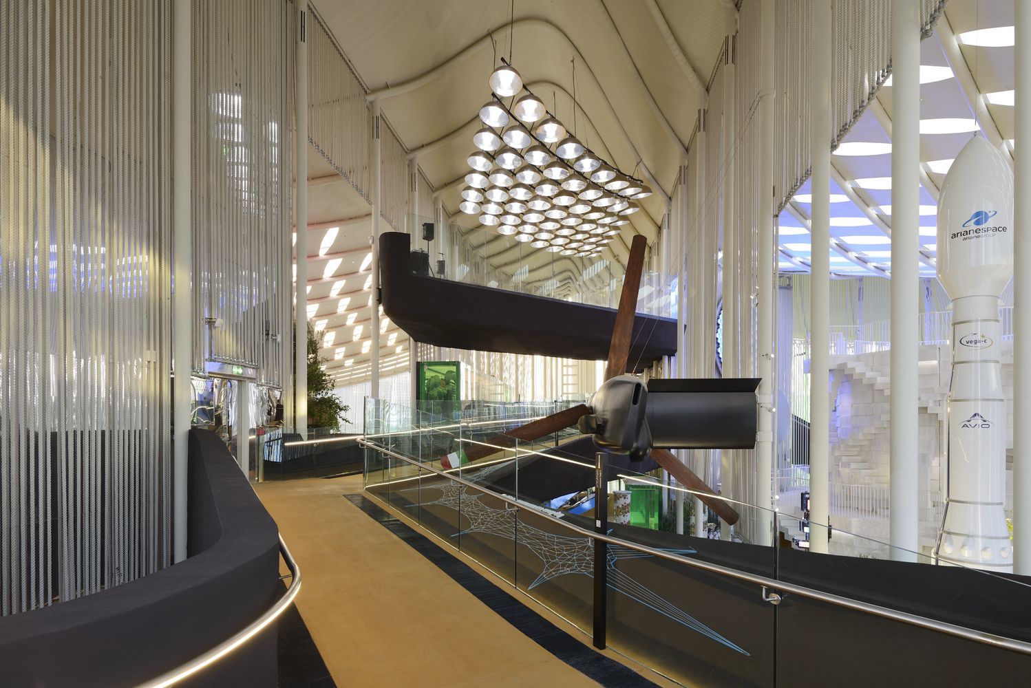 The Italian Pavilion was designed by CRA-Carlo Ratti Associati and Italo Rota Building Office, together with Matteo Gatto and F&M Ingegneria. The focus of the project was the circular economy, in line with the theme assigned to the country, and implemented a reconfigurable architecture concept. Orange peels, coffee, algae and sand were the materials used in the construction of the structure that resembles a desert tent, bordered by a monumental curtain made of recycled plastic ropes and with a curved roof created from boat hulls for the roof. The interior is a large open space, decorated with large pools of water and vertical gardens with exhibition paths inside and also areas equipped to host meetings and conferences.