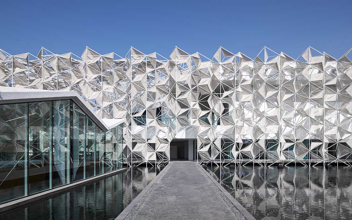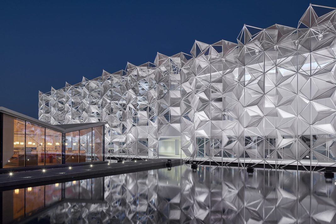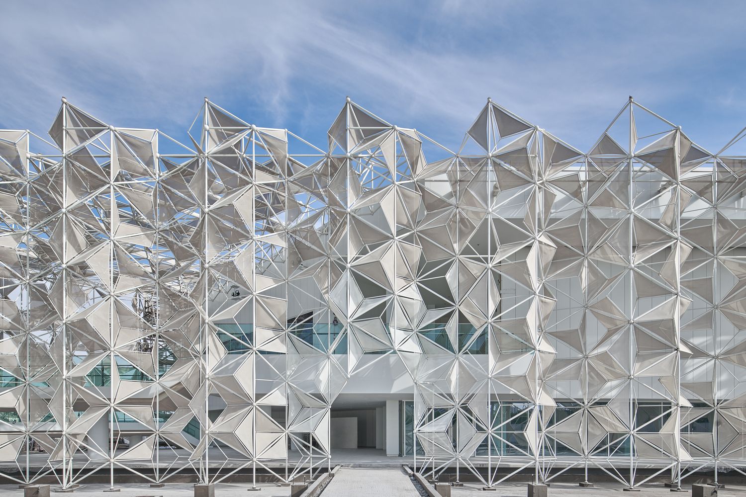 Dedicated to the theme of connection, the Japanese pavilion designed by Yuko Nagayama's studio is composed of a three-dimensional lattice of latex sheets that is inspired by the origami and traditional geometric patterns of Japan and Arabia – emphasizing the similarity of the two cultures. The structure of the pavilion, together with the swimming pool that surrounds it create a natural air conditioning system, which exploits only the wind, shade and surrounding humidity.