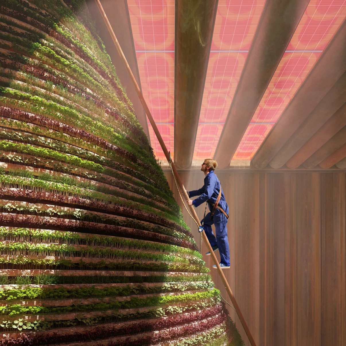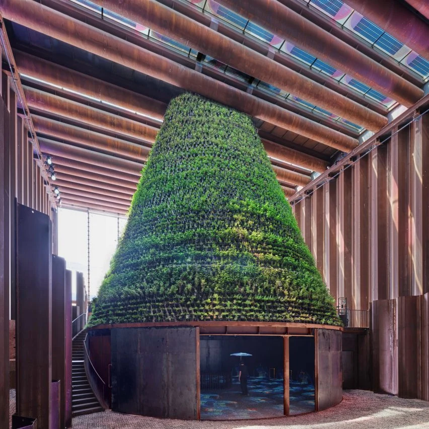 The Dutch pavilion is one of the most spectacular because it brings to fruition the idea of self-sustenance that underlies many of the Expo's ideas of sustainable architecture. The name of the pavilion is Biotope and it has an integrated system for water collection, cultivation and creation of clean energy. Its technology extracts moisture from the desert air and uses it to irrigate a conical-shaped vertical garden used to grow edible plants and even mushrooms, thanks to its ability to create an indoor microclimate. The solar panels are the main source of energy of the structure while the water collected thanks to the technology of Sun Glacier falls inside the cone like a waterfall even reaching 800 liters per day.