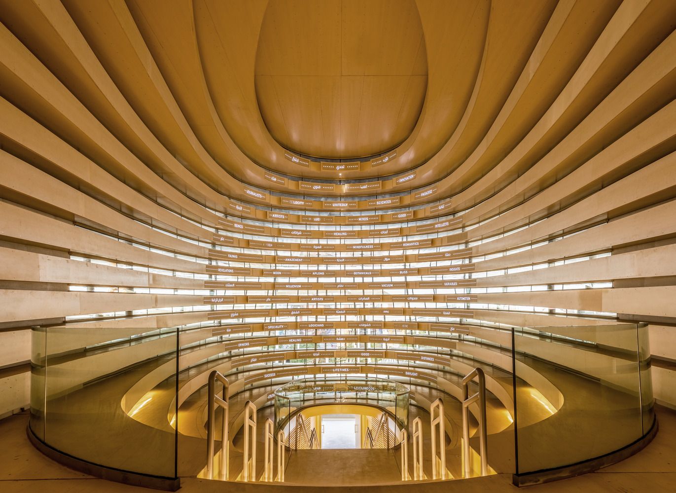The British pavilion conceived by the artist and stage designer Esmeralda "Es" Devlin is a monumental wooden sculpture on whose front façade flows a continuous poetry generated by an AI that creates the flow of words by mixing and recombining the inputs inserted by the visitors at the entrance. The structure is designed to emphasize the growing importance of algorithms in our society but also the multiculturalism of the United Kingdom, symbolized by the union of different words. Inside, there is also a soundscape created by the traditional choirs of the various ethnic groups living in the country.