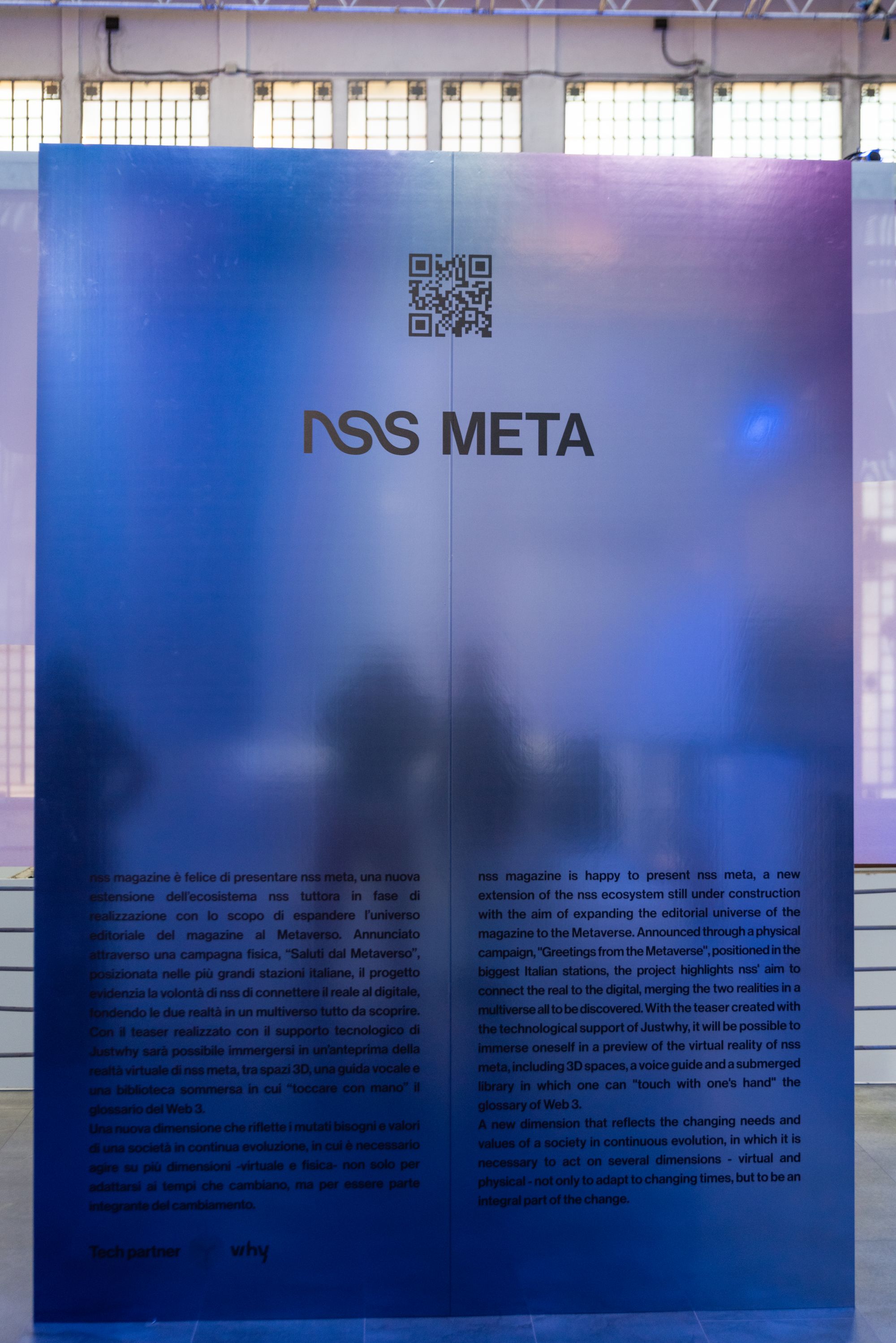 From 24 to 27 February in via Tortona 58, during the White Milano fair, the first installation of nss meta was presented, the new extension of the nss ecosystem, still under construction with the aim of expanding the magazine's editorial universe to the Metaverse. A teaser created with the technological support of WHY and the sound of composer and sound designer Philip Abussi of Mokamusic, in which, using Oculus, it was possible for visitors to immerse themselves in the new virtual reality between 3D spaces, a voice guide and a submerged library in which they could "touch with their hands" the Web 3 glossary.