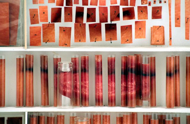 Recuperare materiali, sezionare, frammentare, incapsulare. Tra fotografia e scultura, c'è il lavoro di Micheal Mapes. Il designer newyorkese crea ritratti fotografici utilizzando i materiali più insospettabili: macchie di vino rosso, lenti d'ingrandimento, capsule in gelatina, resina e insetti ingabbiati in fiale di vetro. Una tela si trasforma in un tavolo da laboratorio, e il DNA diviene protagonista assoluto.
