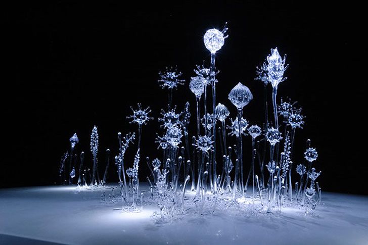 Sembrano stalattiti, le sculture in vetro di Mika Aoki. Sorgono all'interno di una vecchia automobile mangiata dalla ruggine. Sembra liquido "vomitato" da una bottiglia, quella serie di istallazioni chiamate semplicemente "bottle". Il vetro, materiale dall'affascinante contrapposizione solidità- fragilità, la cui trasparenza lo rende quasi invisibile, affascina lo scultore giapponese.