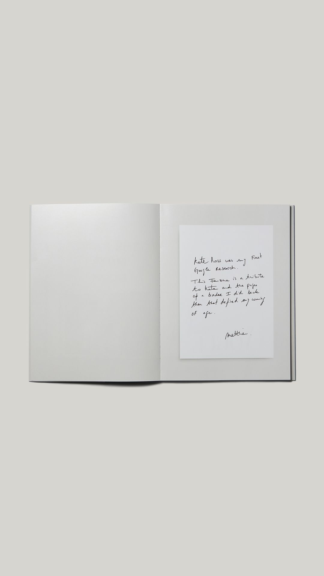 «Kate Moss was my first Google search. She was the first photo printed on the family printer,» said Matthieu Blazy. «Whenever I hear the sound of a modem, I think of Kate, because as a teenager I mainly searched for her photos. It's a sound that will forever connect me to her. She became a personal icon. It was a serious teenage activity that became a regular part of my daily life at home. When I did my 'Kate Moss', it meant collecting pictures. In a way, this hobby shaped me. This fanzine is a tribute to Kate and to the pages of a folder that shaped my adulthood. She was my first».