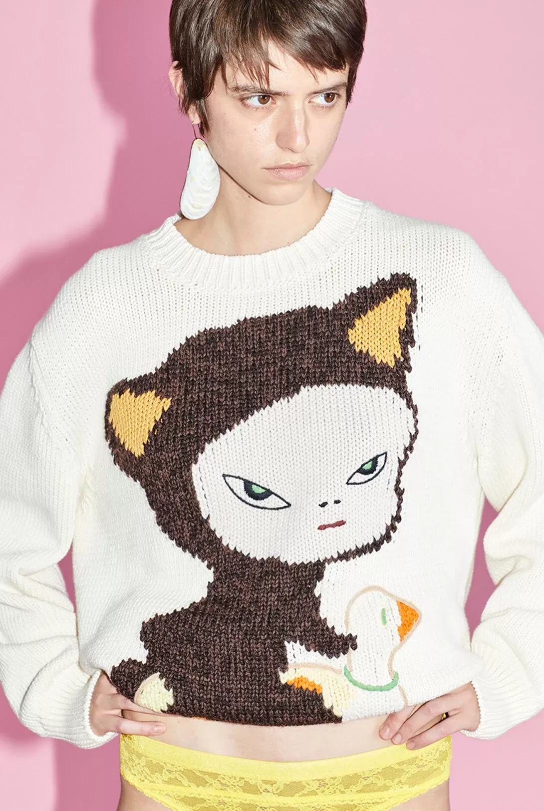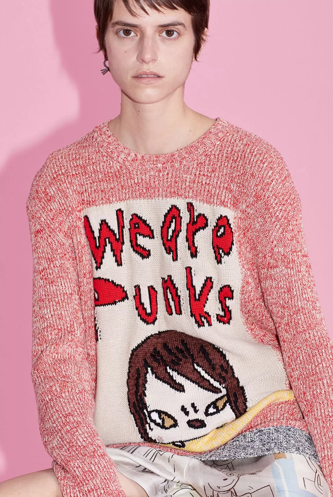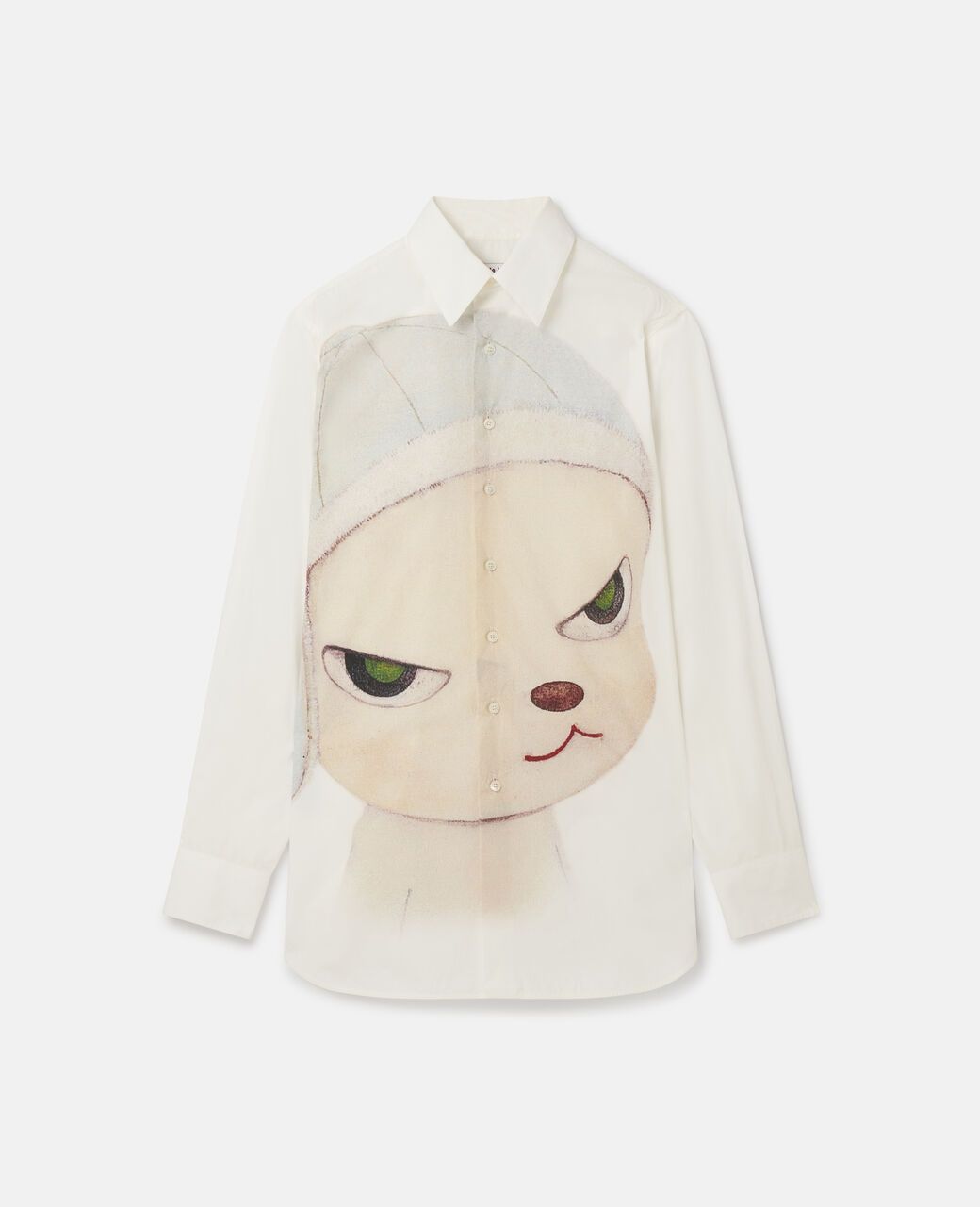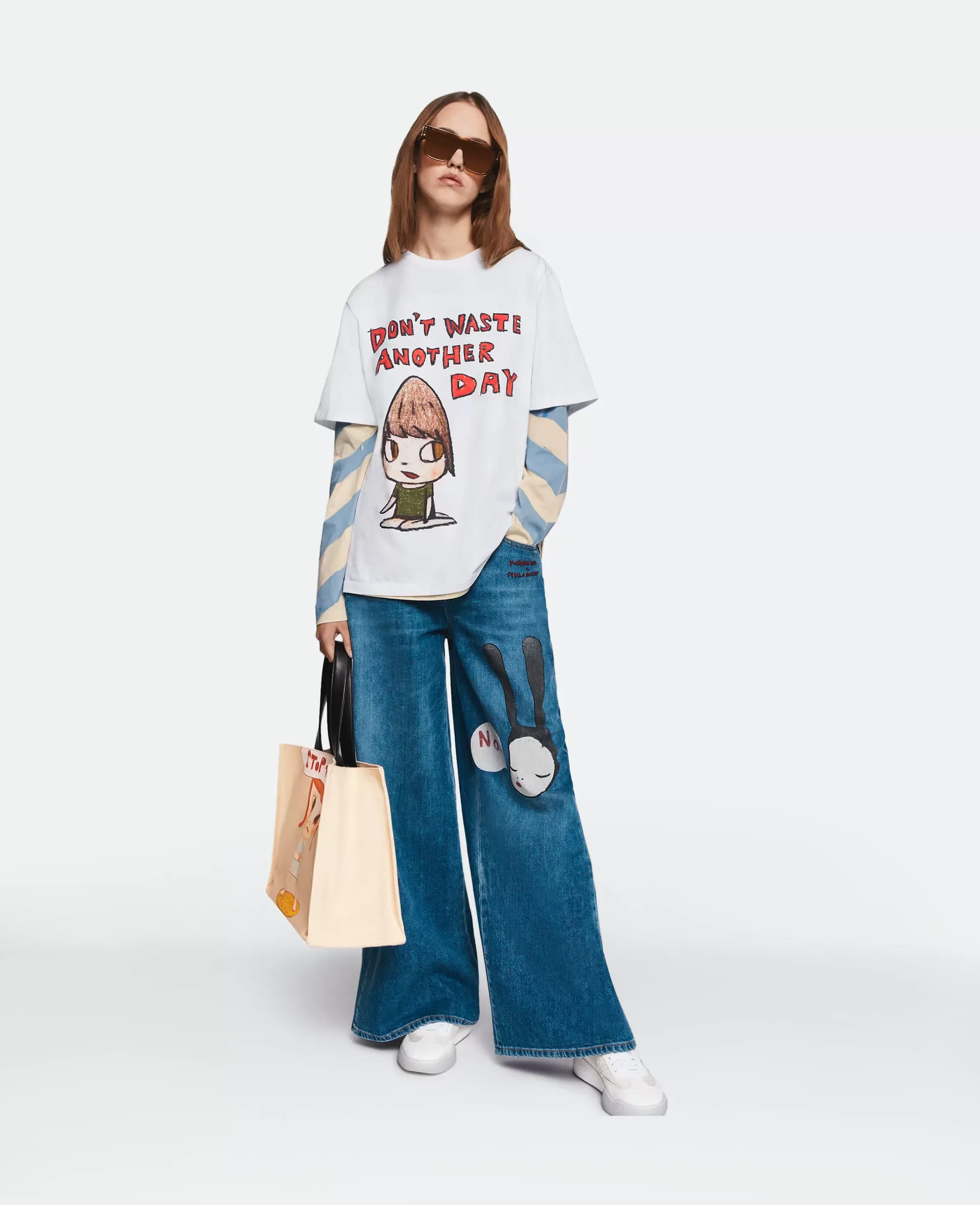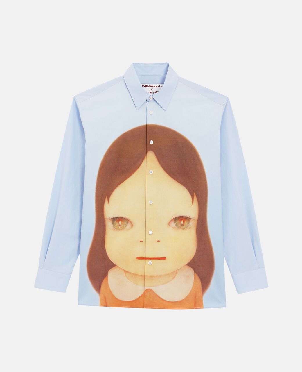 Pouty kids, pastel colors, and countercultural slogans animate organic cotton jersey t-shirts, hoodies, sweatpants, shirts, plant-based poplin trousers, baggy-fit jeans, pajamas, Double-Face bomber jackets, knitwear, and the ubiquitous vegan accessories (from Elys wedges to bucket hats to recyclable loop trainers, Gaia espadrilles and Fur-Free Fur pool slides with Nara designs). It's to the McCartney team's credit that they sensed translating Nara's appeal into clothing would be a success, but the focus remains on the talent of an artist who can express the anxieties of postmodernism in the faces of innocent but never harmless children. But who is Yoshitomo Nara and how did he become Japan's most famous living contemporary artist? In 2019, Nara caught the market's attention when Sotheby's in Hong Kong sold his most famous work Knife Behind the Back (2000) for a record price of $25 million. Since then, he has become one of Asia's most expensive artists, and his works regularly appear in major auctions. But Nara's legacy goes far beyond the prices of his paintings. As critic Robert Smith writes in the New York Times, his works are a bridge between "high, low and kitsch; East and West; adults, adolescents, and children."