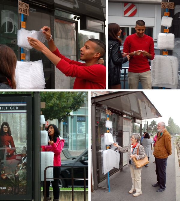 Fra.Biancoshock è uno street artist Italiano, e in questo nuovo post vi segnaliamo la sua ultima Opera. Una Postazione Antistress Gratuita, composta da 3 diverse misure di Pellicole di carta da imballaggio, collocate in diverse fermate dell'autobus a Milano. A seconda di quanto uno è stressato, può gratuitamente staccare la sua pellicola adatta e iniziare a schiacciare i pallini aspettando la sua navetta, le misure sono consigliate in base a quanto tempo impiegherai nel finire di schiacciare tutte le palline, rispettivamente in 3, 5 e 10 minuti.