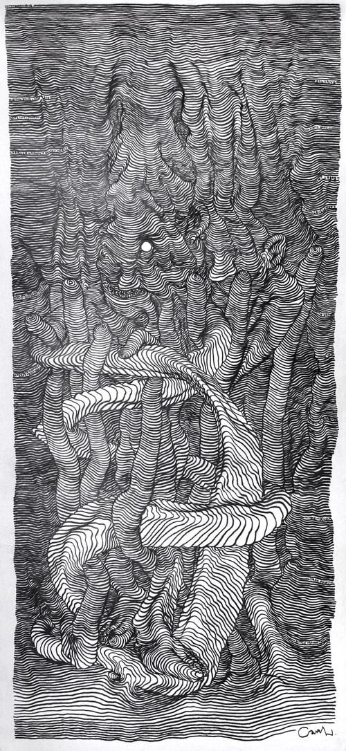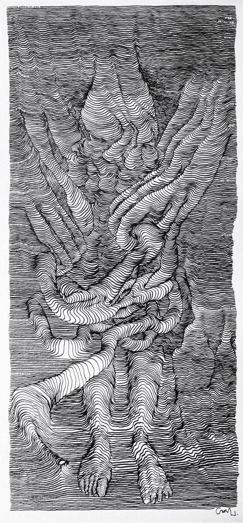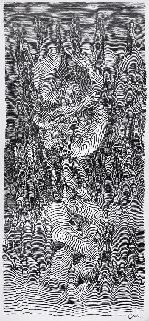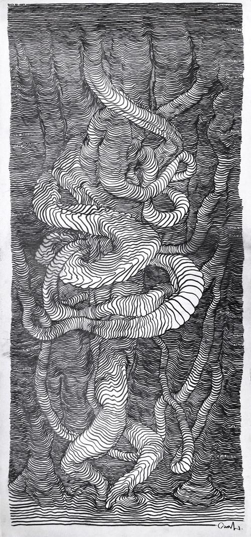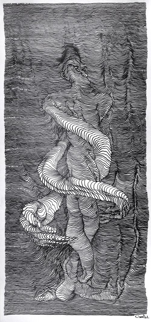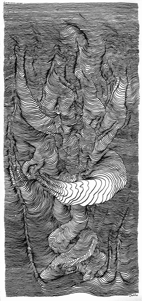 Instead, the Danish artist Carl Krull on a car trip to the United States, thought well to invent a particular practice of drawing, derived from the need to draw on a large scale without a flat surface and rolling up the paper by drawing around a tube, on which to continue, following the gradual trend of curved sheet, doing his "scroll drawings", literally a succession of lines that incorporate vibrations and shocks due to the road, making the drawing into a topographic map of the journey.