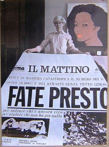 Nel percorso espositivo saranno presenti i ritratti di noti personaggi cittadini che Warhol conobbe nelle sue visite in Italia, quali Graziella Lonardi Buontempo, Ernesto Esposito, Peppino di Bernardo ed altri. Ricordiamo che proprio per l’amicizia con Lucio Amelio si deve la nascita del suo noto “headline work,” Fate presto, ispirato sulla prima pagina del Mattino del 23 novembre 1980, e composto da tre tele di grandi dimensioni, su ognuna delle quali è riprodotta, con differenti tonalità di grigio, la prima pagina del «Mattino» di due giorni dopo il terremoto dell’Irpinia.