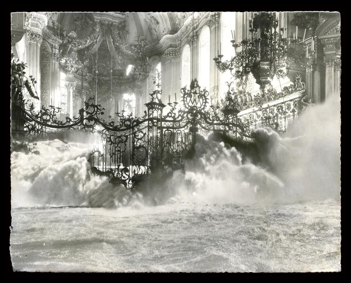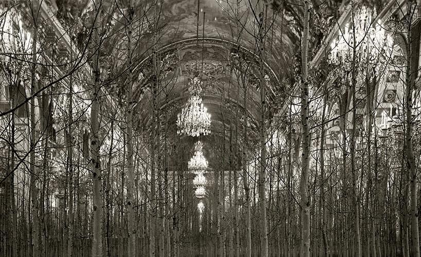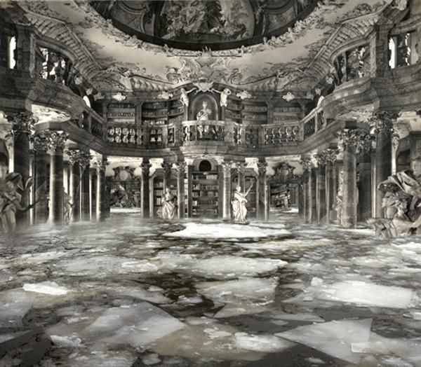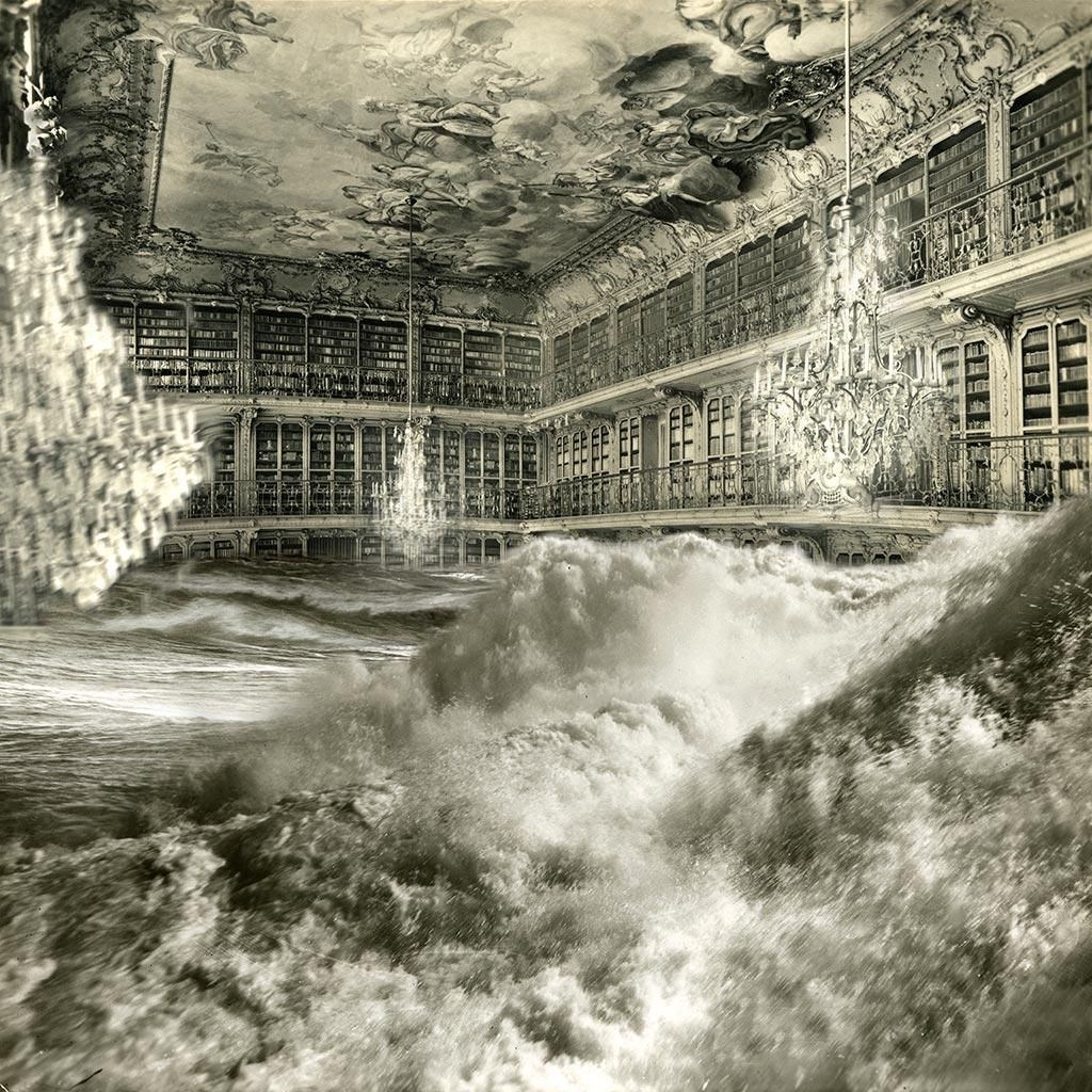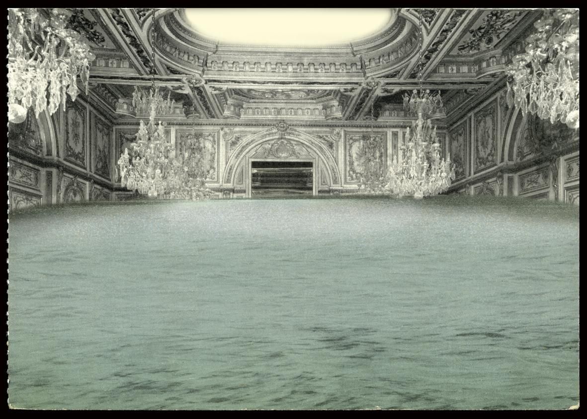 These dramatic images of fallen Baroque interiors are the collage work of Spanish artist Paul Genovés. He stitches together photos of nature with postcards of 17th and 18th century places that he’s collected from street markets. The result is both dreamy and disturbing with a strong impact- and not too far from reality. Primarily, his subject is bodies of water, like ice floating through a Venetian palace or waves crashing down the stairs of an old theater. Recent works also show forests taking root in palace halls. In less than a century, monumental cities like Venice will be underwater or be lost to decay. It leads us to question the relationship between man and nature, and what the future holds.