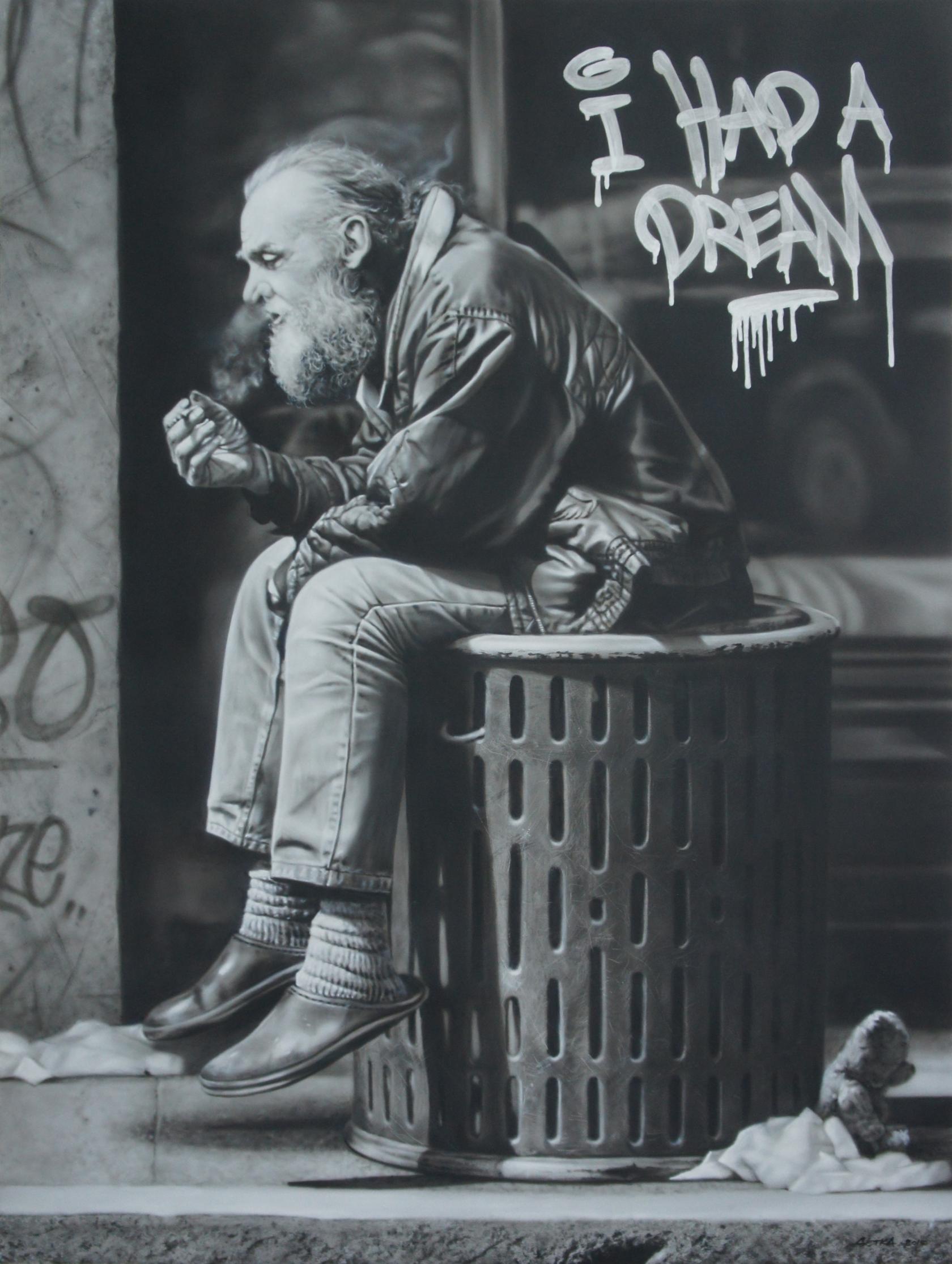 The Polish artist Setka show his first piece of a series of 8 (currently "work in progress") entitled Broken Society, with an image of a homeless and a vision of how our society today see these people in our roads.