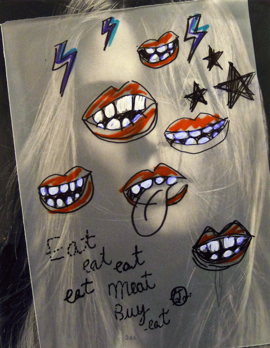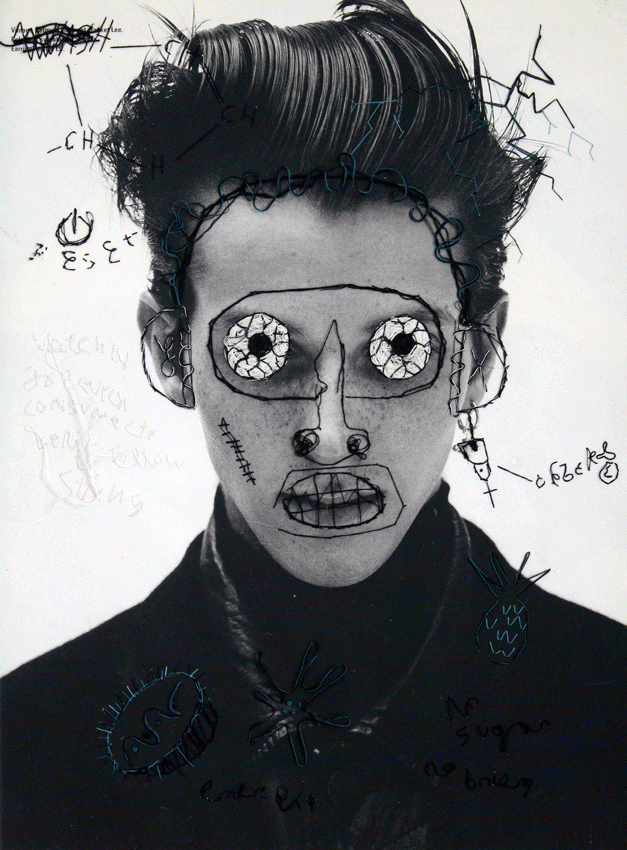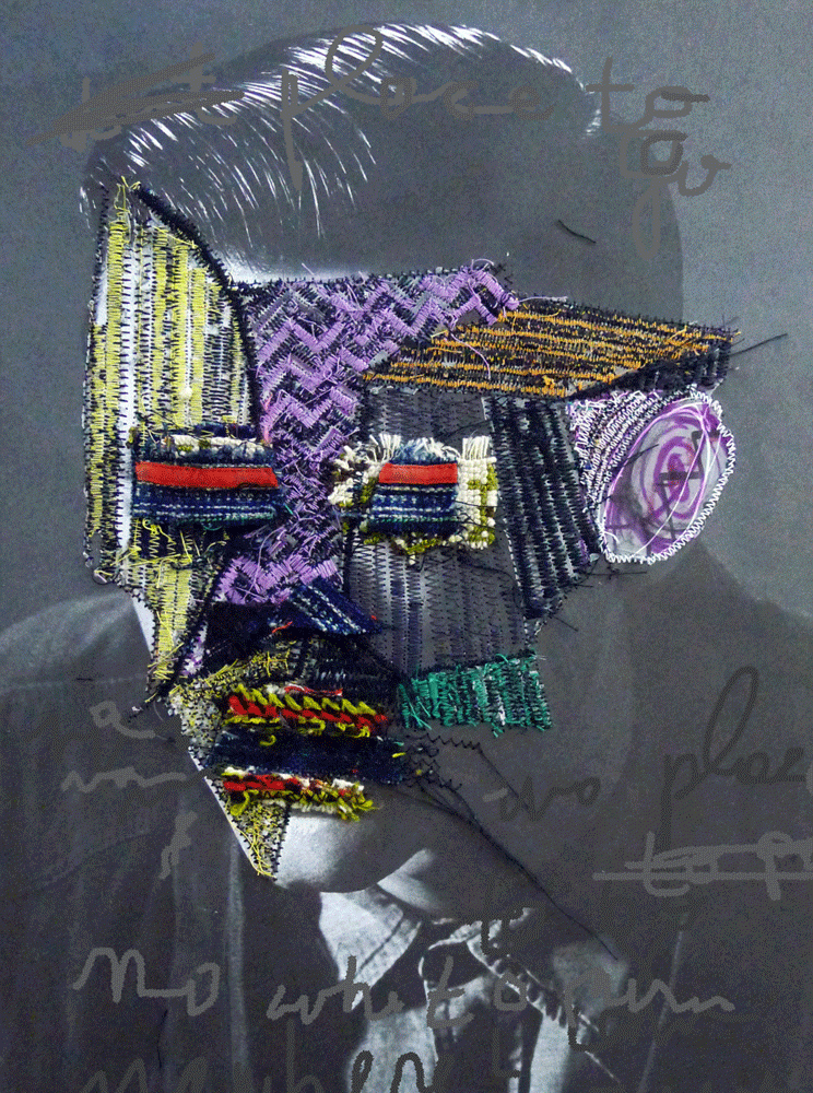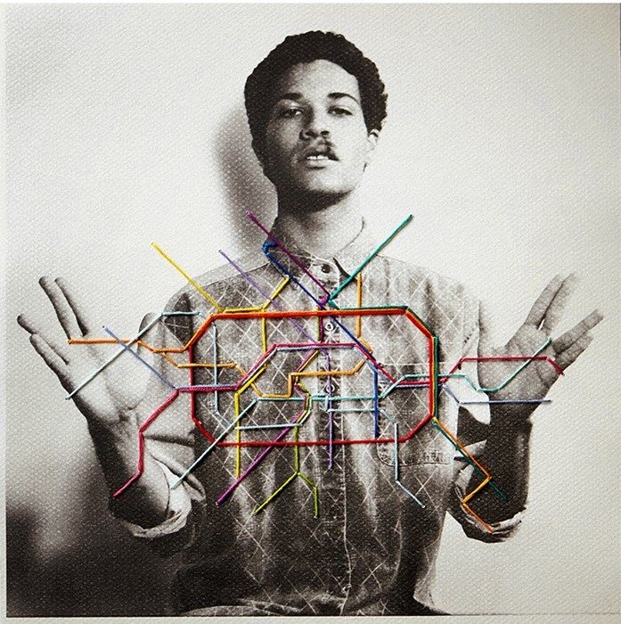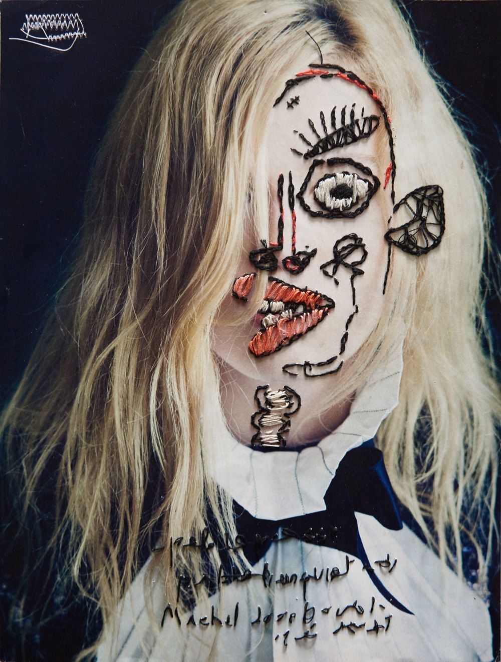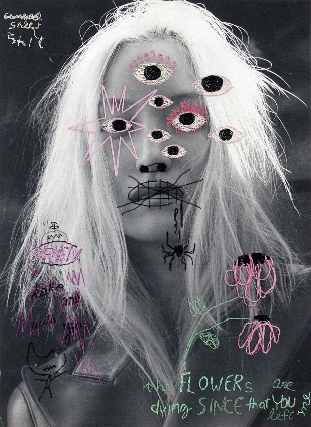 Using a needle and various multicoloured threads he embroiders patterns and words over photographs and magazine pages in order to give them a brand new life.
