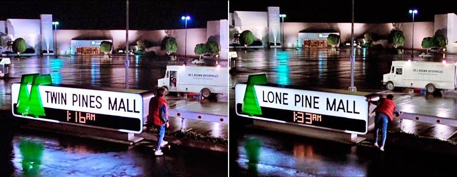 #7 When Marty departs 1985, he leaves the Twin Pines Mall, and then knocks over a pine tree when he arrives in 1955 at the Twin Pines Ranch. When he returns to 1985, the shopping centre is called Lone Pine Mall, all because he knocked one over in the past.
