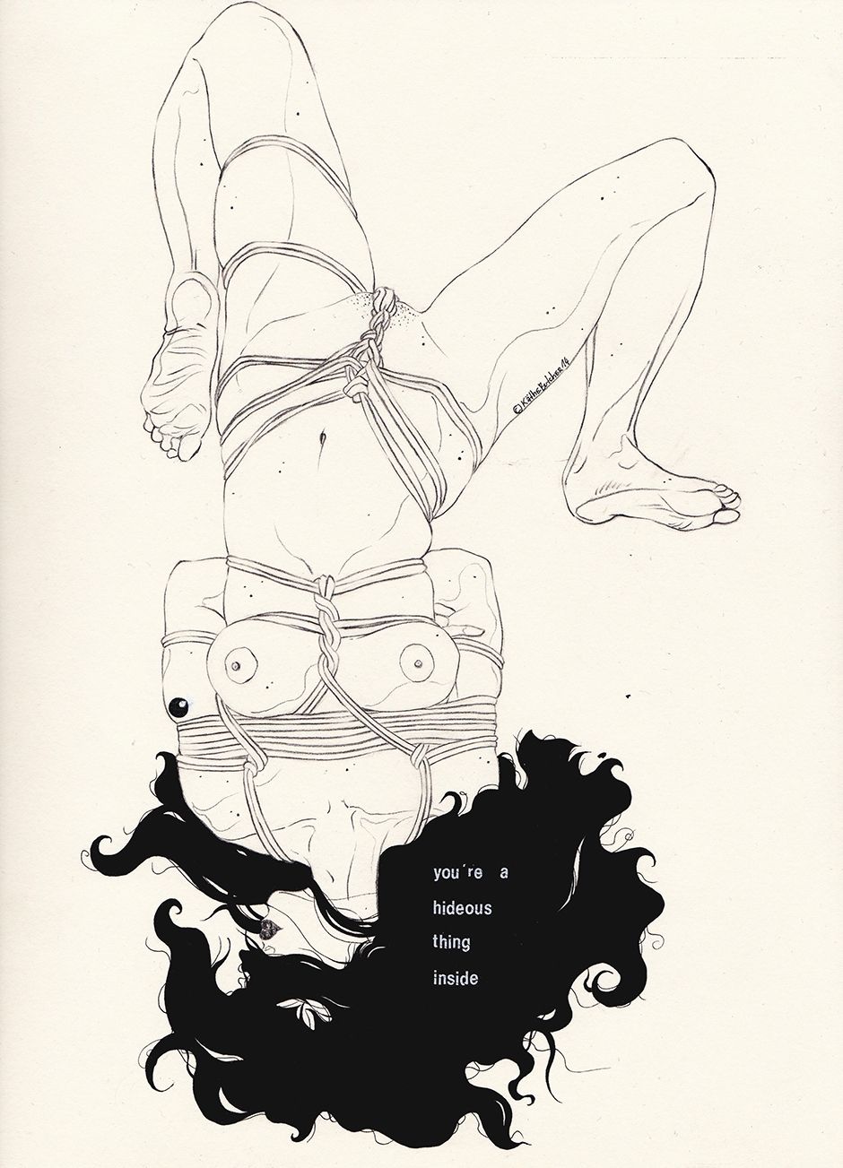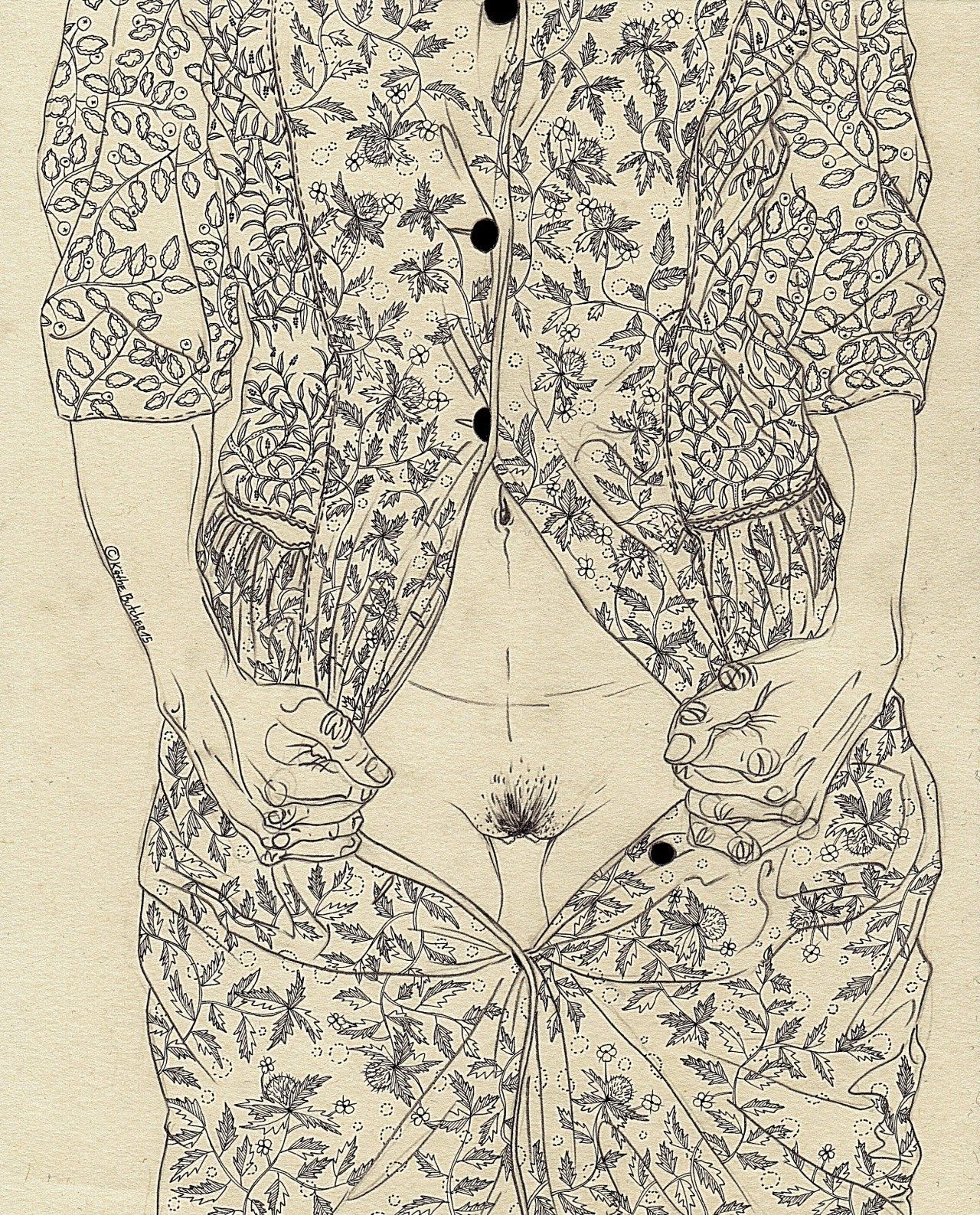 The artist describes her style as provocative, irreverent, a little bit melancholy and with structures and patterns reminiscent of the art trend of the Jugendstil. She always combines her drawings with a slogan, a sentence or a thought, and prefers female subjects of whom she underlines the grace of every angle of the body.