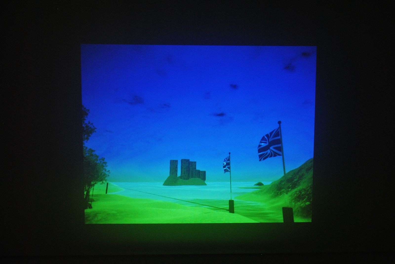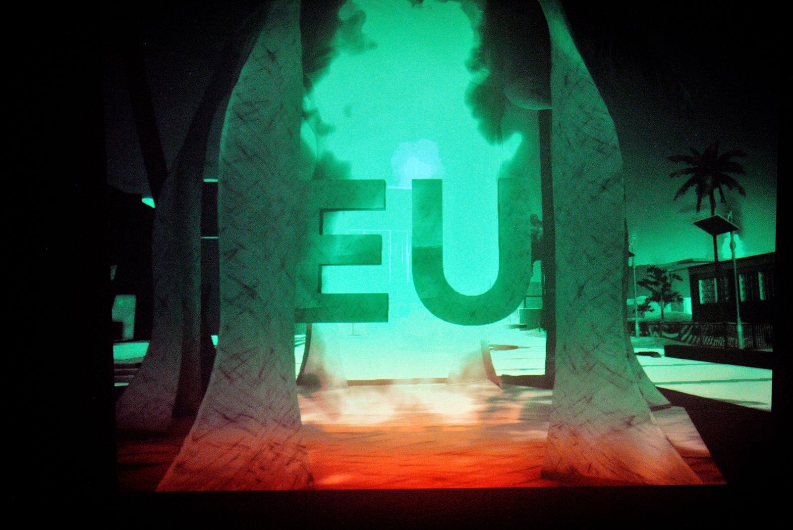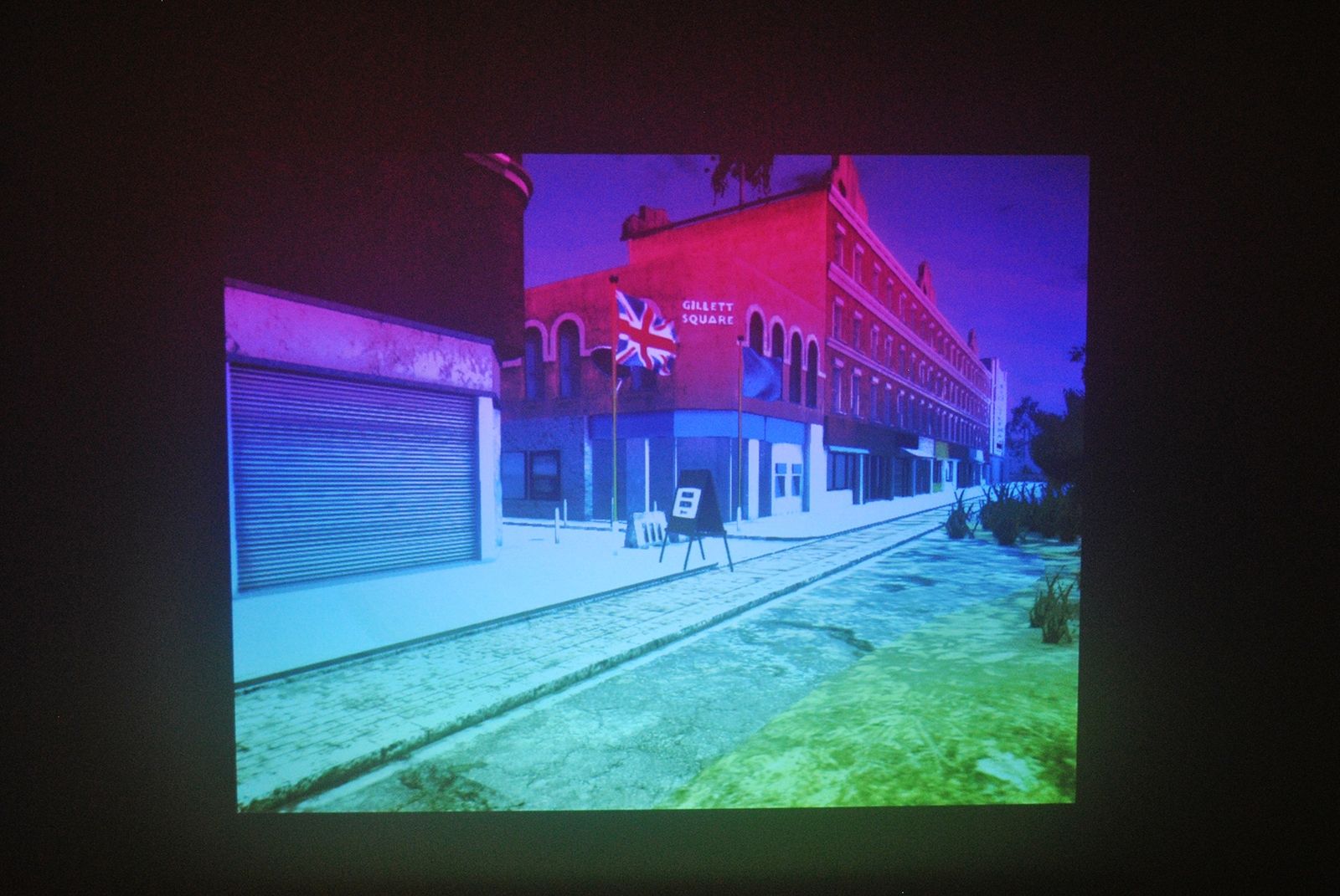 With the EU referendum, a theme that's as thorny as it’s current, as starting point, Lek projects, within an ironic and end extreme vision, the dramatic consequences of an United Kingdom where 'Leave' has won. By grabbing a XBox joypad we're catapulted in a futuristic post-apocalyptic Dalston that's smashed and drifting. The English flag stands out from every corner, marking the re-gained independence and a patriotic feeling that's dangerous as underpinned by mania of grandeur, war helicopters besiege Gillett Square and here, right in the center, the EU symbol is burning in flames, all while the voiceover extracted from Alain Resnais’ Hiroshima, Mon Amour speaks about the nature of memory.