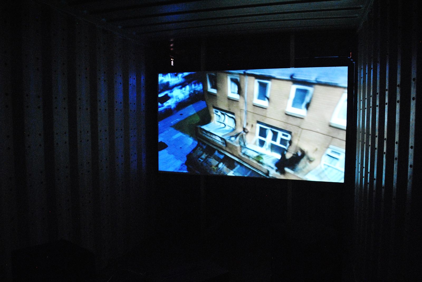 On this occasion, Muller has repurposed a drone as a 3D scan in order to craft his own version of a futuristic Dalston – a theme that's been proposed and reinterpreted by different artists throughout the festival. The video rendering shows us Gillett Square and its surroundings as a spectral and inhospitable scenery, where lined up houses and everyday objects locked in midair, frozen in space and time, float in a glitched-out cyber reality. Suspended cans, empty car parks, buildings that seem to liquefy at the camera's slow passage; then the nighttime, the darkness interspersed by some street light and by screams – that sound more like orders – breaking the silence, leaving who's watching with the unsettling feeling of being monitored, of imminent danger, paranoia and distress.