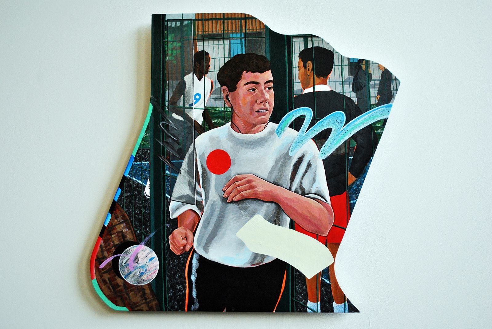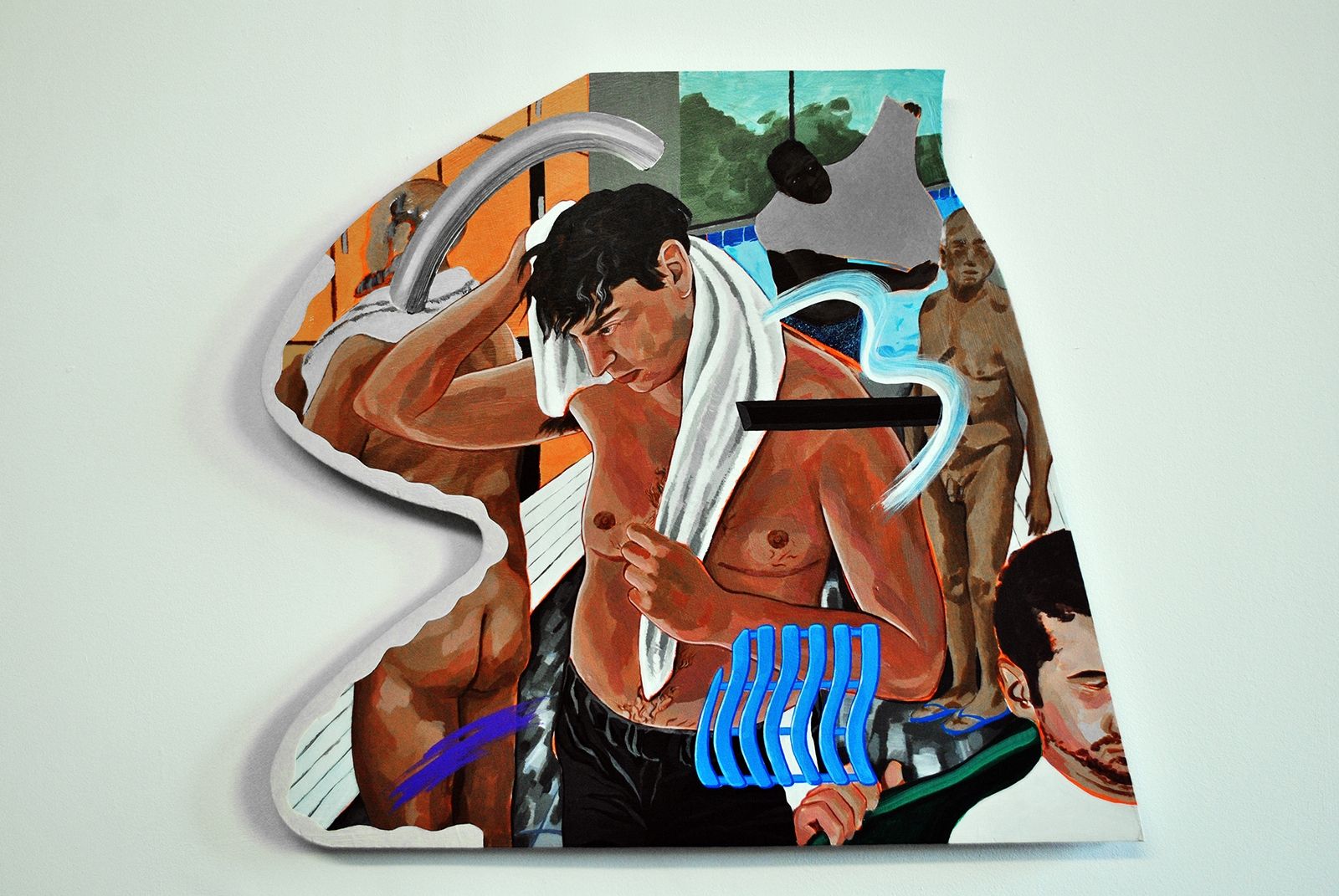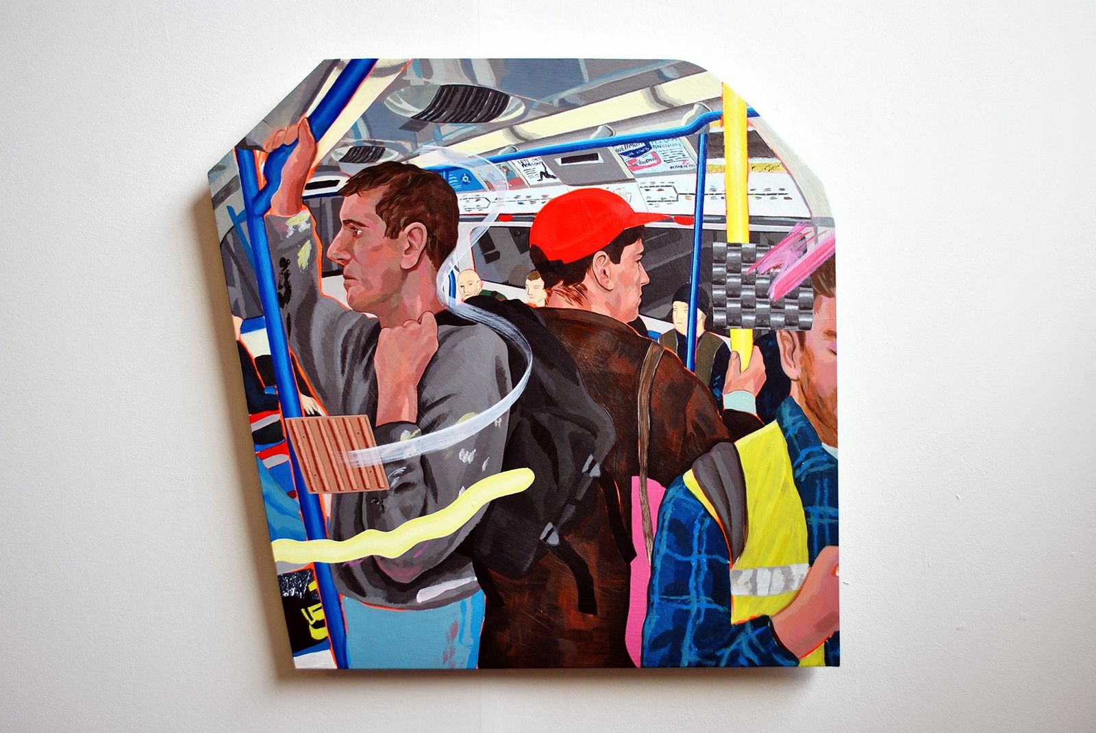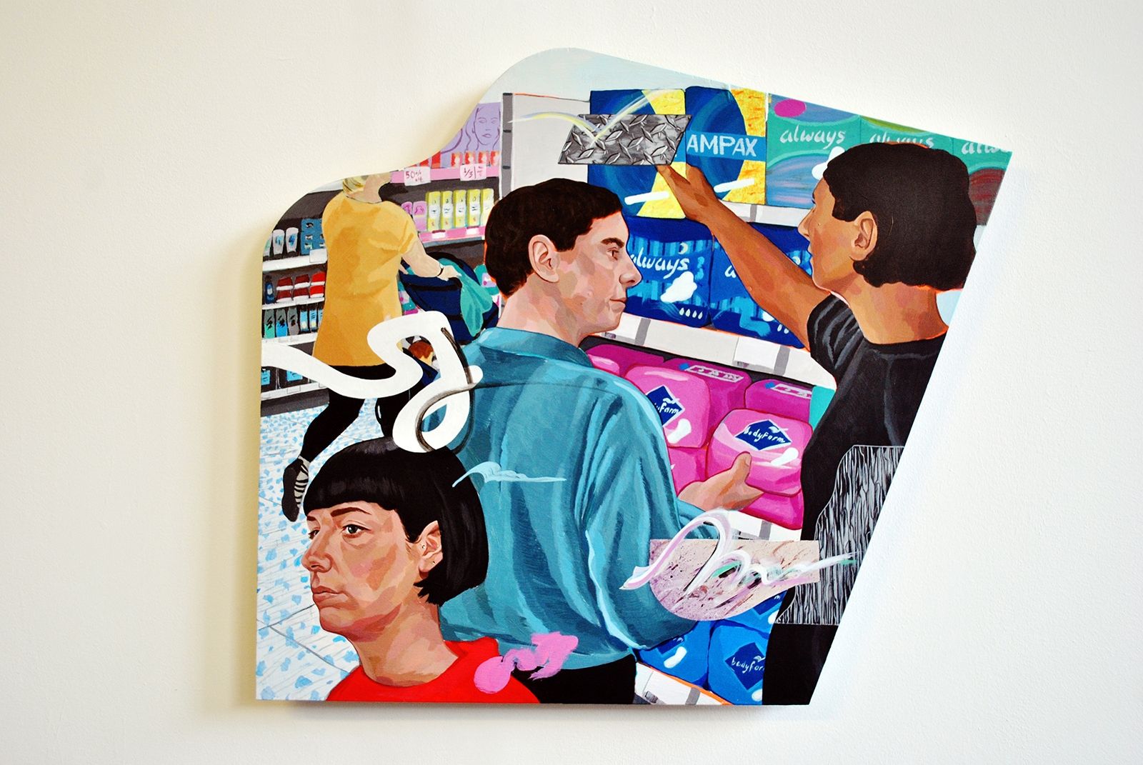 Whose Bodies Where, a series of paintings commissioned by Open Source, explores matters such as identity, the synergy between physical body and public spaces and, consequently, the way the latter's perceived by people of different genders and sexualities. The four paintings depict everyday moments such as buying tampons at the supermarket or a morning journey on the tube, and portray the ways people interact with those spaces and how these are shaped by a system of privileges and prejudices, pointing out at public spaces being ill-equipped to deal with the many shades of gender expression.