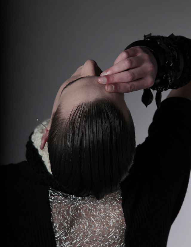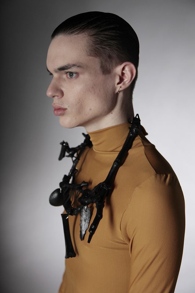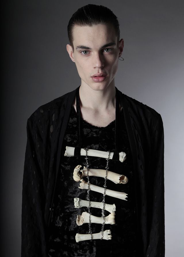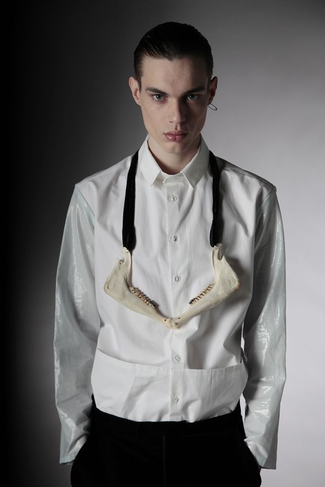 Lunghe maglie in pelliccia, accompagnano accessori primitivi fatti di ossa e conchiglie, tenuti insieme da lacci e fili di pelle, che abbracciano la figura. Un lancio deciso in una sfera ambivalente, che unisce la malinconia alla voglia di rinnovarsi, attraverso sperimentazioni su basi salde e consolidate, quali cardigan bon ton e shorts collegiali. Intrecci a catena si stagliano su sciarpe a collana, mantelle e over pulls che svelano l’uomo piuttosto che coprirlo. Vince così il fascino del nascosto, il saper cogliere il luccichio nell’ombra, la purezza nel trash e la delicatezza nell’apparire.