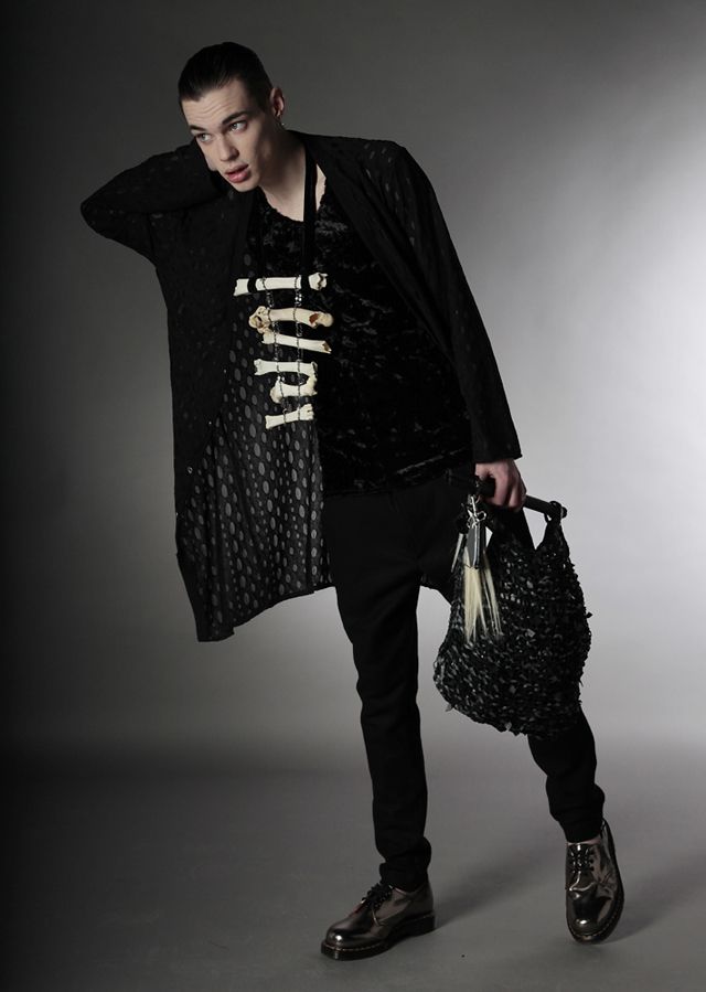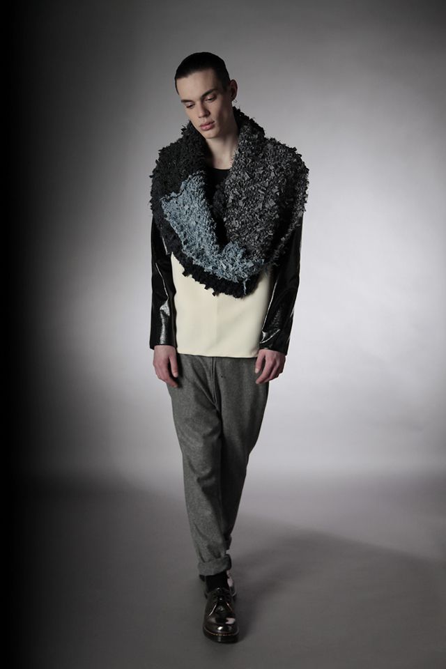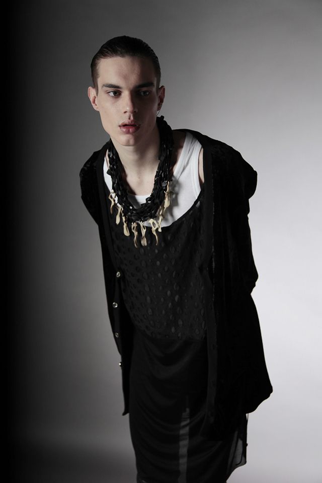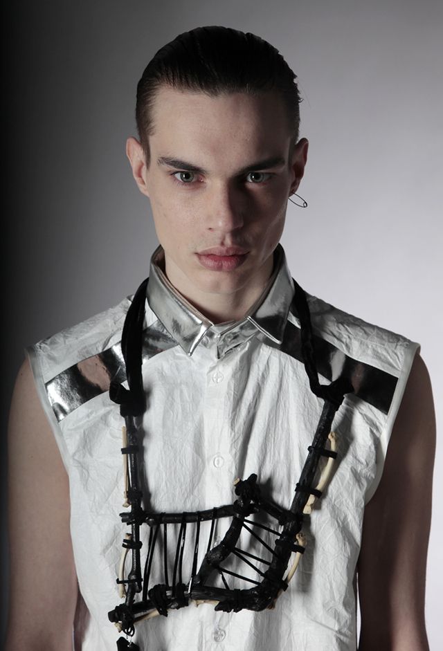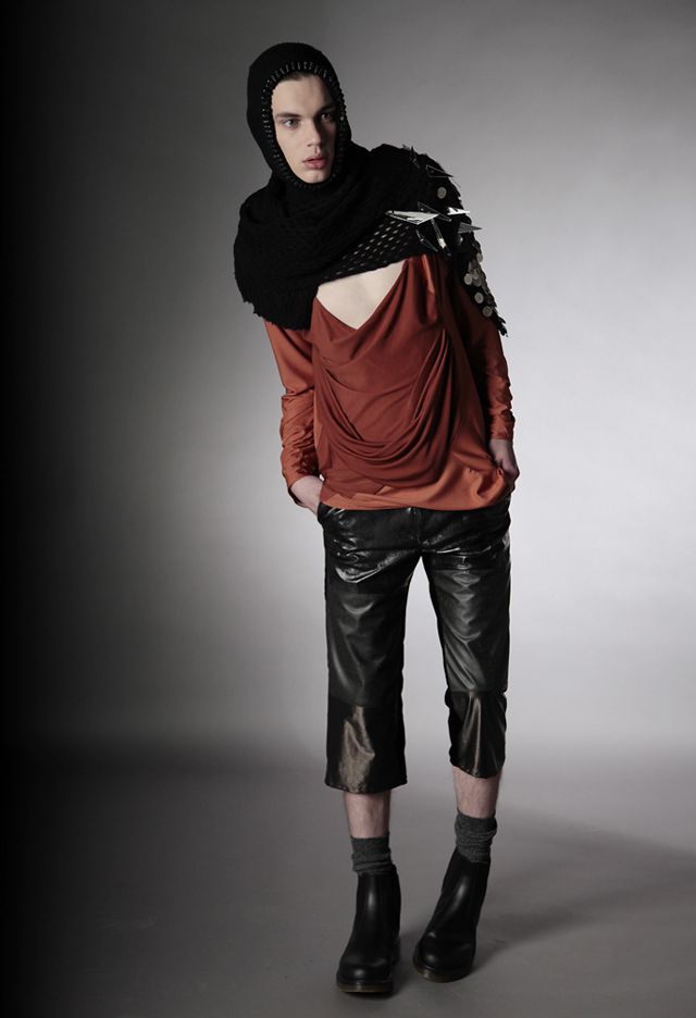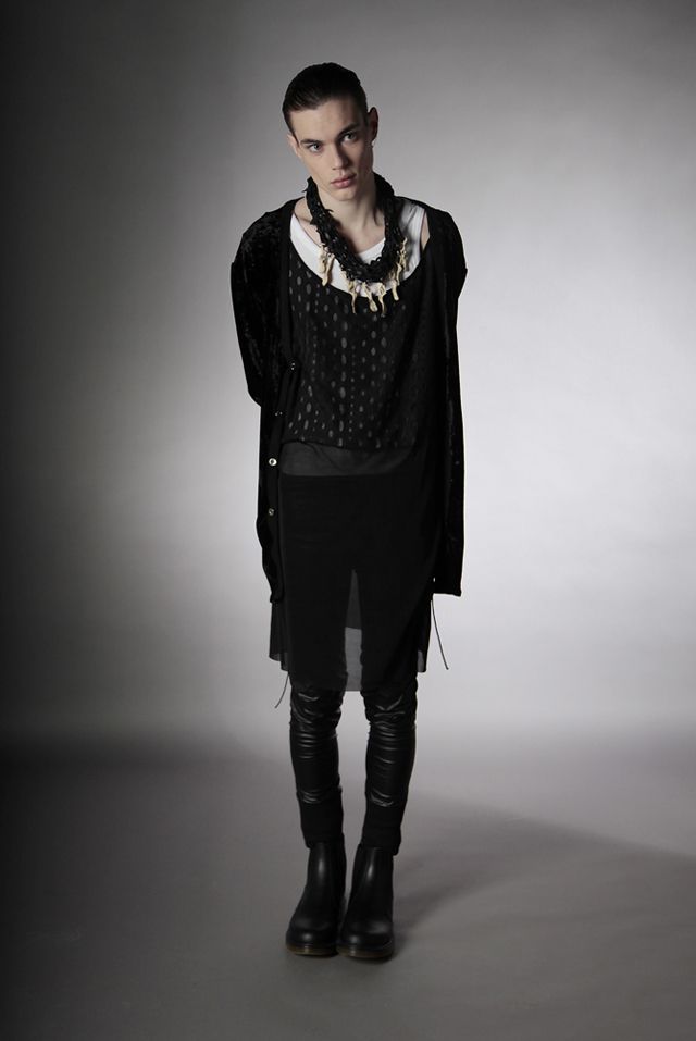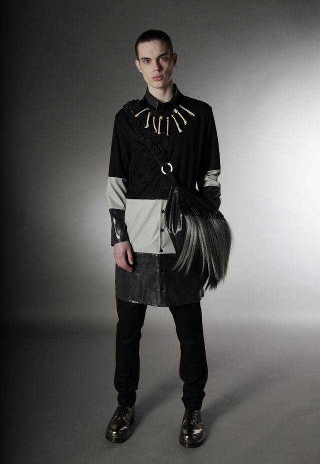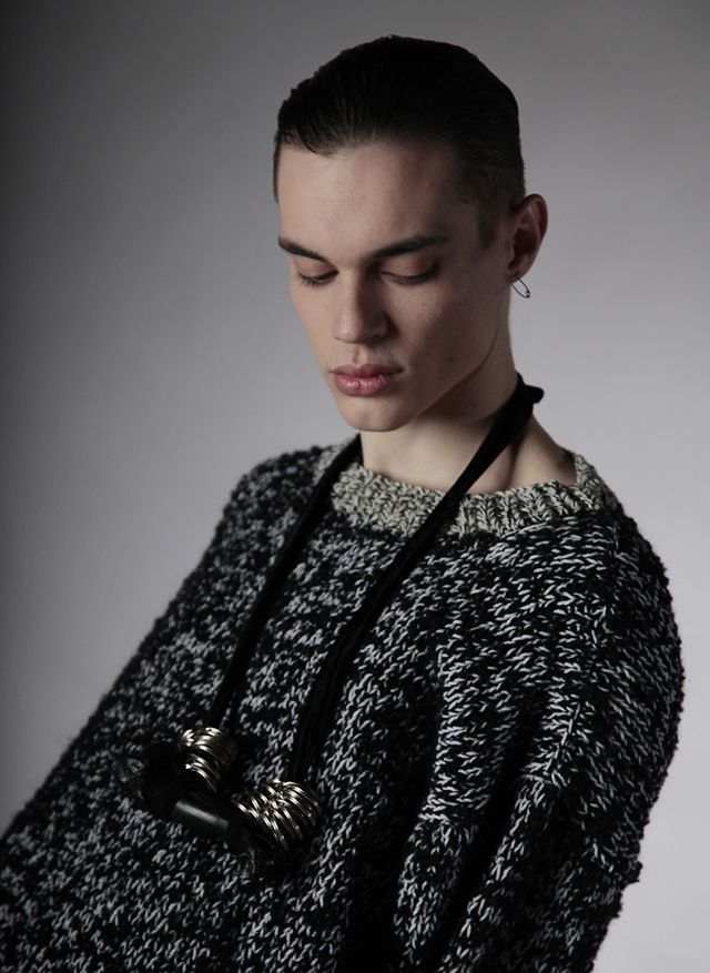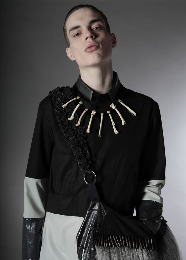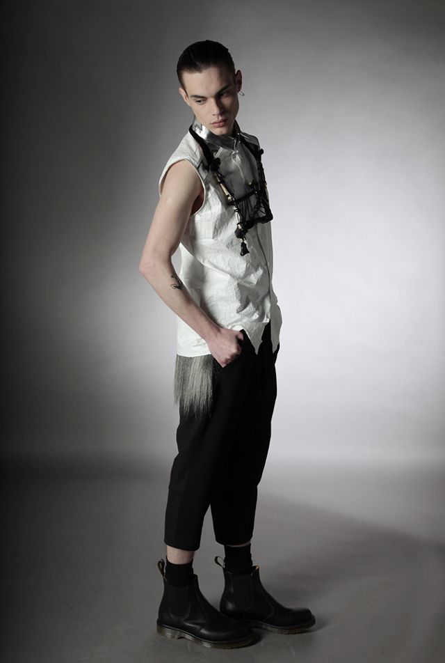 Long furs shirts, join together with primitive accessories made of bones and shelves, laced up with leather yards, that hold the figure. A leap in an ambivalent dimension, which links malancholy and the desire of new, trought experiments upon firm basis like bon ton jumpers and schoolish shorts. Chain’s structure are expressed in ring scarfs, cloaks and over pulls, which expose man instead of cover him. The victory is within the charm of the hidden, the ability of seeing shinig light within shadows, purity in trash and kindness in striking.