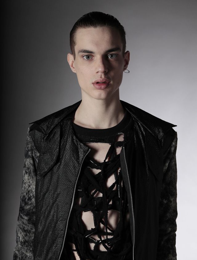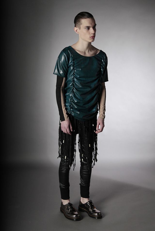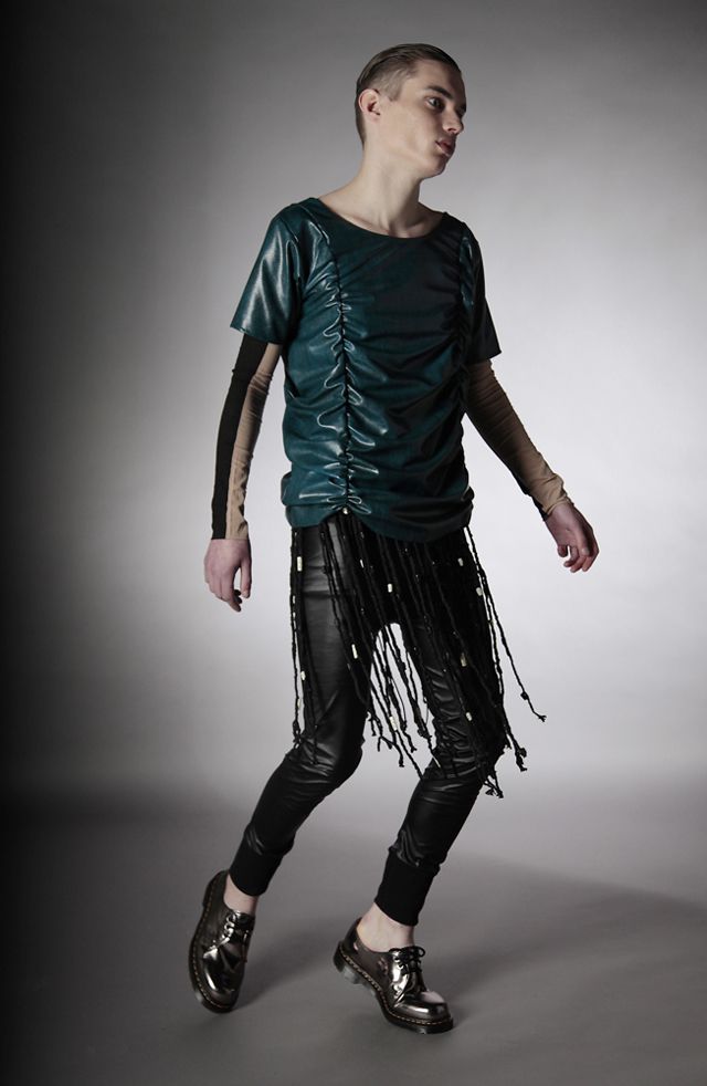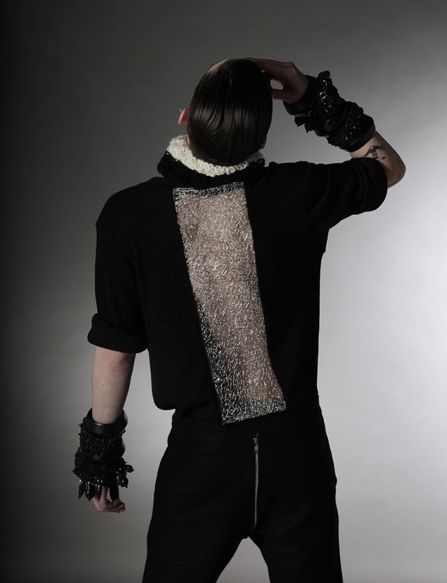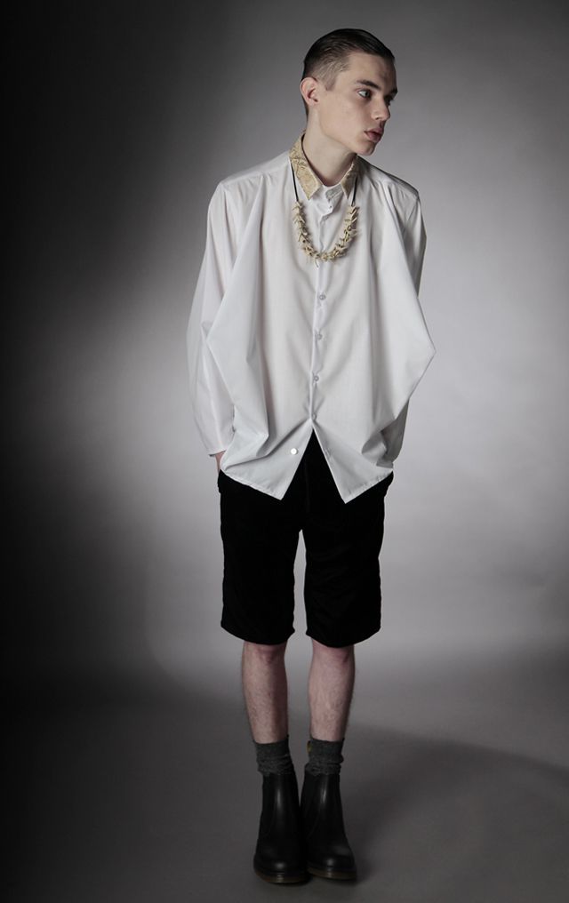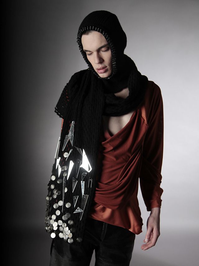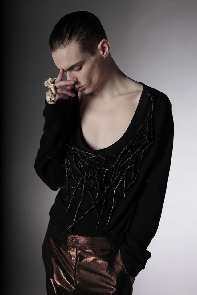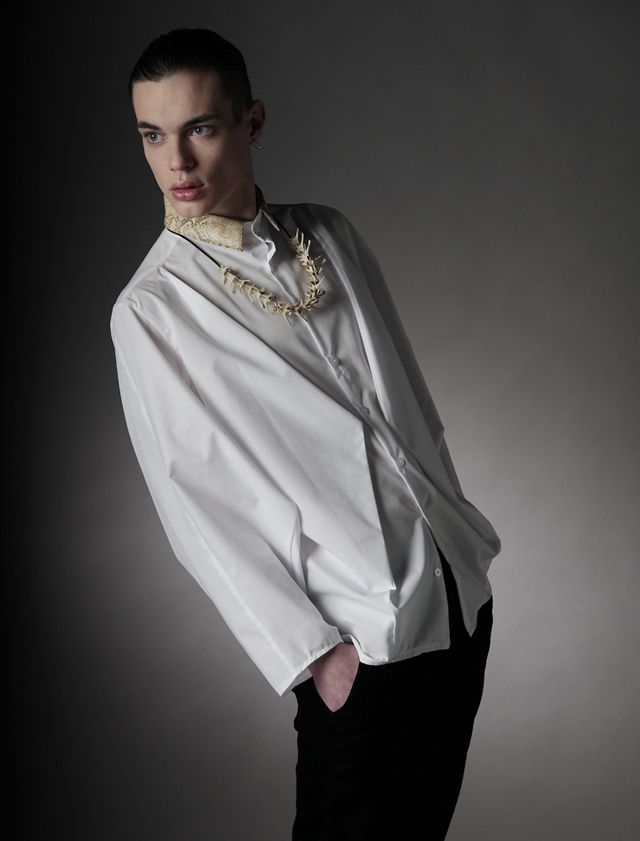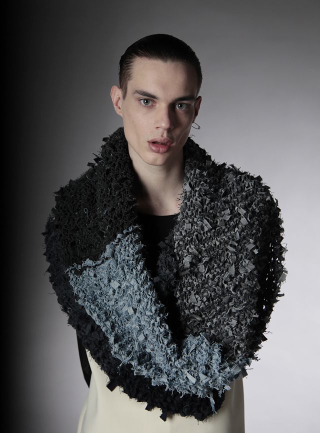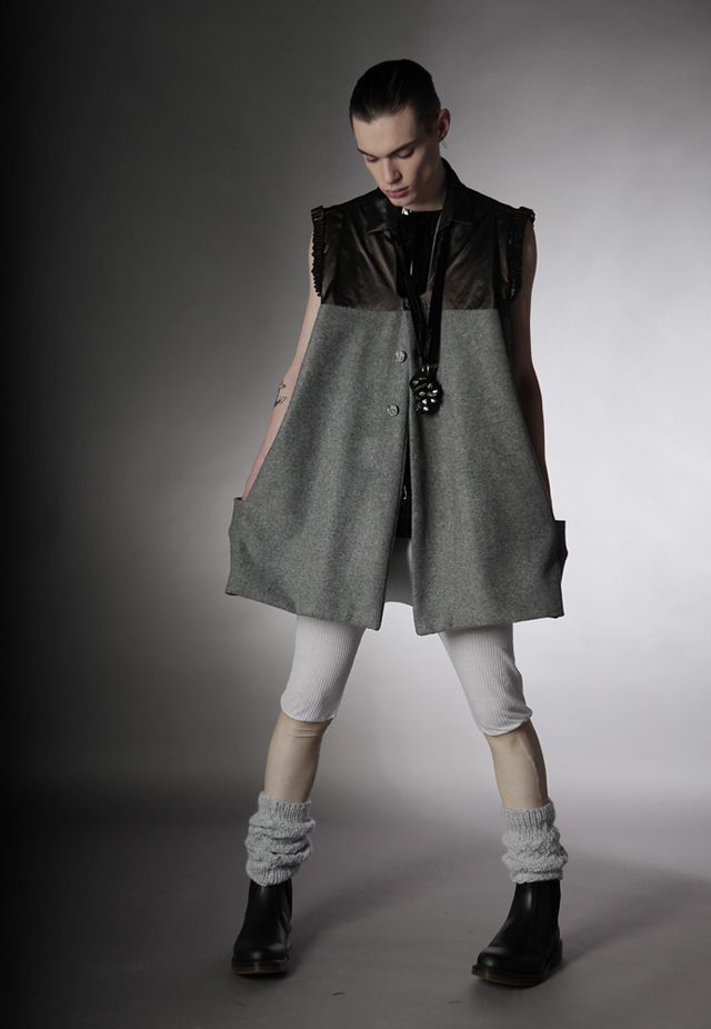 Long furs shirts, join together with primitive accessories made of bones and shelves, laced up with leather yards, that hold the figure. A leap in an ambivalent dimension, which links malancholy and the desire of new, trought experiments upon firm basis like bon ton jumpers and schoolish shorts. Chain’s structure are expressed in ring scarfs, cloaks and over pulls, which expose man instead of cover him. The victory is within the charm of the hidden, the ability of seeing shinig light within shadows, purity in trash and kindness in striking.