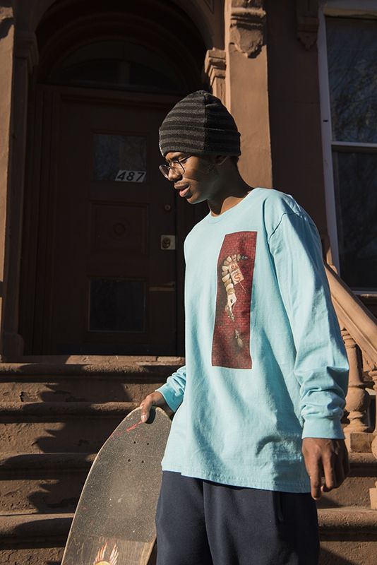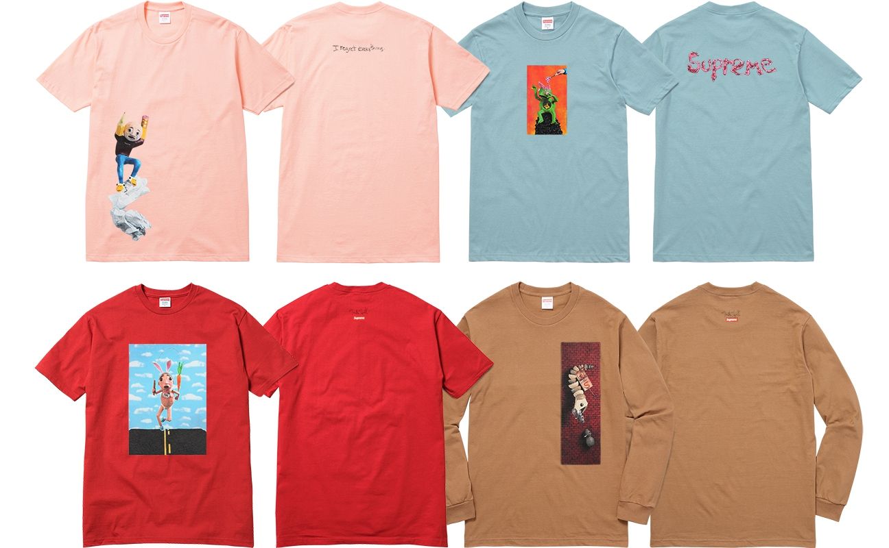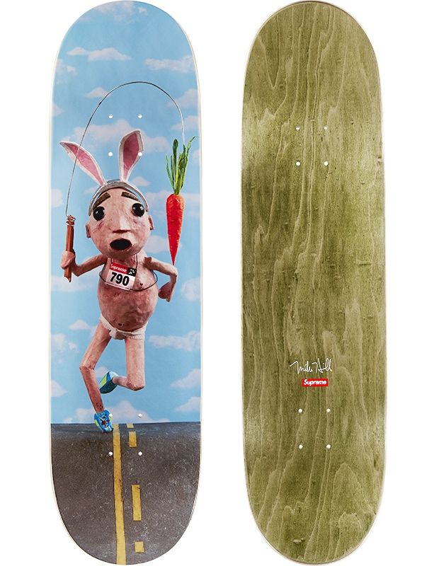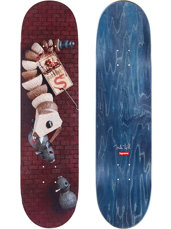 For this collaboration, Mike Hill and Supreme presented four original designs on three different T-shirts color options, a brown long-sleeved top and four skateboards decks.