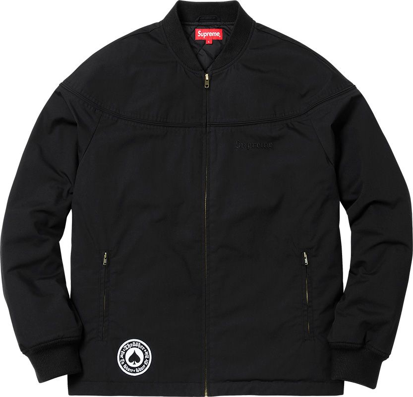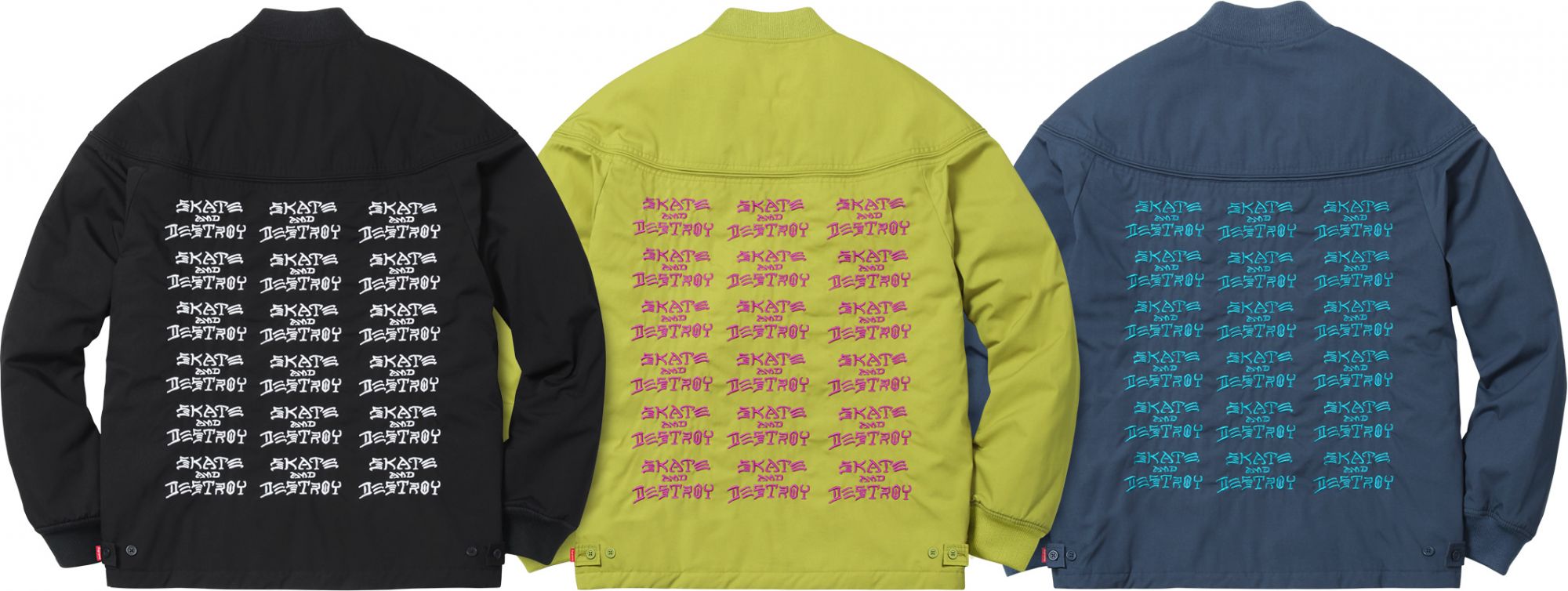 Skate and Destroy is the lettering sewn on almost all of the garments presented this morning by Supreme for its third capsule collection in collaboration with Thrasher Magazine.