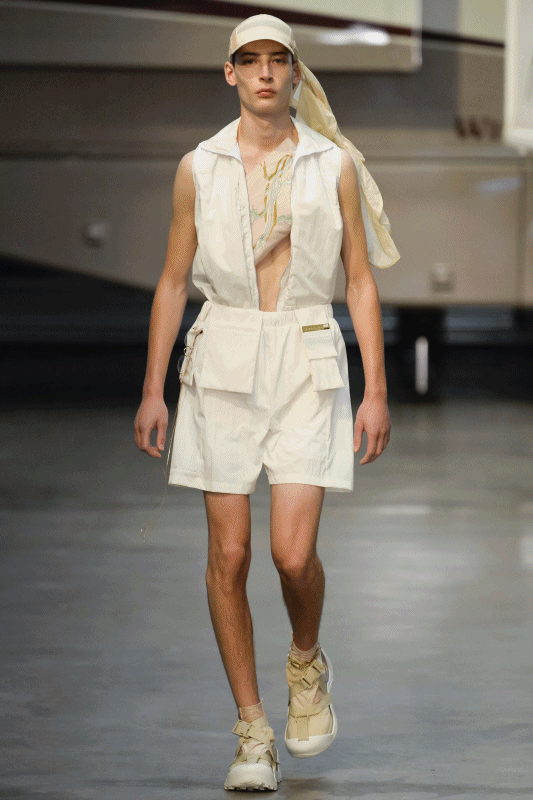 Mermaid Puddle Dock. Xander Zhou presents his menswear collection for the next spring-summer, a reworked proposal in futuristic wardrobe style. In his hands garments designed to dress the ordinary, a certain atmosphere of boredom and softness, are transformed into hints of tomorrow, in the ideal wardrobe of supernatural, extraterrestrial creatures. The classic shirt and tie of office uniform evolves: shirts take abstract cuts that highlight naked flesh, denim trousers or padded heavy cotton, black rubber sections sewn on trenches and jackets, synthetic gloves, underwear worn over clothes, belts full of pockets, layered garments worn one over the other. The Chinese designer takes on the uniforms of our everyday life and gives them a sci-fi, robotic touch, but without excessive drama. Just a hint of batik, a bit of color, a wrinkled fabric to return humanity to the entire collection.
