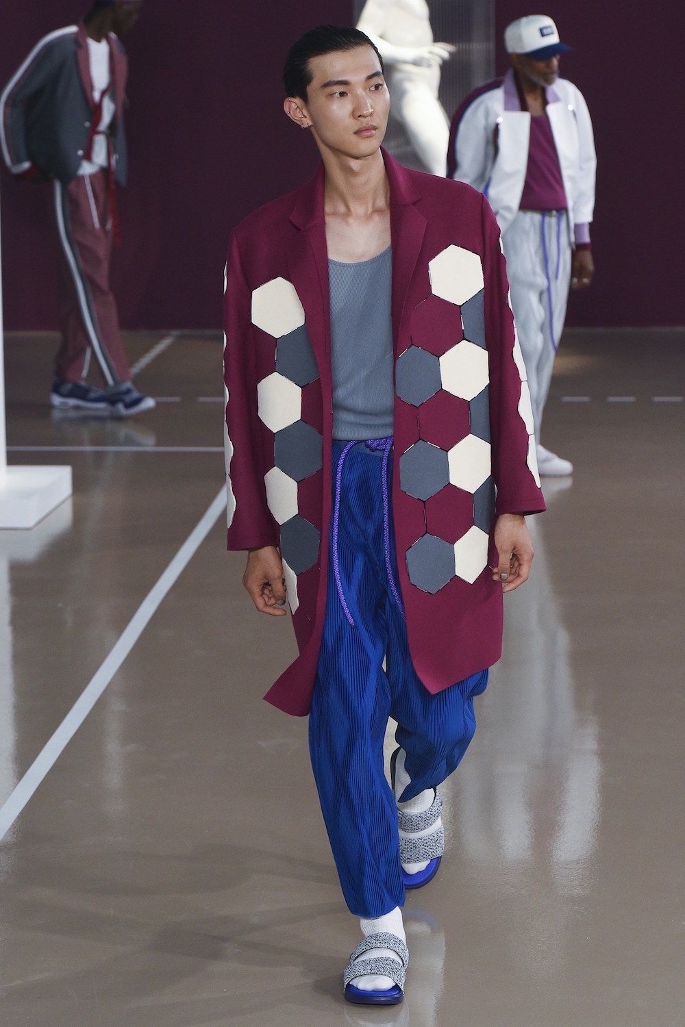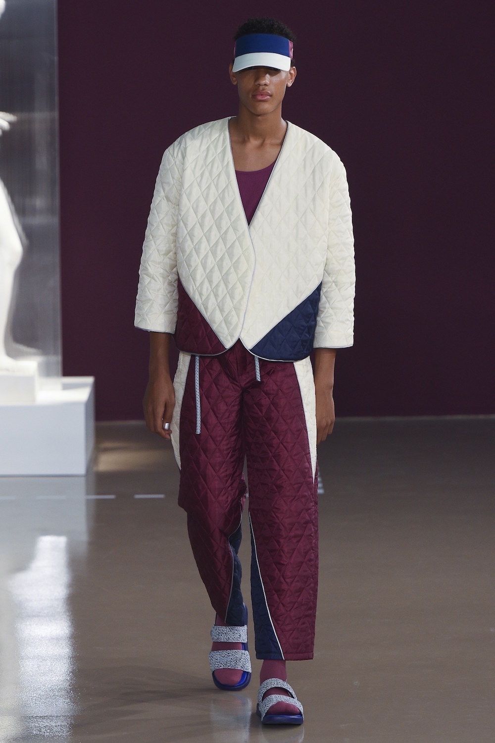 Iridescent and transparent fabrics play with the volume of silhouettes and with the addition of 3D elements and color accents, combinations of faded blue, cream and raspberry, a sort of tribute to the French flag, depicted in geometric motifs. Graphic pieces, unisex, perfect for both women and men, such as color-block suits, quilted vest, bomber and long jackets.