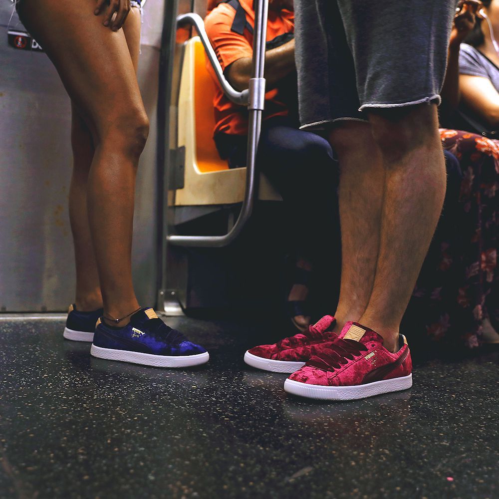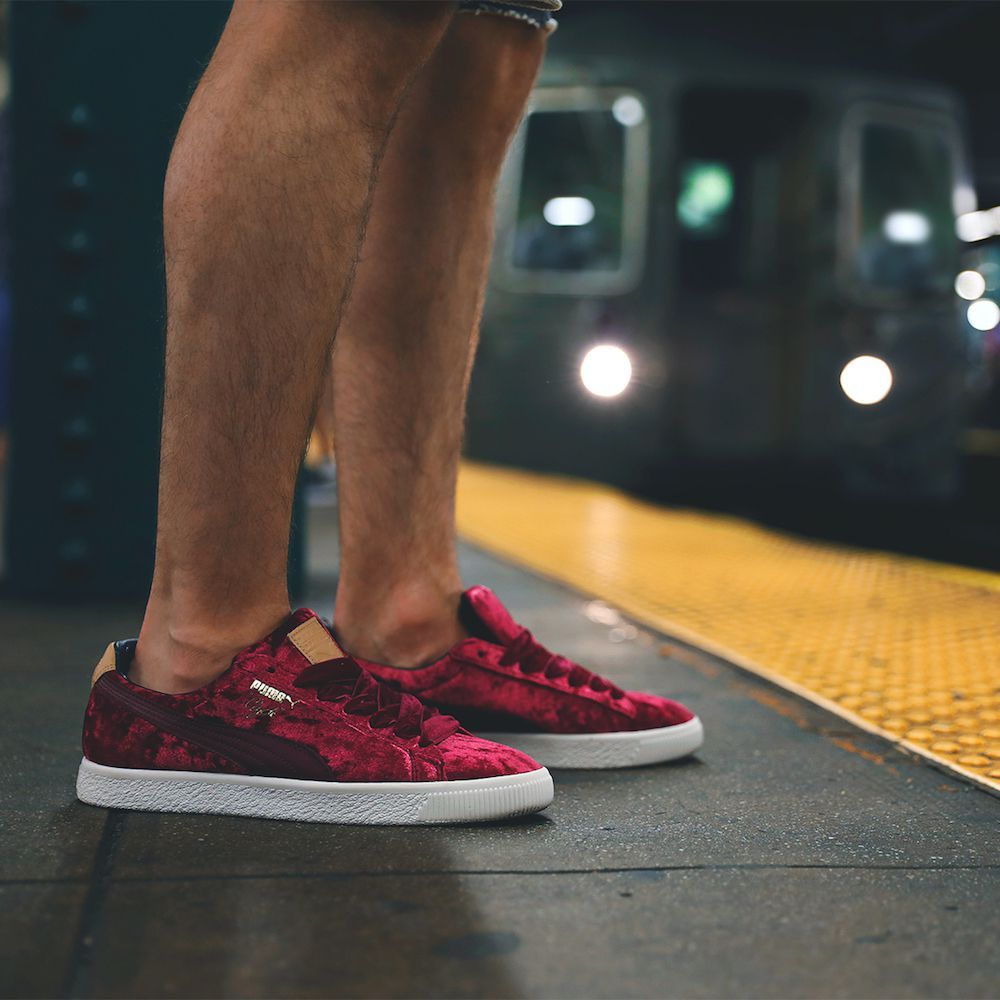 The result is an edition of the Puma Clyde velvet made in two colors, Cabernet and Peacoat, with leather details on tongue and heel, and translucent ice-sole with an Extra Butter print.