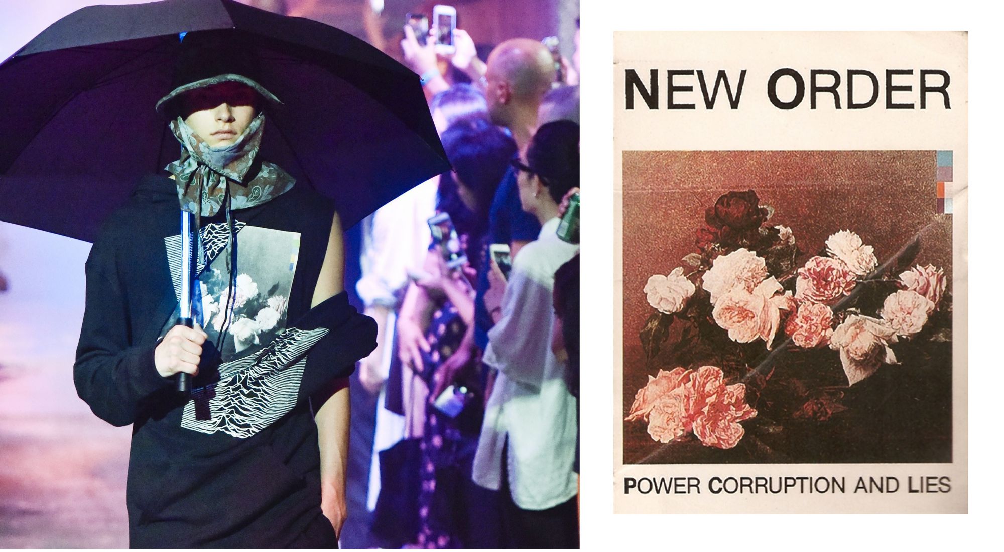 Complete the neo-dip in the distro-Oriental style with the words “REPLICANTS” and, hanging on the ceiling, Chinese lanterns decorated with references to the covers of Joy Division and New Order albums by Peter Saville, Simons myth and author including the new Calvin Klein logo.