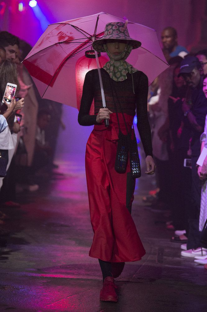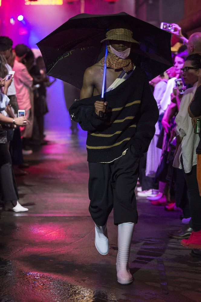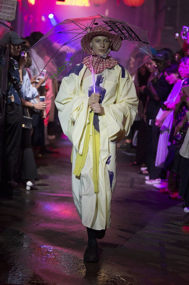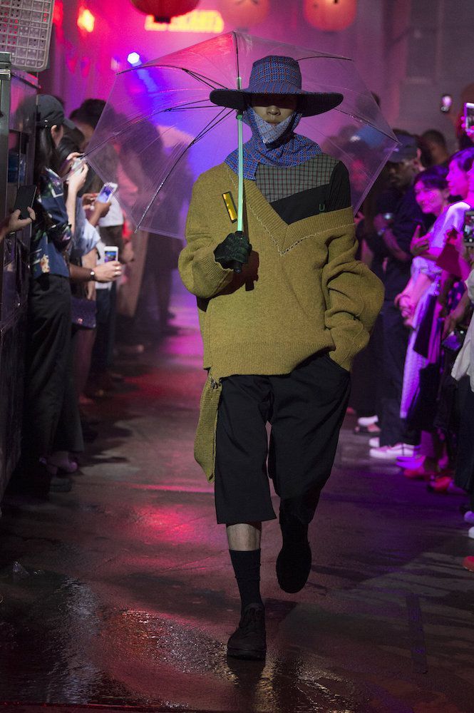 Simons chooses as a set for his show a glimpse that appears to have emerged from the cult film Blade Runner: a courtyard under a bridge in the Lower East Side where carts of a typical Chinese night market distribute Tsingtao beer and Fiji water to the public exhausted from the heat and from waiting.