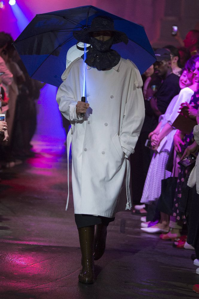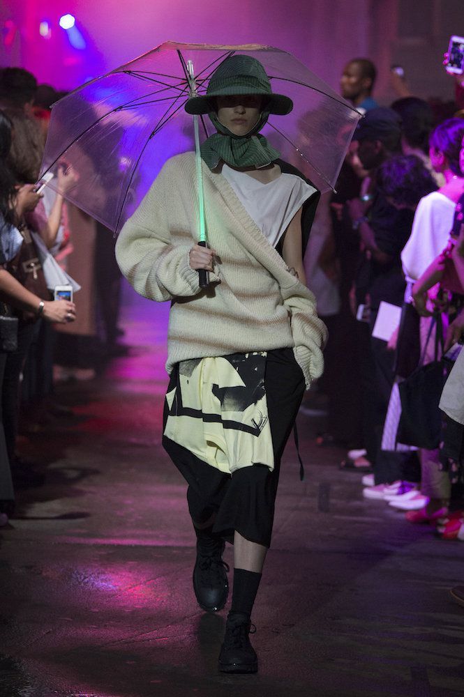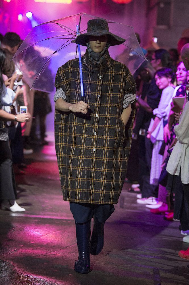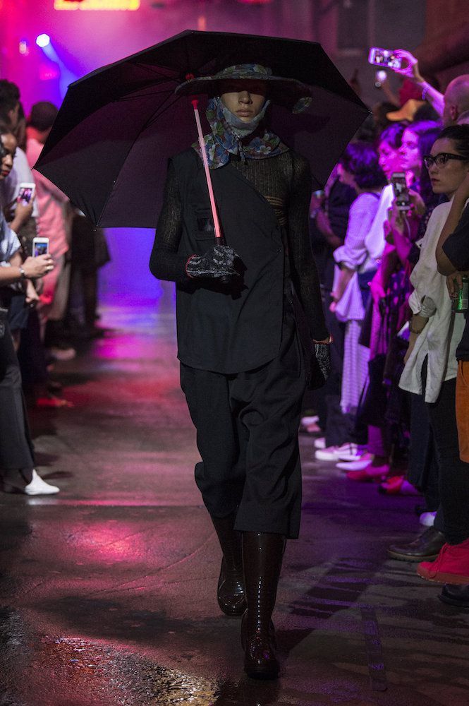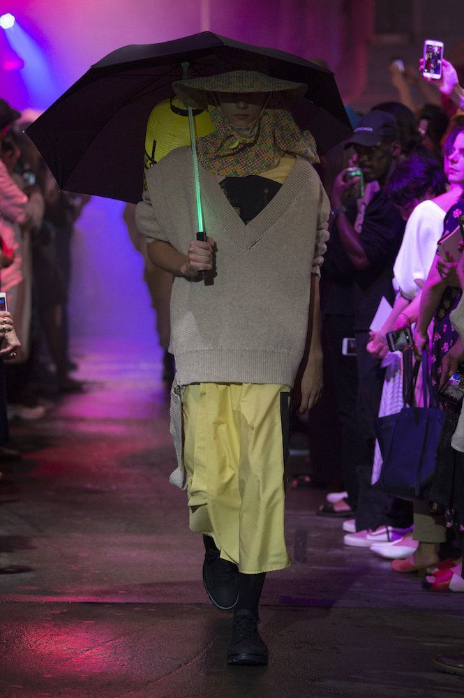 Only Simons is able to find an interesting and cool answer: long trenches, sometimes worn backwards, which seem to be taken from the wardrobe Deckard-Ford; oversize track suits with bright and metallic shades; sleeveless jackets with elasticized ends; light sarongs worn instead of pants; suites with jackets rolled sleeves and culotte style pants; sweaters over the V-neck; wide-brimmed hats in floral print scarves pendant and rubber boots like those worn by municipal workers and Japanese fishermen.