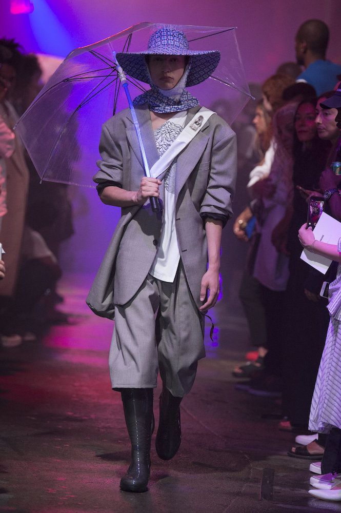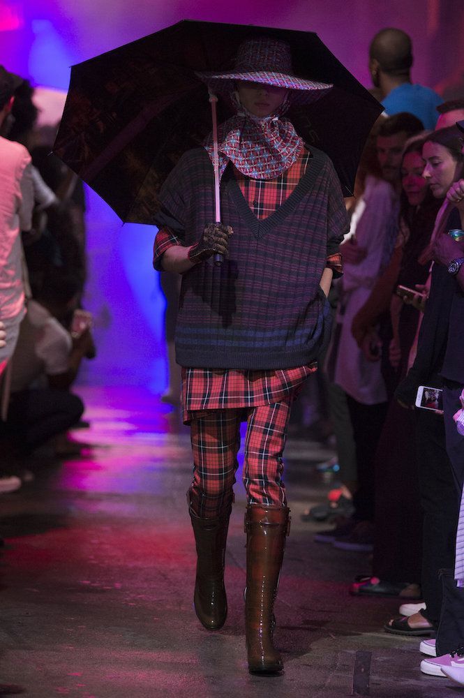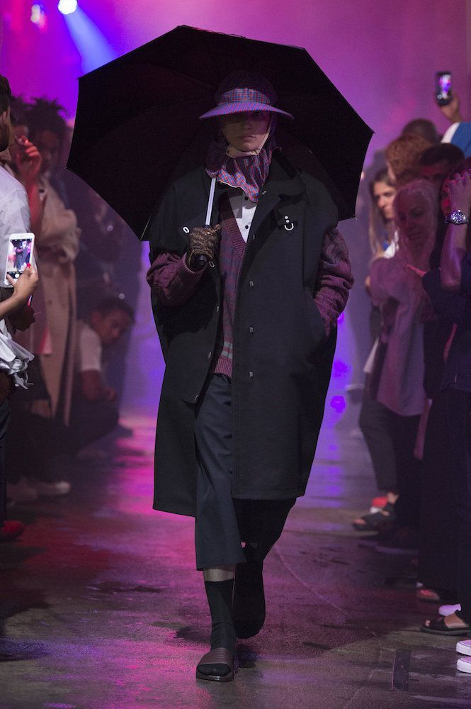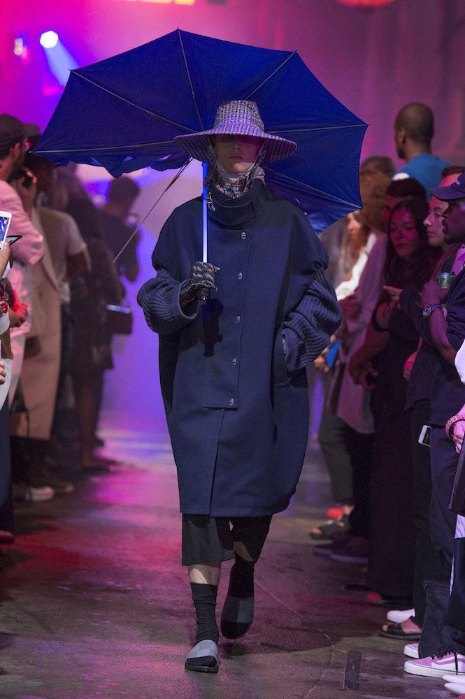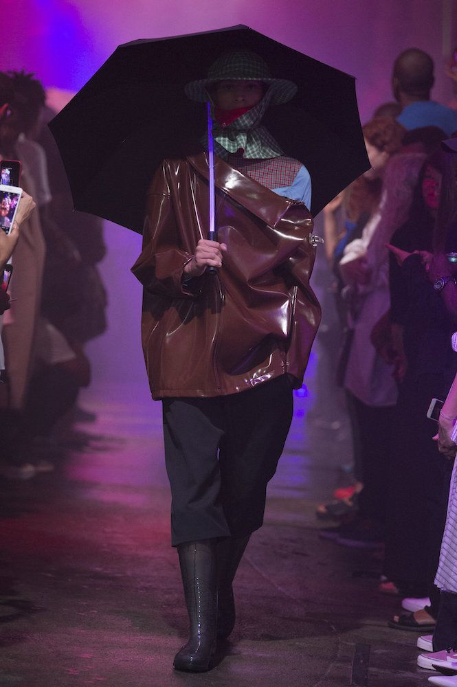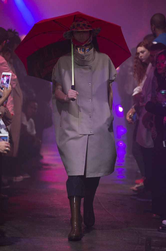 Only Simons is able to find an interesting and cool answer: long trenches, sometimes worn backwards, which seem to be taken from the wardrobe Deckard-Ford; oversize track suits with bright and metallic shades; sleeveless jackets with elasticized ends; light sarongs worn instead of pants; suites with jackets rolled sleeves and culotte style pants; sweaters over the V-neck; wide-brimmed hats in floral print scarves pendant and rubber boots like those worn by municipal workers and Japanese fishermen.