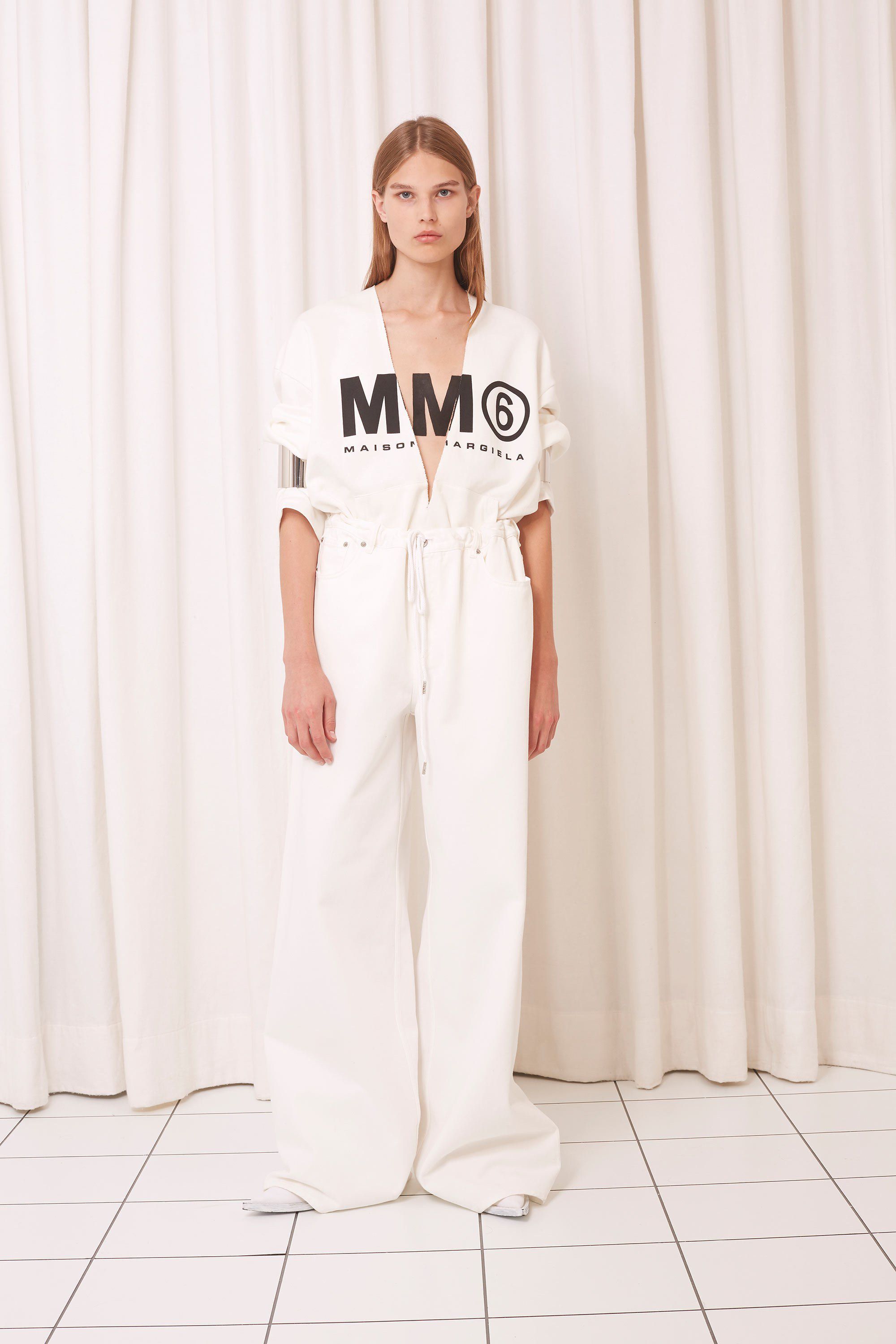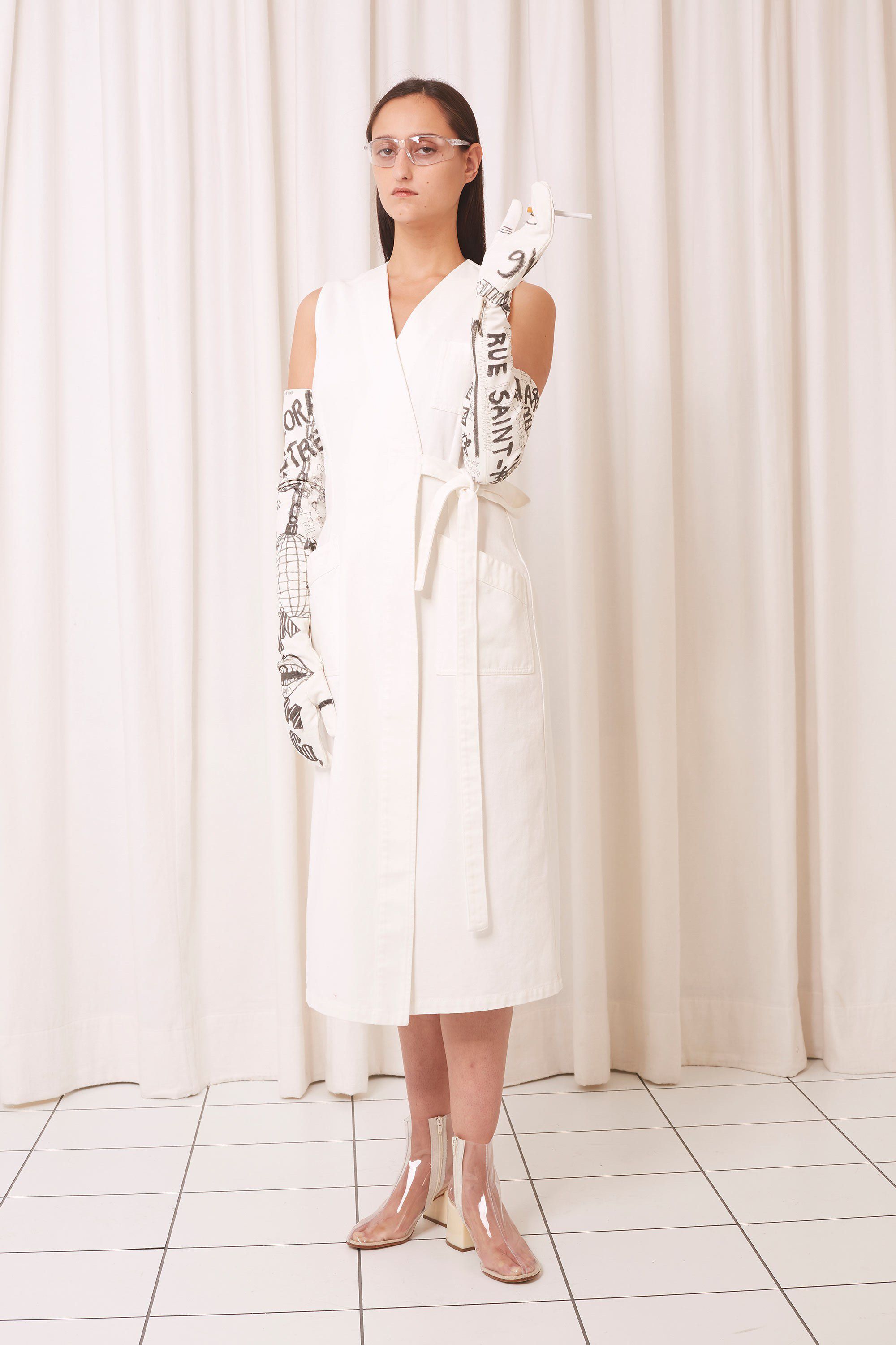If the presentation is unusual, the collection respects the androgynous and deconstructed style that has led to Martin Margiela's success. Materials such as plastic, cotton, denim cleverly mixed and matched to a white-dominated palette, broken off by combinations of offsprings, honeycomb prints and strips, and the black graffiti mix, the same ones that cover the walls of the location event.
