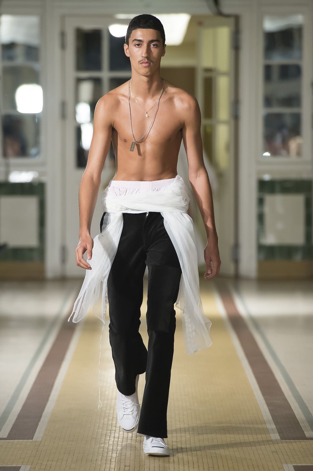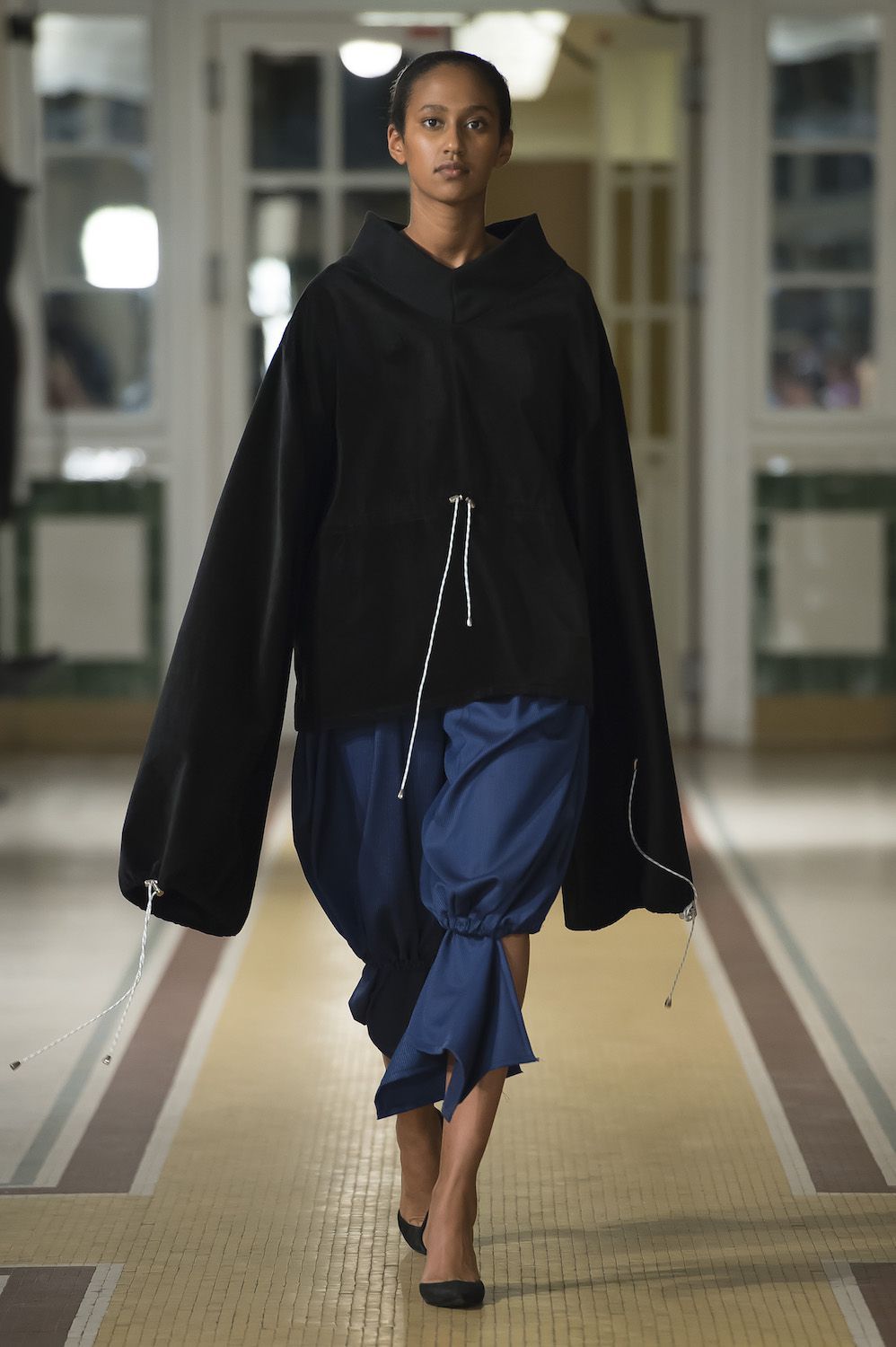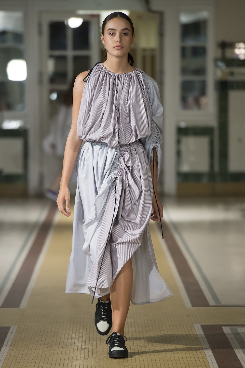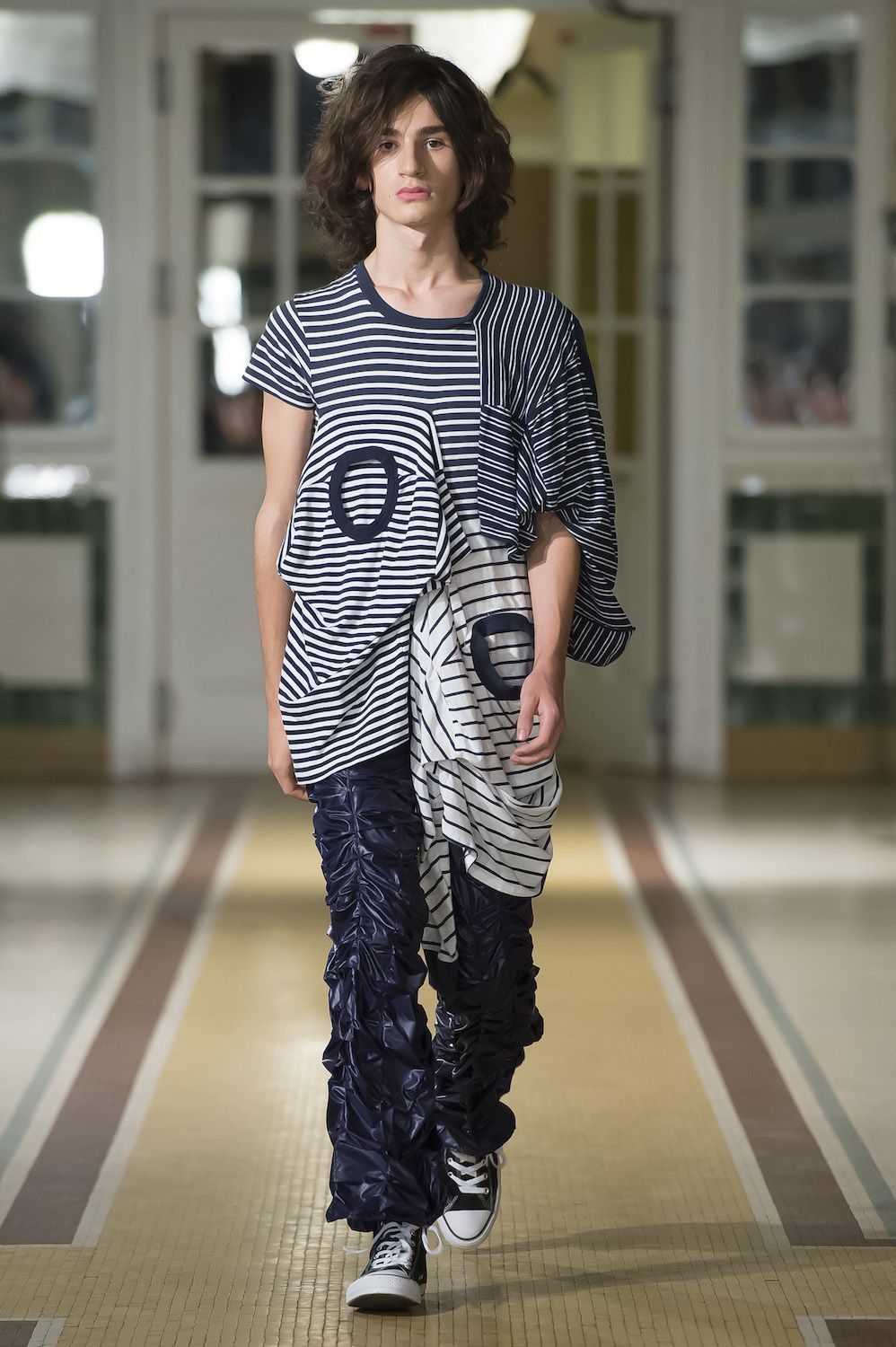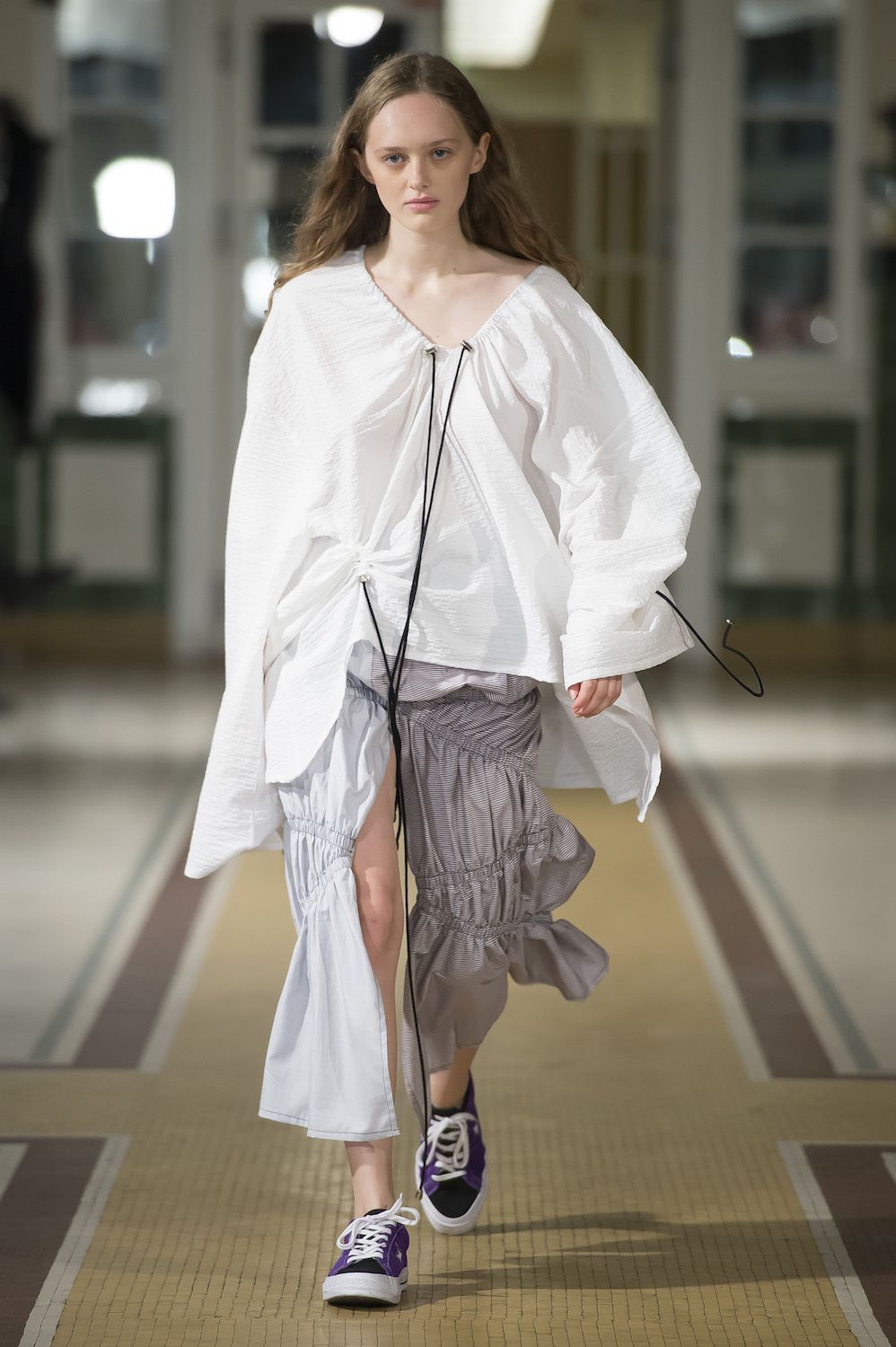 The result? A collection that abolishes the border of the genre and where each look is a one-off, independent from the previous and the next, a unique expression of a huge creative passion. Pants embellished with rouges, oversized pieces alternating with cropped garments and dresses shaped by drawstrings for an as harmonious as chaotic and wonderful mix between urban and sport style.