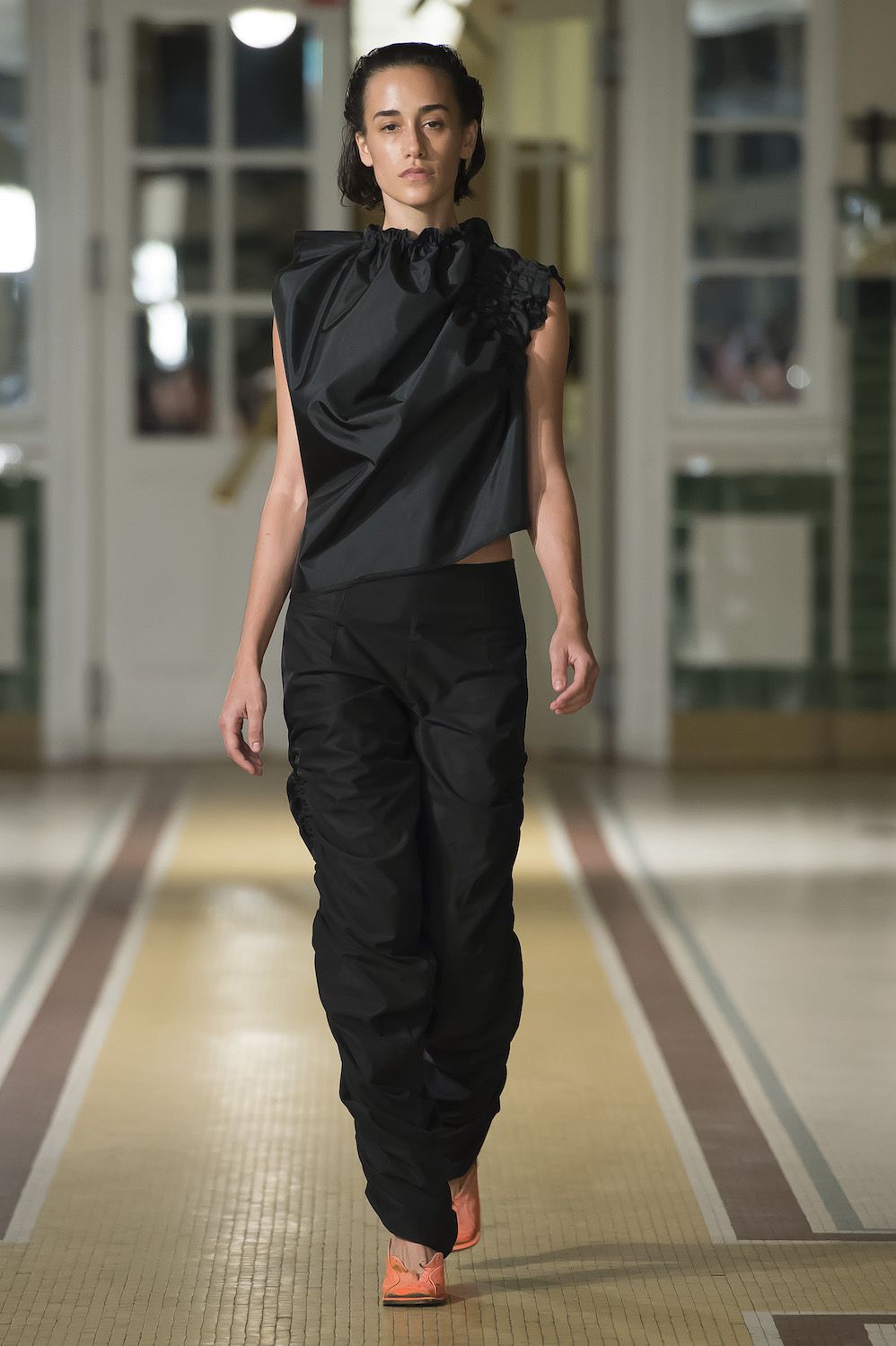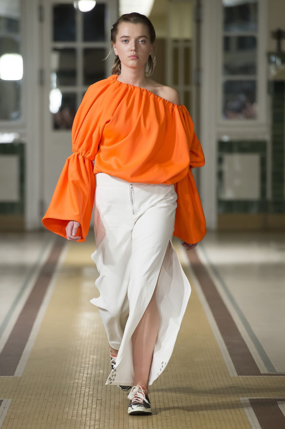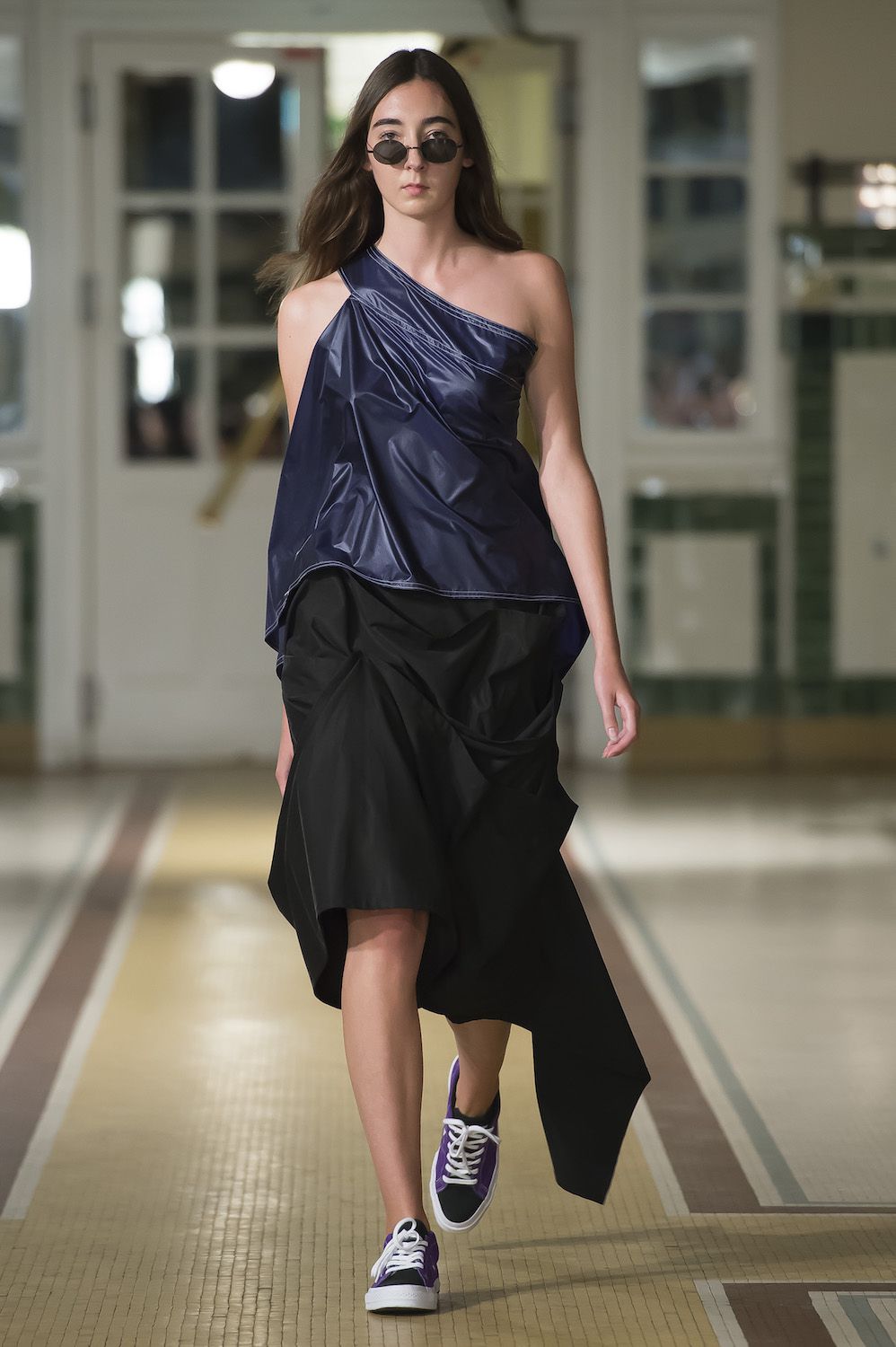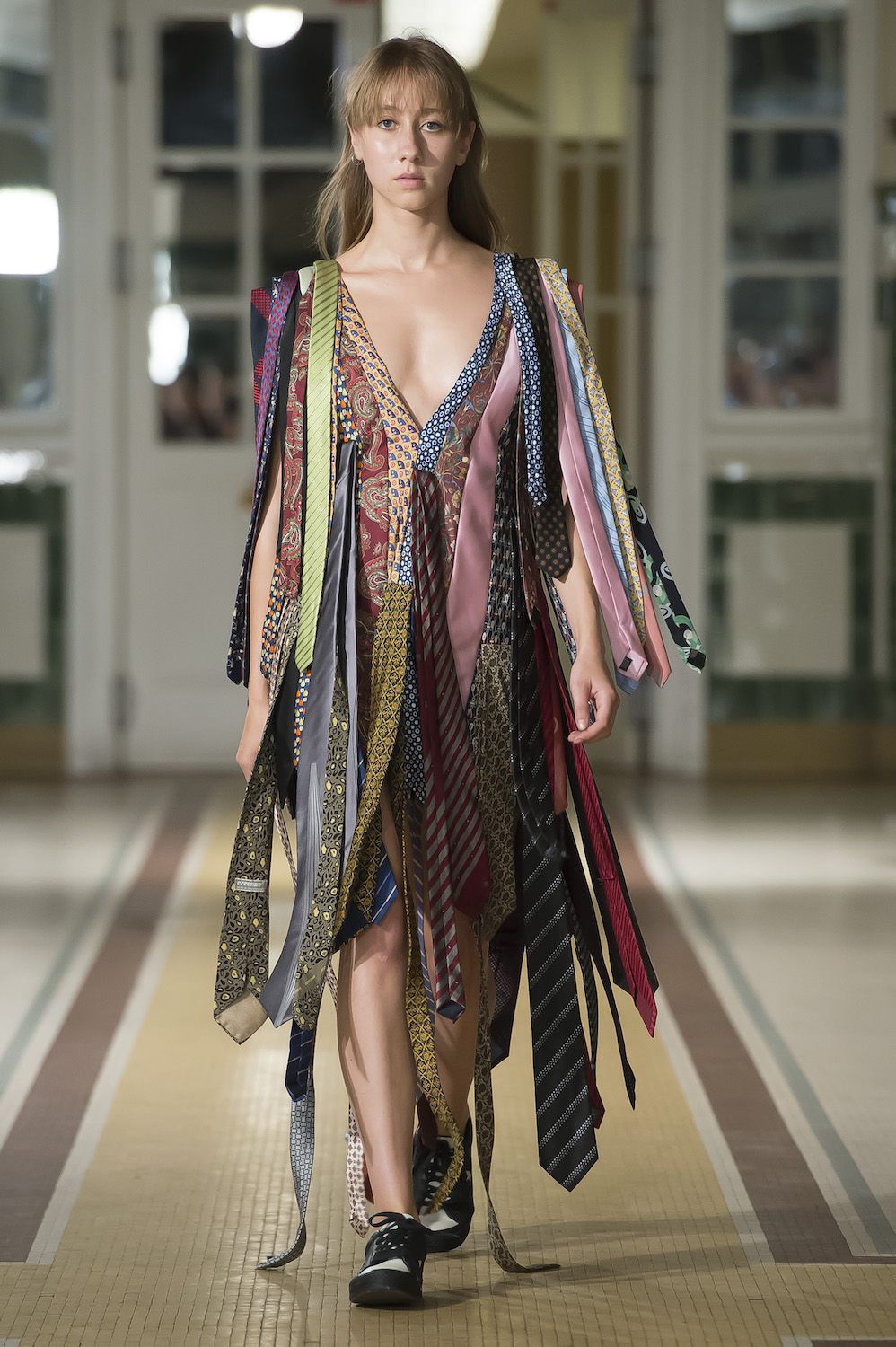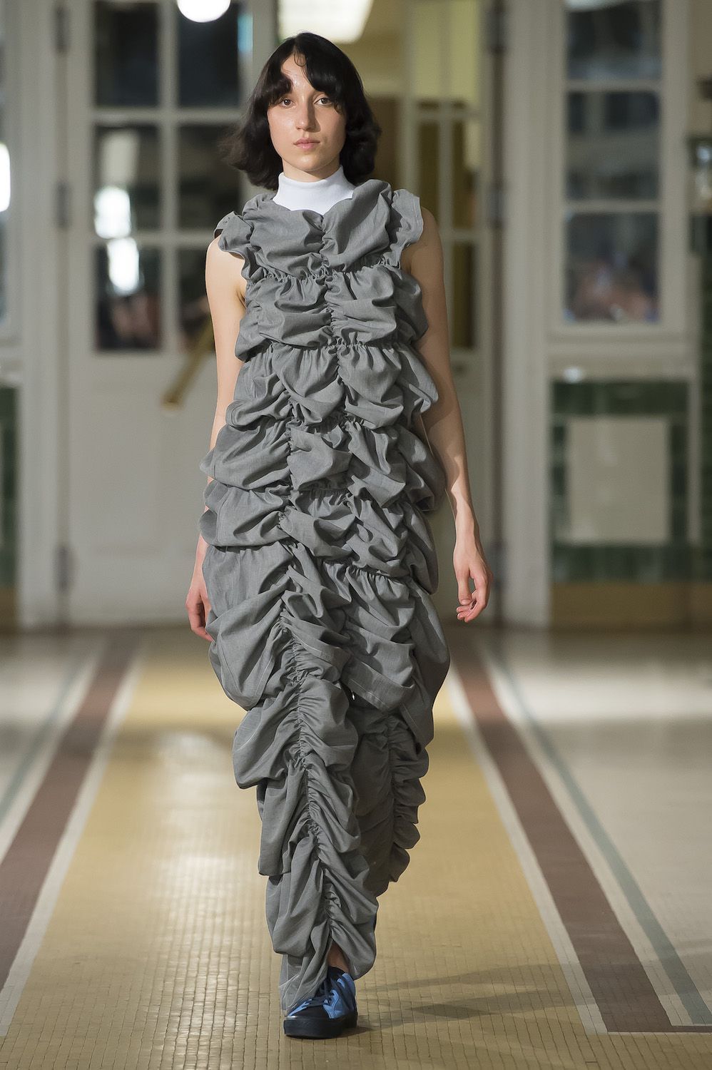 The result? A collection that abolishes the border of the genre and where each look is a one-off, independent from the previous and the next, a unique expression of a huge creative passion. Pants embellished with rouges, oversized pieces alternating with cropped garments and dresses shaped by drawstrings for an as harmonious as chaotic and wonderful mix between urban and sport style.